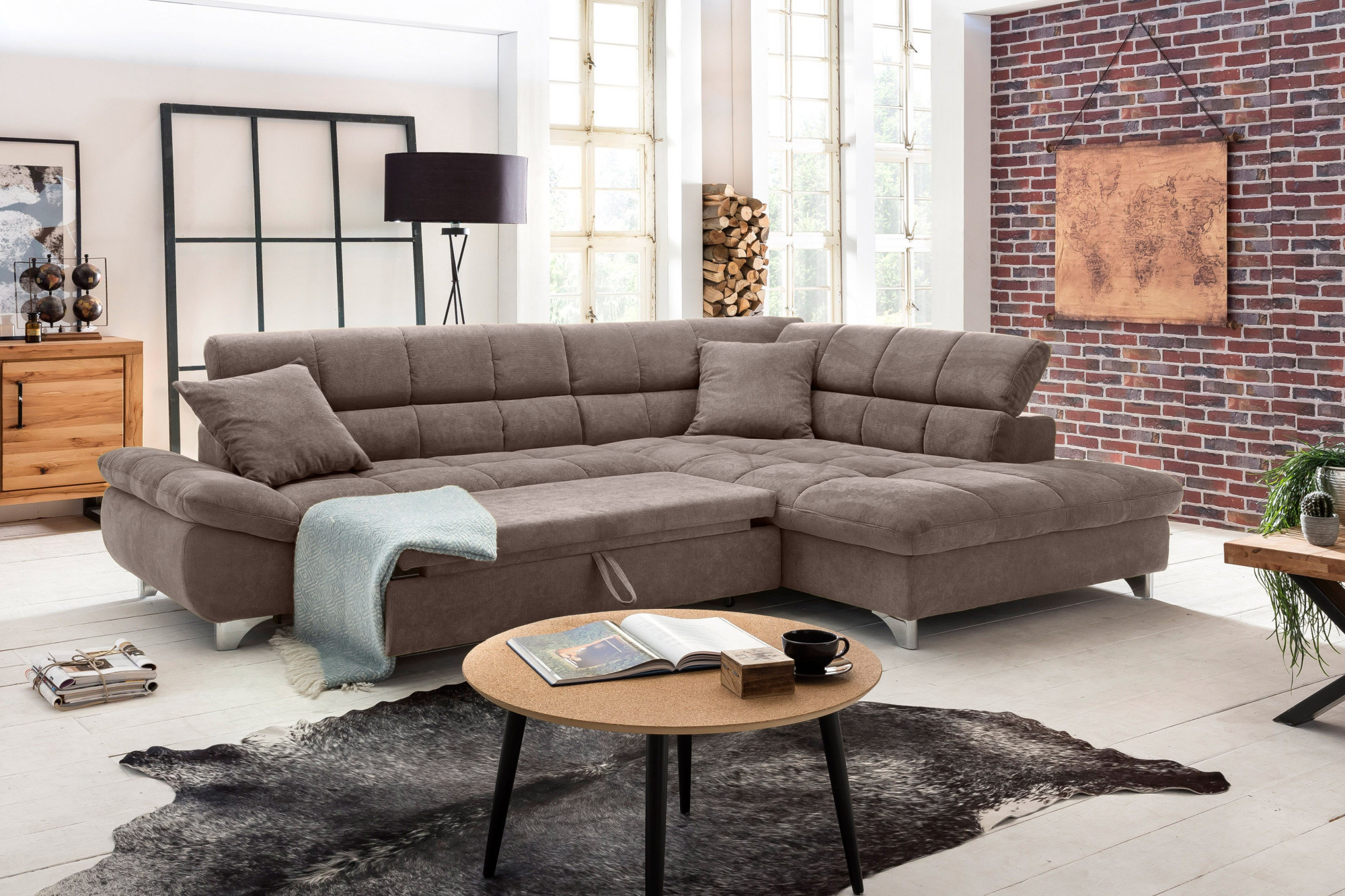 Eckcouchgarnitur mit Schlaffunktion Grau-Braun Holzrahmen