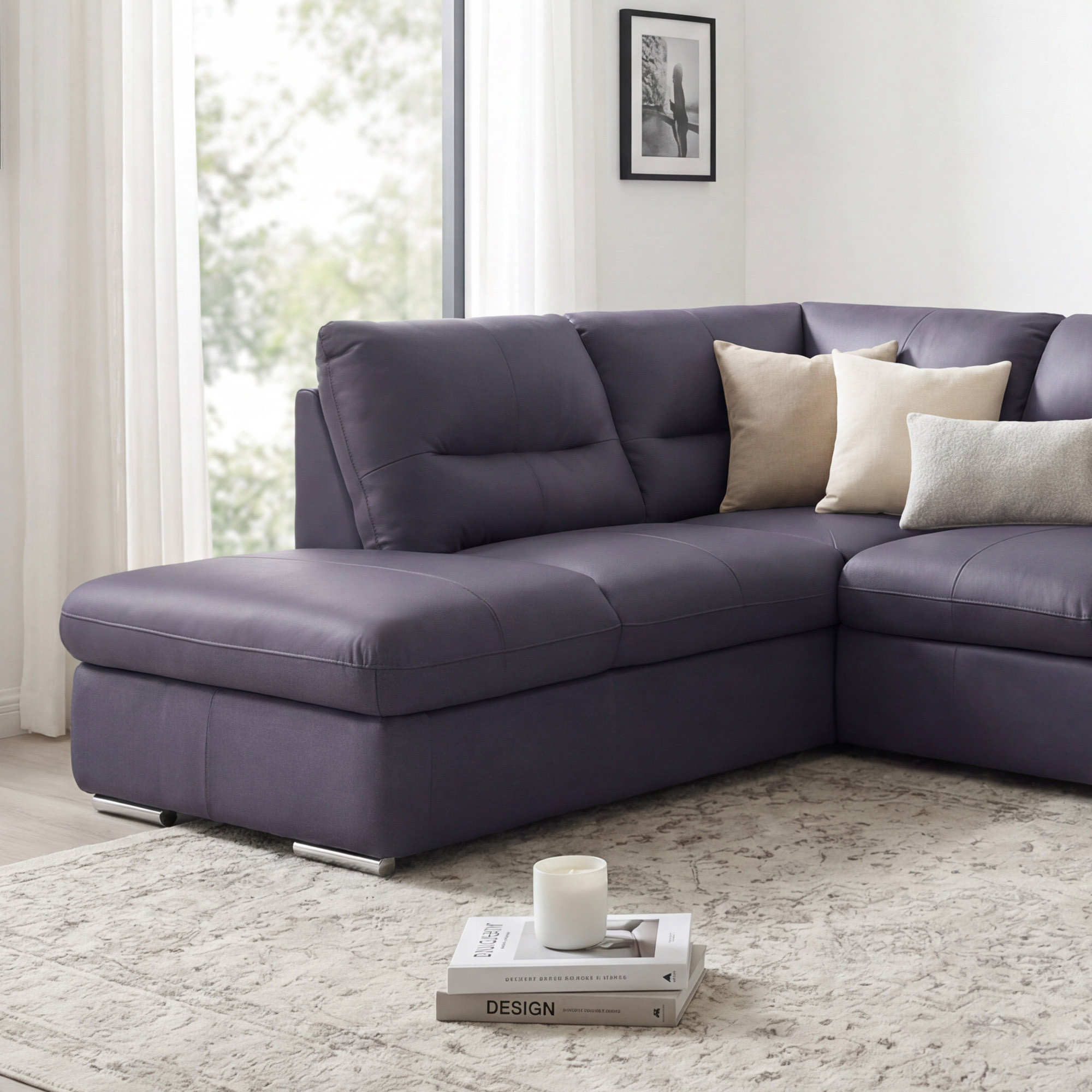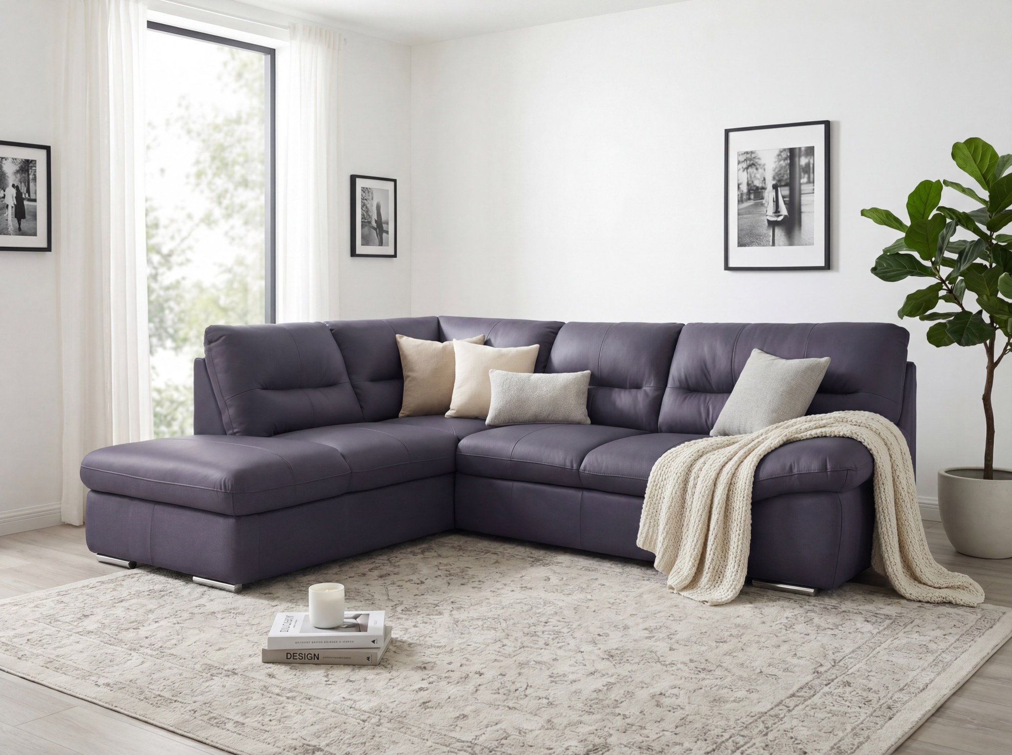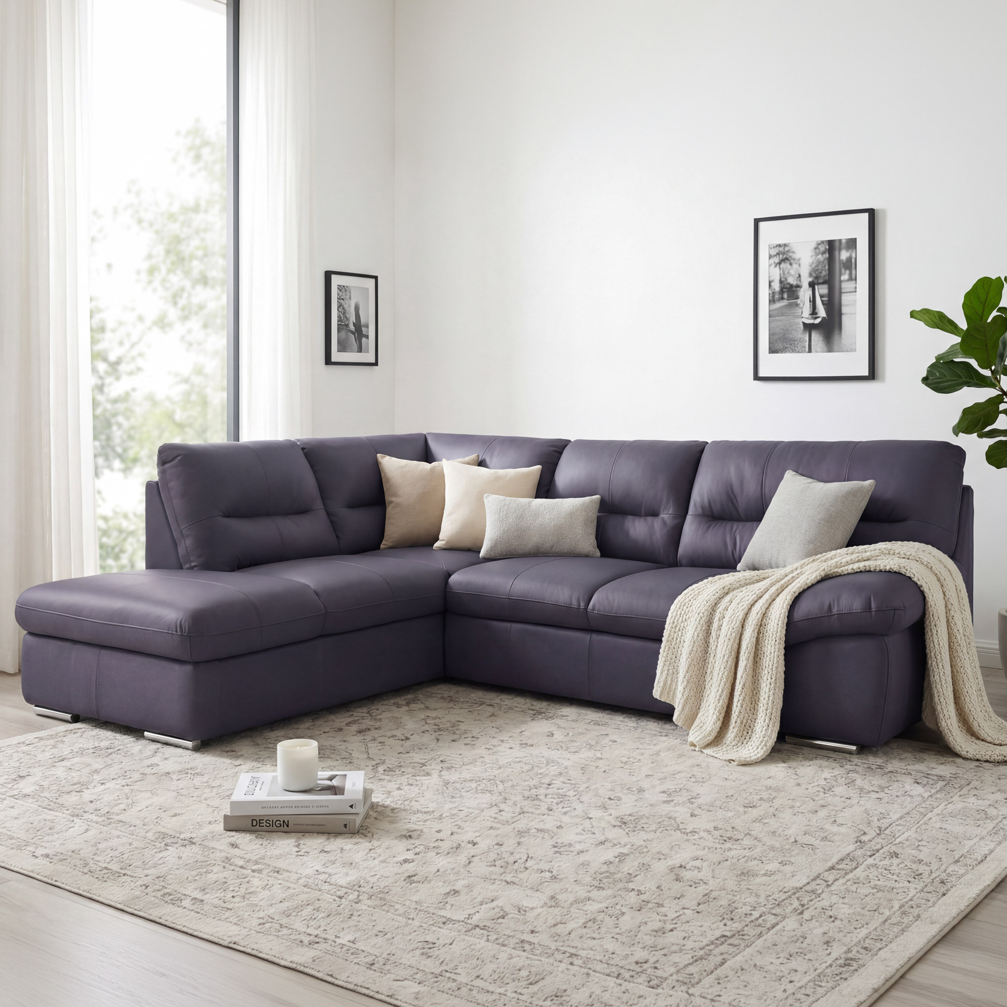 Ecksofa – echtes Leder Farbe Navy Modell William ist eine perfekte Wahl für alle, die Luxus, Komfort und praktische Funktionen schätzen. Sein elegantes Design in Navy-Farbe ergänzt jedes Interieur wunderschön und schafft gleichzeitig eine gemütliche Atmosphäre für Familien- und Gesellschaftstreffen. Der Sitzbereich ist mit hochwertigem Leder von 0,9–1,1 mm Stärke bezogen, das angenehm kräftig und widerstandsfähig gegenüber täglicher Beanspruchung ist. Durch die durchdachte Eckausführung (Ecke rechts) erhalten Sie nicht nur ausreichend Sitzfläche, sondern auch leichten Zugang zu einem großen Stauraum unter dem Eckelement. Zum Ausklappen des Sofas dient ein praktischer Mechanismus, der Ihnen ein Gelegenheitsbett mit den Maßen 183 x 123 cm bietet.
