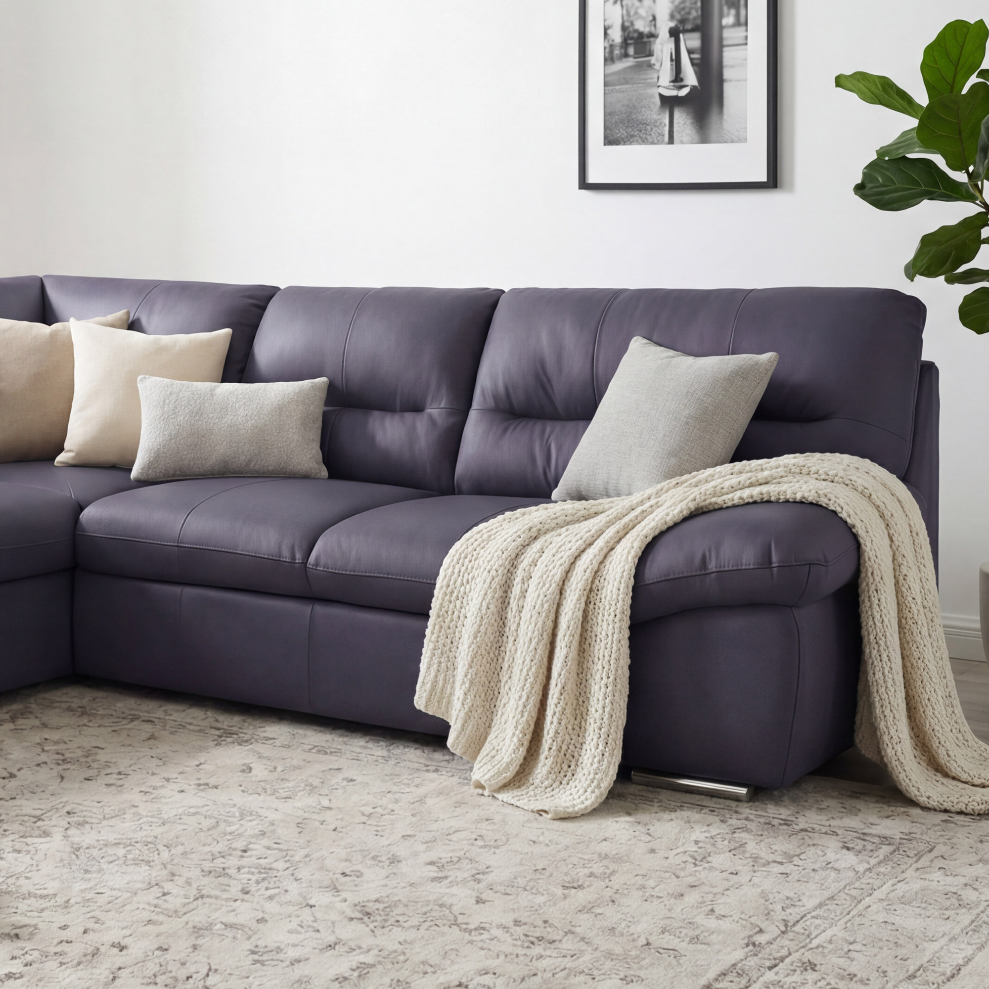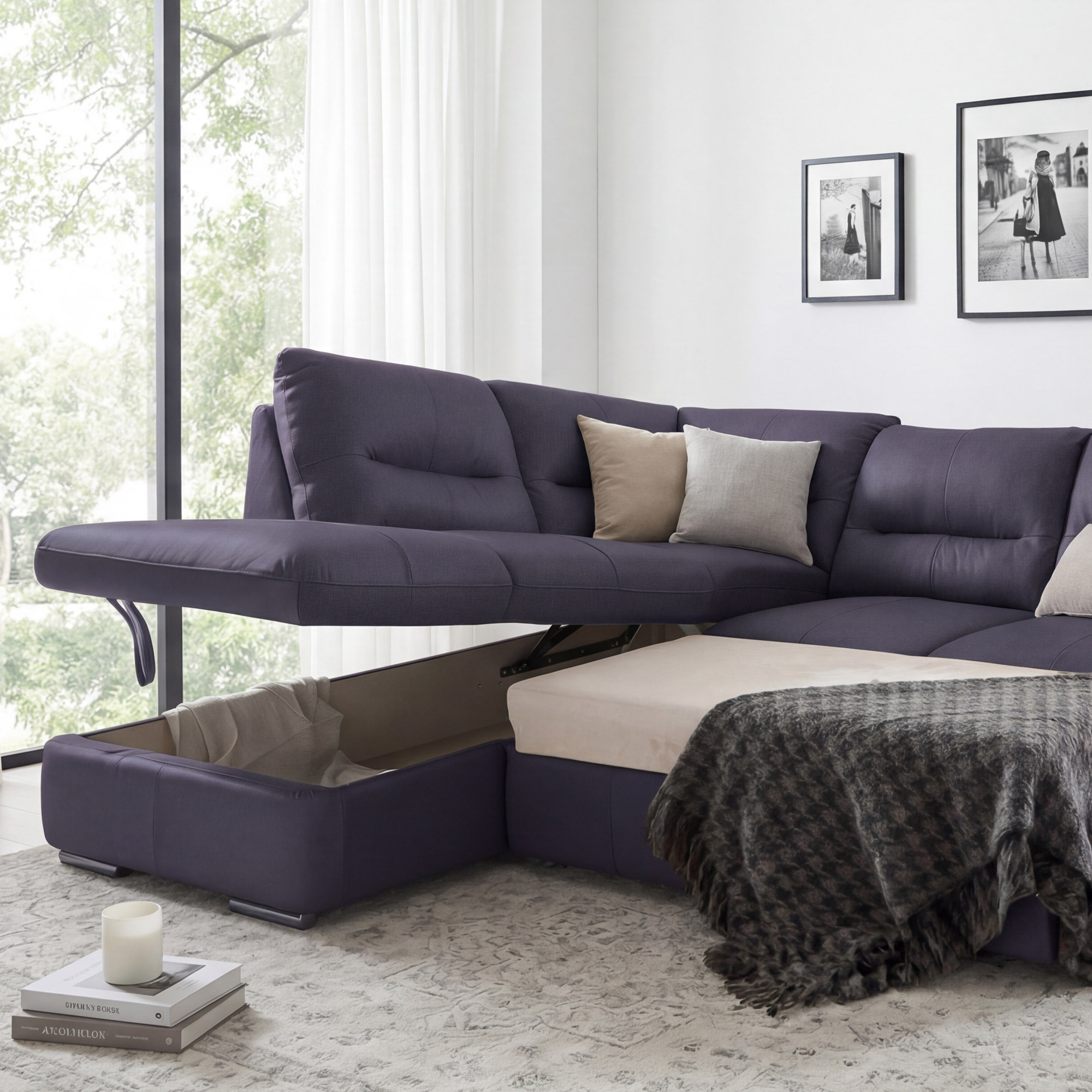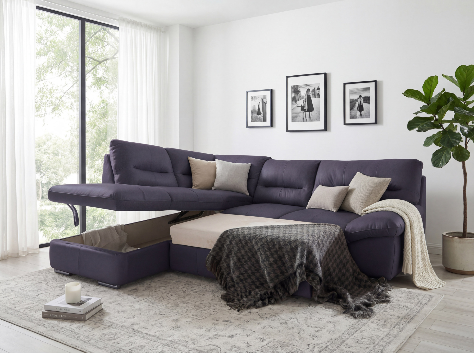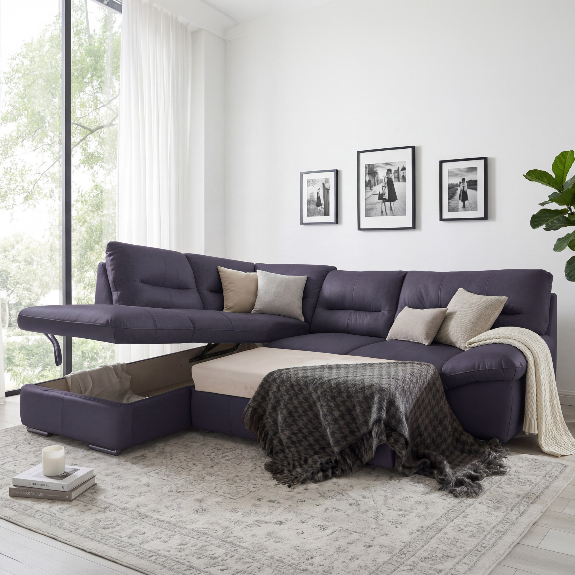 Ecksofa – echtes Leder Farbe Navy Modell William ist eine perfekte Wahl für alle, die Luxus, Komfort und praktische Funktionen schätzen. Sein elegantes Design in Navy-Farbe ergänzt jedes Interieur wunderschön und schafft gleichzeitig eine gemütliche Atmosphäre für Familien- und Gesellschaftstreffen. Der Sitzbereich ist mit hochwertigem Leder von 0,9–1,1 mm Stärke bezogen, das angenehm kräftig und widerstandsfähig gegenüber täglicher Beanspruchung ist. Durch die durchdachte Eckausführung (Ecke rechts) erhalten Sie nicht nur ausreichend Sitzfläche, sondern auch leichten Zugang zu einem großen Stauraum unter dem Eckelement. Zum Ausklappen des Sofas dient ein praktischer Mechanismus, der Ihnen ein Gelegenheitsbett mit den Maßen 183 x 123 cm bietet.