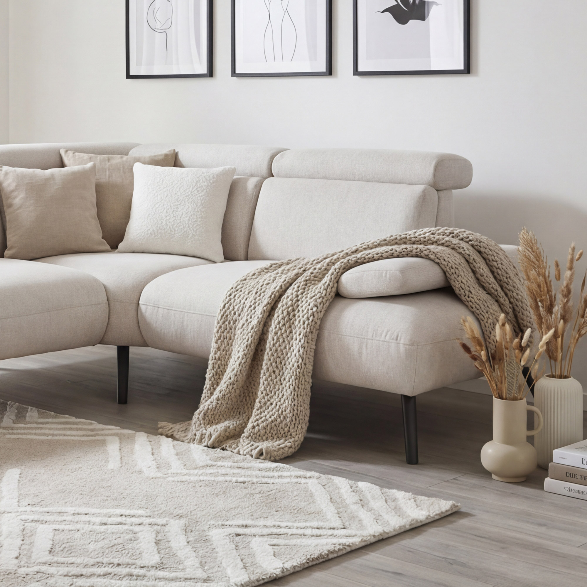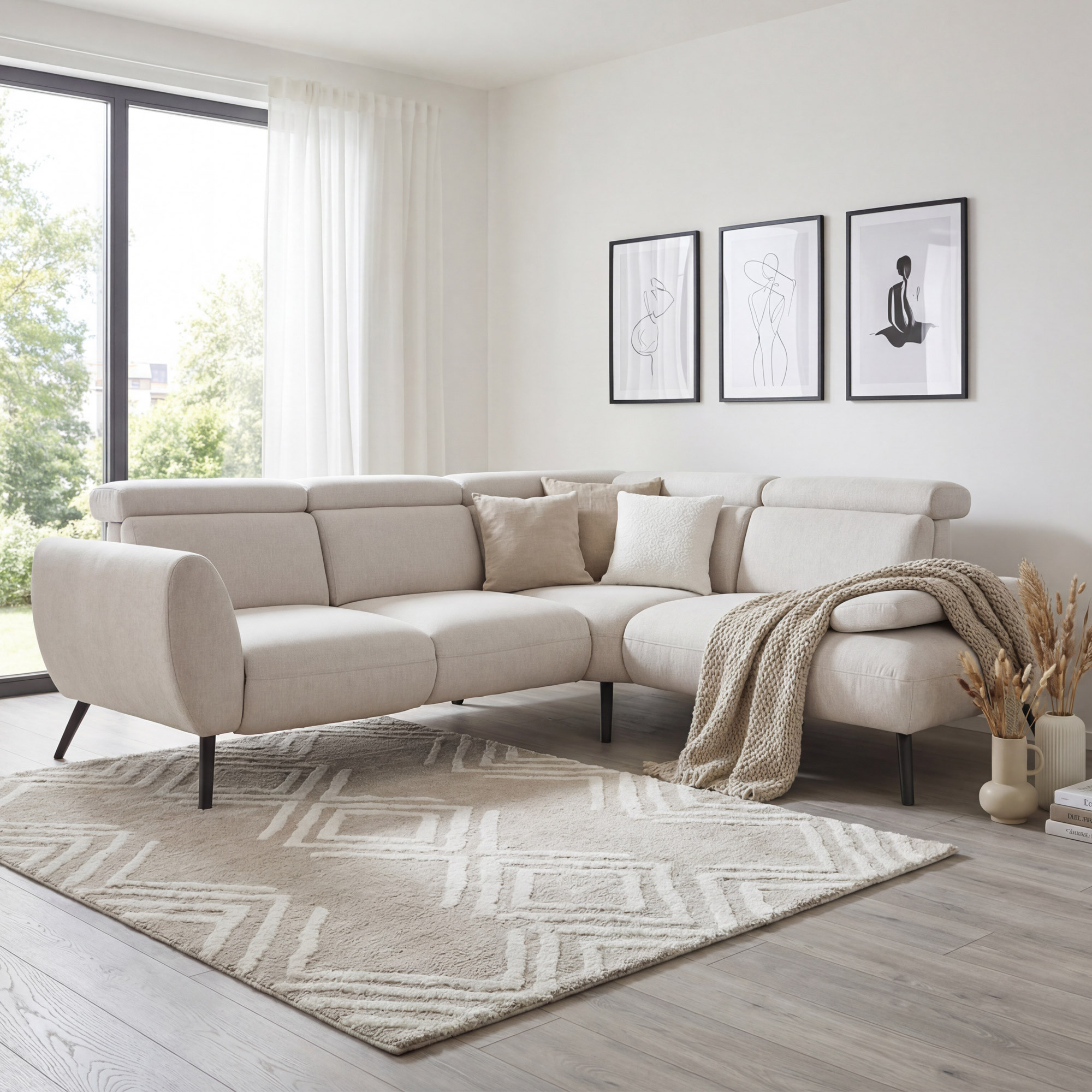 Die Sitzgarnitur CALAIS (299 × 236 cm) ist die ideale Wahl für diejenigen, die ein modernes Ecksofa suchen, das Design, Komfort und hochwertige Verarbeitung verbindet. Ihre schön abgerundeten Formen wirken weich und harmonisch, sodass das Sofa nicht robust, sondern leicht und luftig erscheint. Bereits auf den ersten Blick vermittelt es ein Gefühl von Weichheit, Ruhe und Zuhause. Die großzügigen Maße bieten ausreichend Platz für entspannte Momente im Alltag und gemeinsame Stunden mit der Familie.