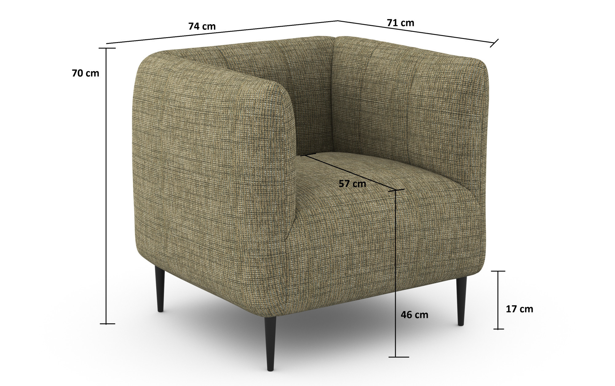 Der Rahmen besteht aus hartem Holz und Kiefer, ergänzt durch formaldehydfreie Spanplatte und hochwertigen PU-Schaum ohne FCKW. Der Sitz mit Stahlwellenfedern sorgt für lange Lebensdauer und komfortable Unterstützung, während die Rückenlehne mit Polsterplatte und statischen Riemen zur Stabilität beiträgt. Die Sitztiefe beträgt ca. 57 cm und die Sitzhöhe ca. 46 cm, was auch längeres Sitzen bequem macht. Die Maße des Stuhls sind ca. 71 × 74 × 70 cm (Tiefe × Breite × Höhe).