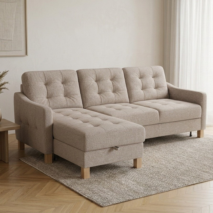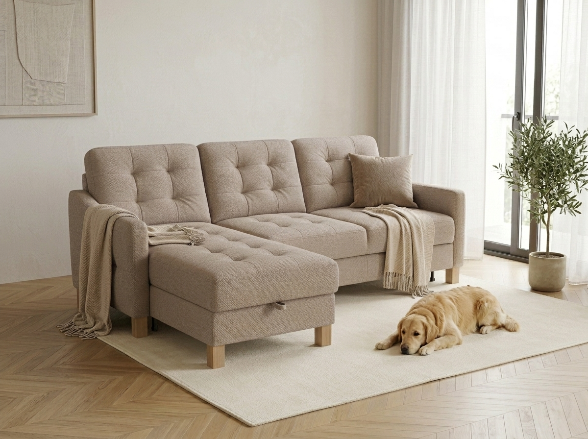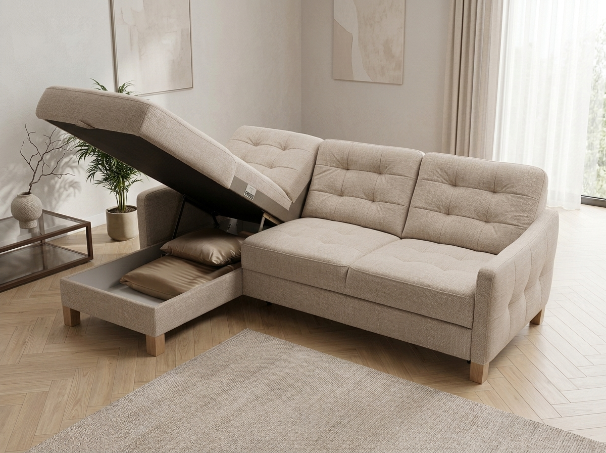 • Praktischer Stauraum in der Ecke der Couch