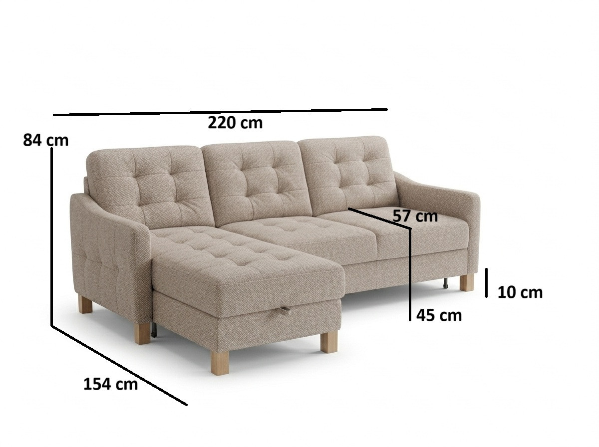 Maximalen Komfort bieten die Kombination aus Wellenfedern und hochelastischem Schaumstoff, die sowohl komfortables Sitzen als auch eine lange Lebensdauer gewährleisten. Ein praktischer Vorteil ist die Gelegenheits-Schlaffunktion mit einer Liegefläche von 124 × 194 cm sowie der Stauraum, der in der Ecke der Couch untergebracht ist. Stabilität und natürlicher Look werden durch Eichenfüße mit einer Höhe von 10 cm ergänzt, die in verschiedenen Farbtönen wählbar sind. Die Couch Malmo ist auch in einer größeren Eckausführung oder in einer U-Form erhältlich, was sie zur idealen Wahl für moderne und Familieninterieurs macht.