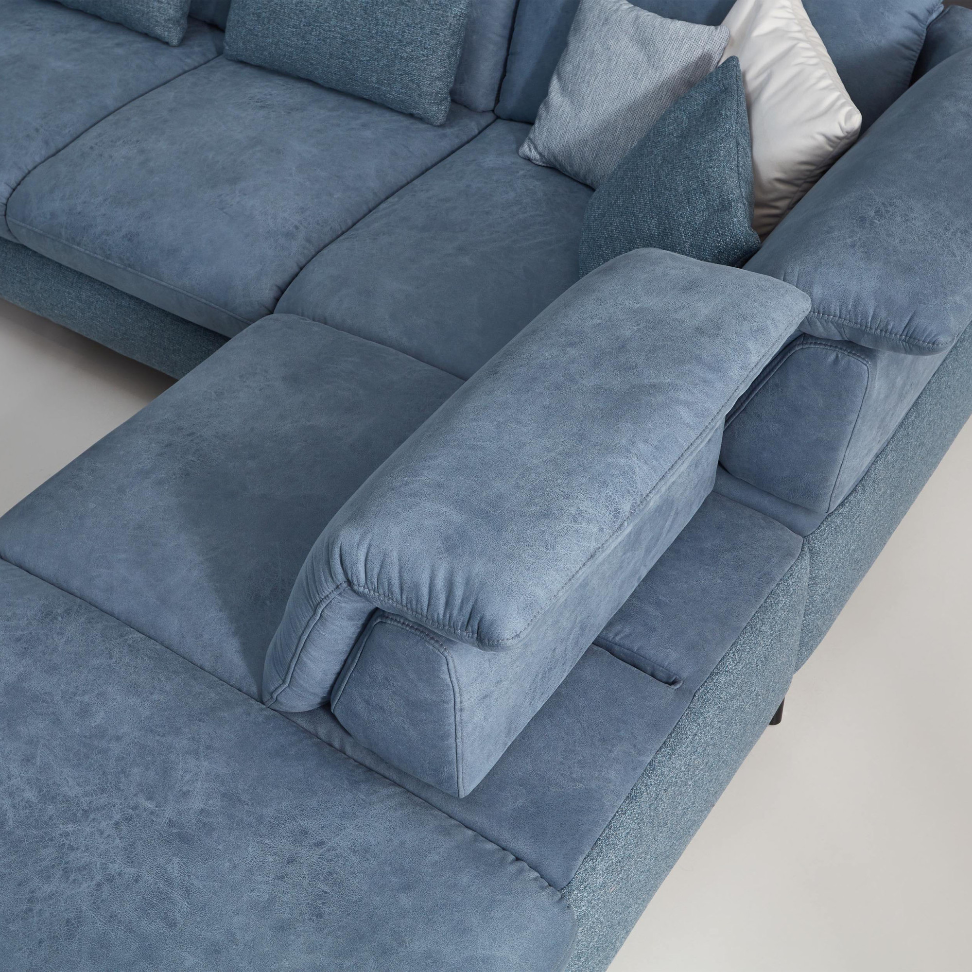 Das Basismodell bietet eine einstellbare Sitztiefe für maximalen Komfort, mit der Möglichkeit, viele weitere Funktionen gegen Aufpreis hinzuzufügen. Stellen Sie sich vor, Sie könnten Schlaffunktionen, Stauraum im Longchair oder Ottoman, verstellbare Rückenlehnen und Kopfstützen ergänzen. Zudem können Sie aus mehreren Fußtypen und Farben wählen, die sich nach Ihren persönlichen Vorlieben anpassen lassen, um perfekt in Ihr Interieur zu passen. Die Stoffversion der Sitzgarnitur kann zweifarbig sein, was einen einzigartigen und stilvollen Look ermöglicht.
