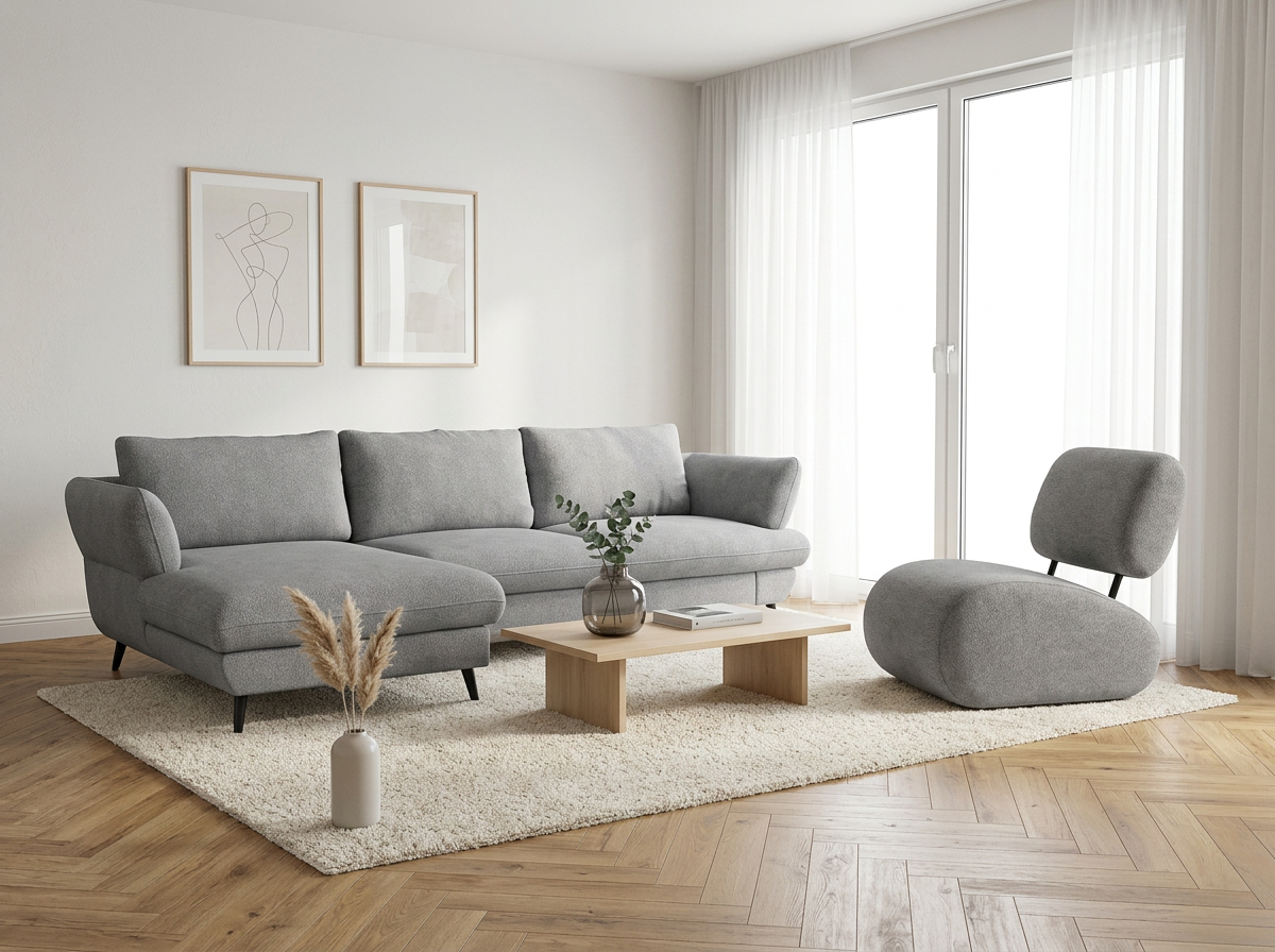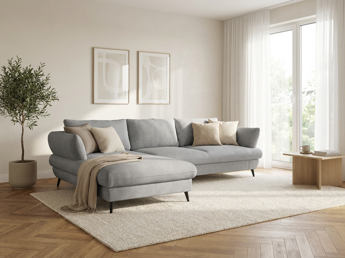 Das Sofa BALOU überzeugt auf den ersten Blick mit seinen modernen, abgerundeten Linien und dem zeitlosen Design, das perfekt in ein modernes Interieur passt. Das weiche, komfortable Sitzen werden Sie sowohl bei der täglichen Erholung als auch bei längeren gemeinsamen Stunden mit der Familie schätzen. Auf dem Foto ist die Ausführung im Stoff New York light grey zu sehen; dank durchdachter Konstruktion wirkt das Sofa elegant und zugleich stabil. Wenn Sie ein Ecksofa für das Wohnzimmer suchen, das leicht aussieht, aber den normalen Haushaltgebrauch problemlos meistert, ist BALOU eine ausgezeichnete Wahl.