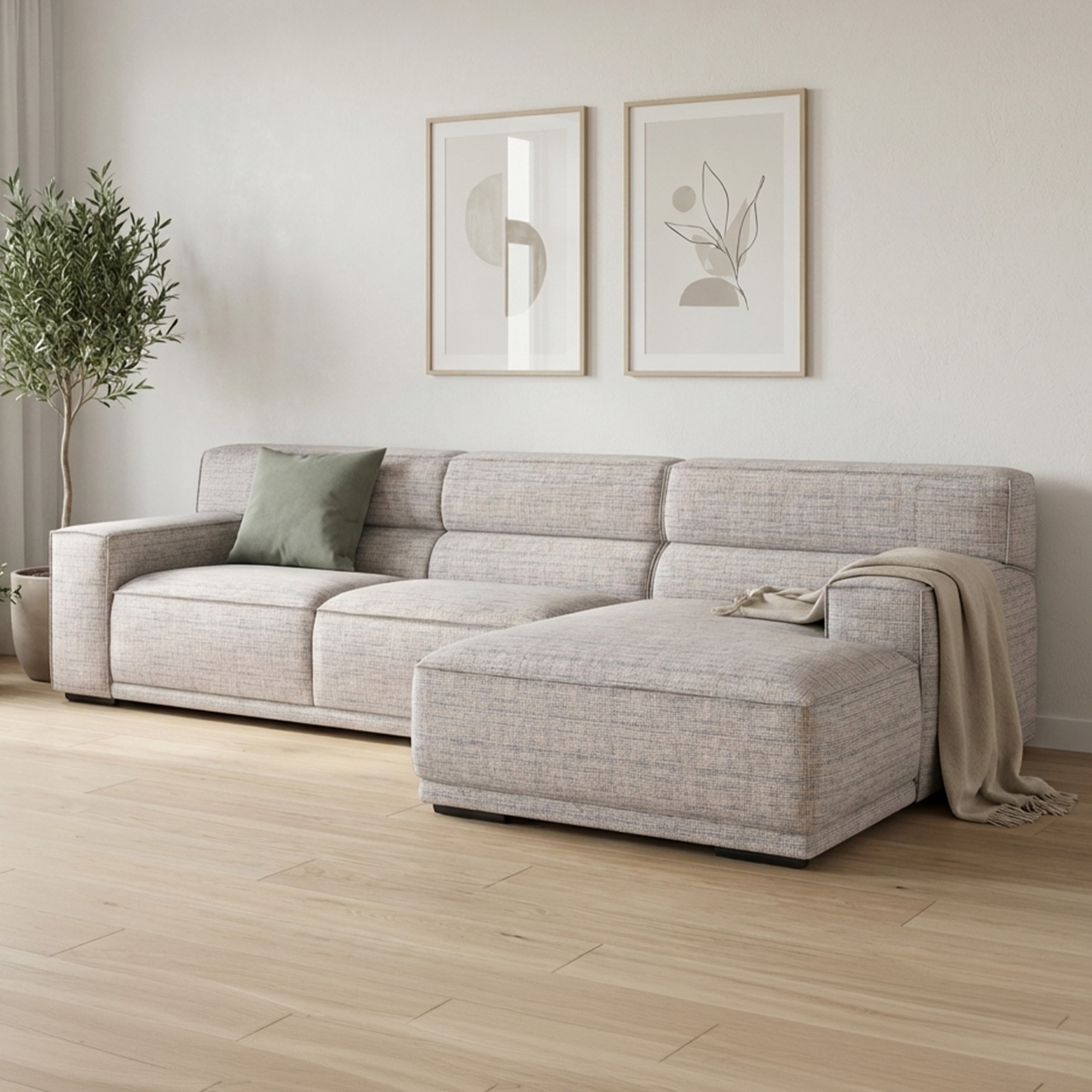 Das Ecksofa KUBO 3-REC ist die perfekte Verbindung von modernem Design, Komfort und hochwertiger Verarbeitung. Schon auf den ersten Blick besticht es durch klare Linien, ausgewogene Proportionen und eine angenehm strukturierte Polsterung in natürlichem Ton, die warm und gemütlich wirkt. Dank der Eckausführung mit praktischem Longchair bietet es viel Platz für die tägliche Entspannung, Familienzeit sowie bequemes Beisammensein mit Freunden. Dieses moderne Ecksofa wird zum Mittelpunkt Ihres Wohnzimmers und fügt sich gleichzeitig harmonisch in minimalistische sowie zeitgenössische Interieurs ein.