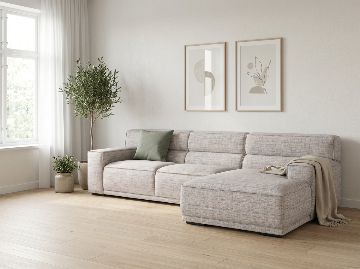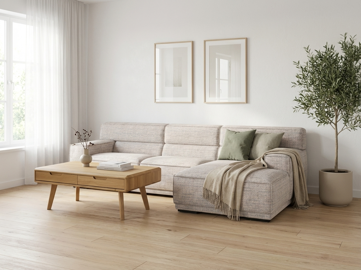 Modernes Ecksofa mit Longchair, naturfarbene Polsterung