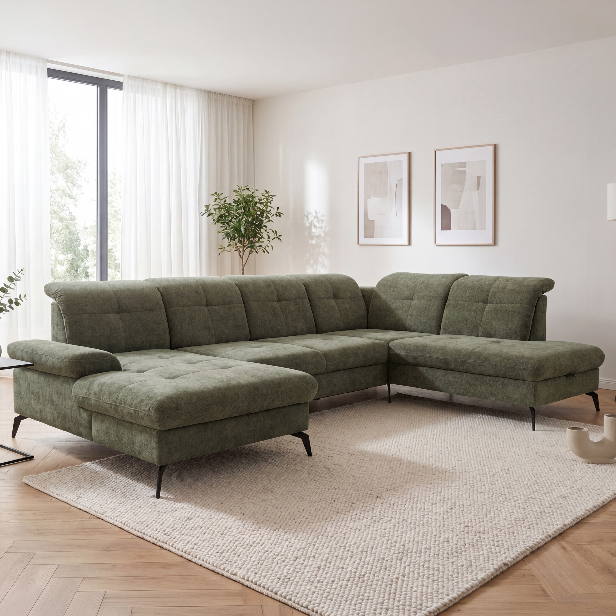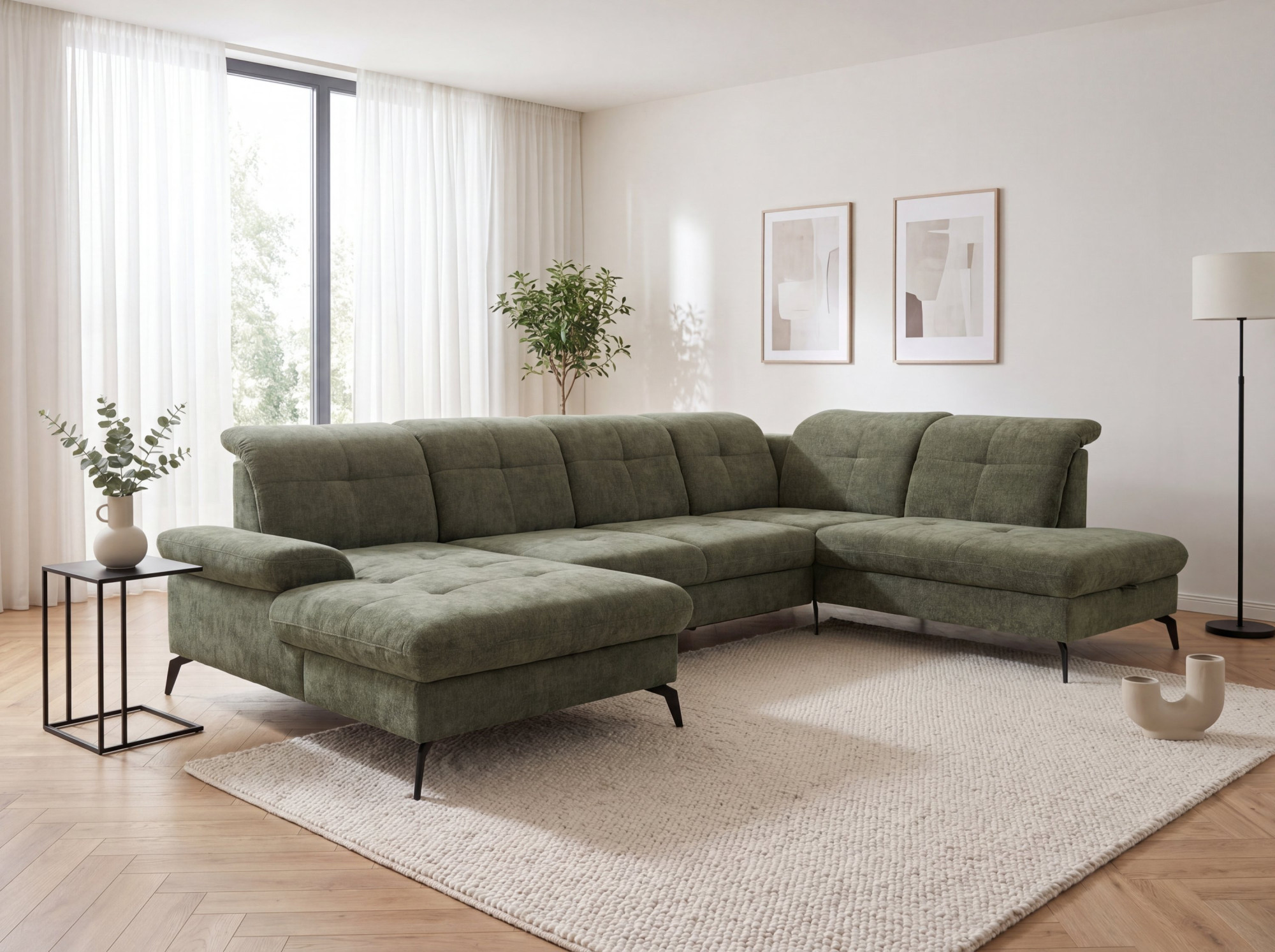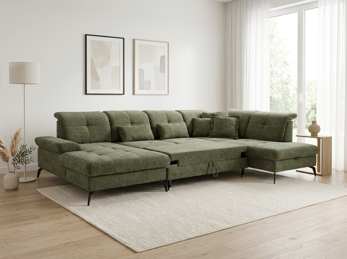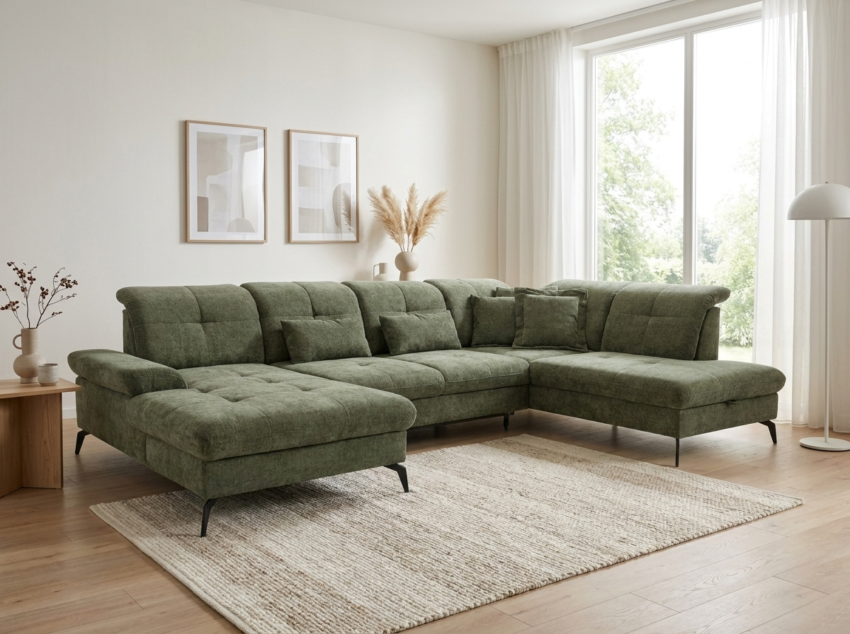 Suchen Sie eine großzügige Sitzgarnitur in U-Form, die hohen Komfort, modernes Design und die Möglichkeit zur individuellen Anpassung bietet? Die Sitzgarnitur Amica U mit den Maßen 185 × 360 × 234 cm ist die ideale Wahl für größere Wohnräume, Familienhaushalte und Interieurs, bei denen Wert auf Bequemlichkeit und repräsentatives Aussehen gelegt wird. Dieses moderne Sofa in U-Form besticht durch elegante Linien, luftiges Design und hochwertige Polsterung. Auf dem Foto ist es in dem Stoff Julia olive ausgeführt, der seinen zeitlosen Charakter unterstreicht und sich leicht mit weiteren Möbeln kombinieren lässt.
