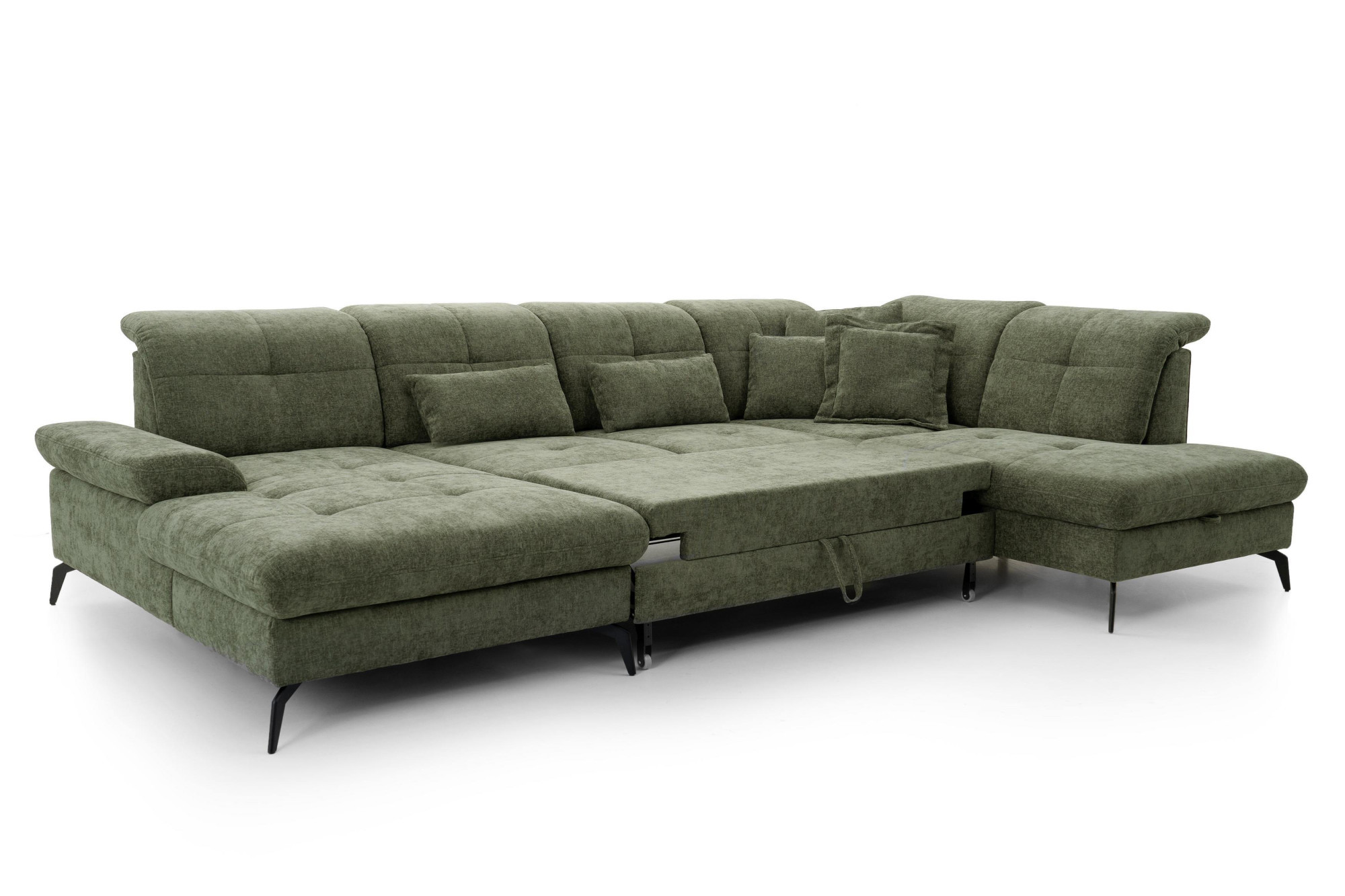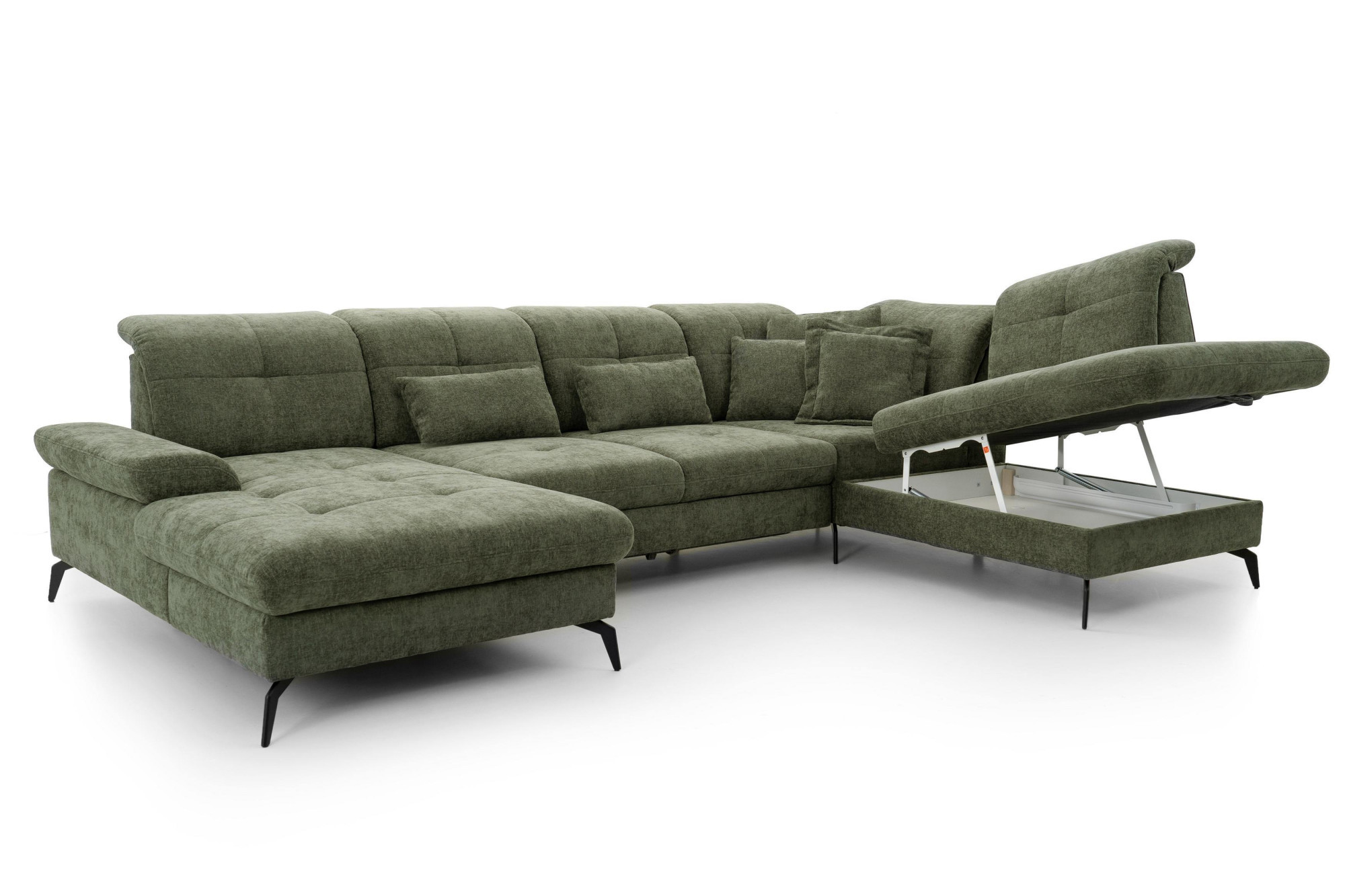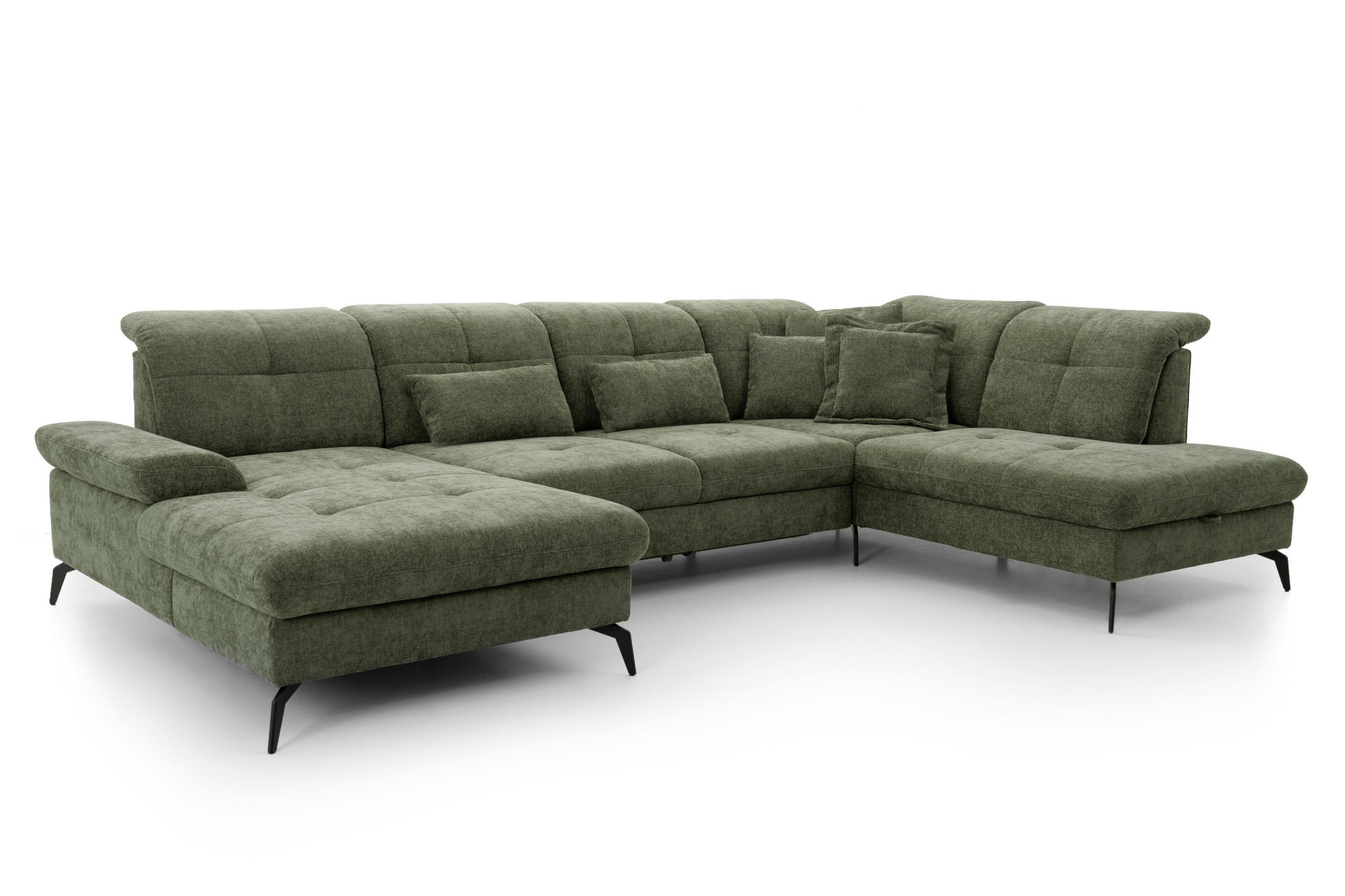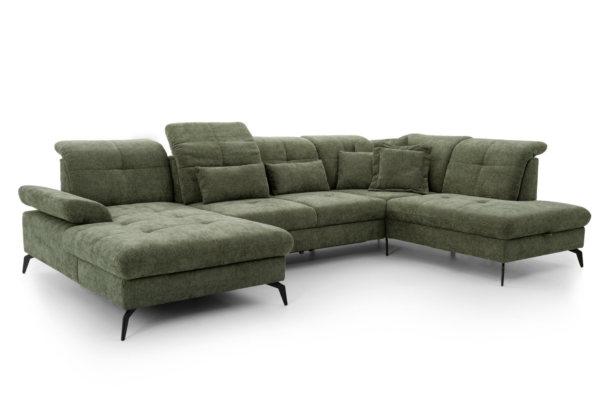 Suchen Sie eine großzügige Sitzgarnitur in U-Form, die hohen Komfort, modernes Design und die Möglichkeit zur individuellen Anpassung bietet? Die Sitzgarnitur Amica U mit den Maßen 185 × 360 × 234 cm ist die ideale Wahl für größere Wohnräume, Familienhaushalte und Interieurs, bei denen Wert auf Bequemlichkeit und repräsentatives Aussehen gelegt wird. Dieses moderne Sofa in U-Form besticht durch elegante Linien, luftiges Design und hochwertige Polsterung. Auf dem Foto ist es in dem Stoff Julia olive ausgeführt, der seinen zeitlosen Charakter unterstreicht und sich leicht mit weiteren Möbeln kombinieren lässt.