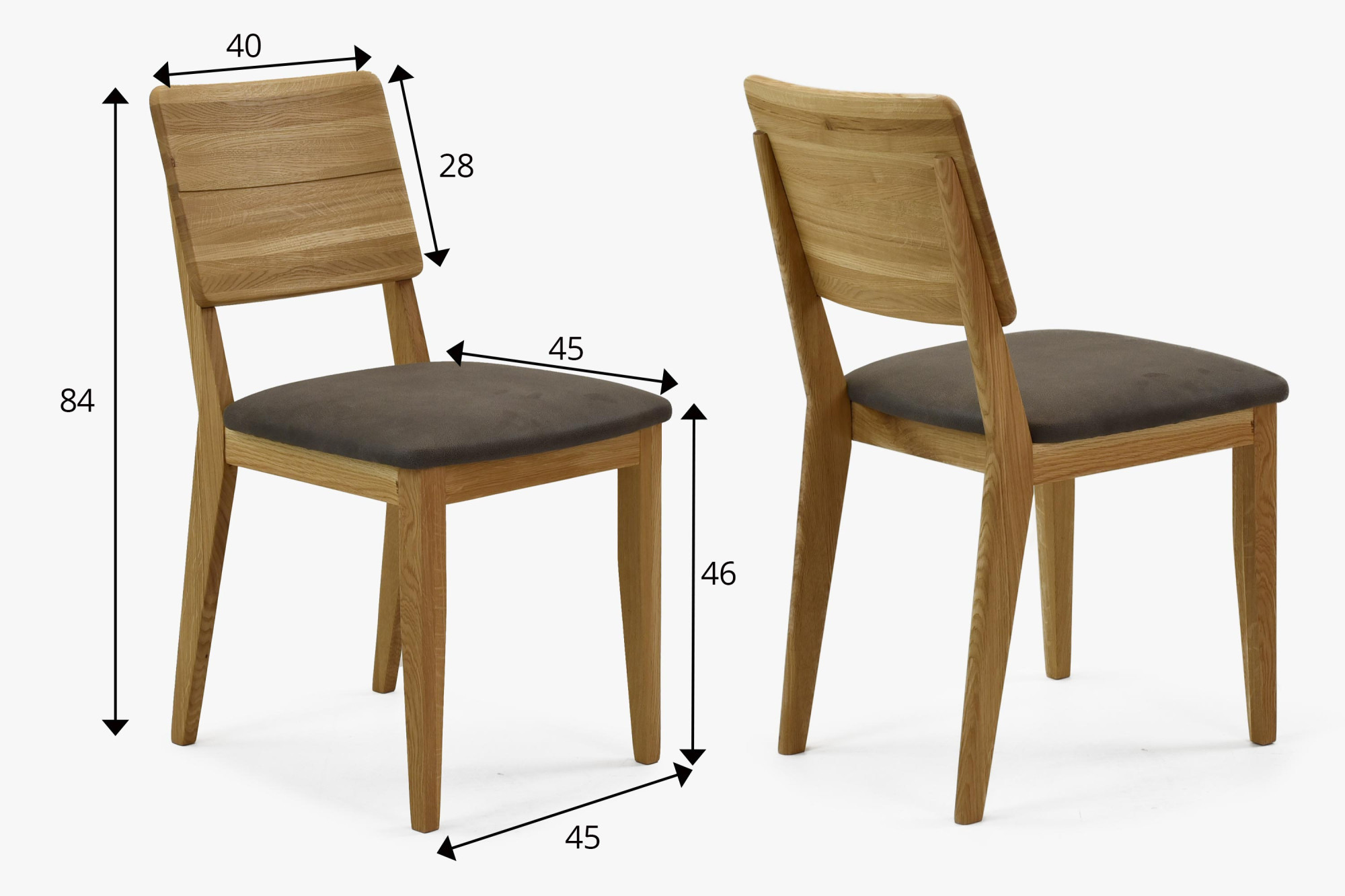 Moderne Eichenstühle Robo mit gepolstertem Sitz in Braun-Grau ergänzen den Esstisch perfekt. Die stabile Konstruktion aus massivem Eichenholz garantiert eine Tragfähigkeit von bis zu 120 kg und eine lange Lebensdauer. Der mit hochwertigem Stoff bezogene Sitz, der gebürstetes Leder imitiert, bietet maximalen Sitzkomfort. Die Stühle werden bereits voll montiert geliefert, der Tisch erfordert nur eine einfache Montage der Beine. Die gesamte Garnitur lässt sich problemlos mit weiteren Möbelstücken aus Eichenholz kombinieren und passt sowohl in moderne als auch klassische Interieurs.