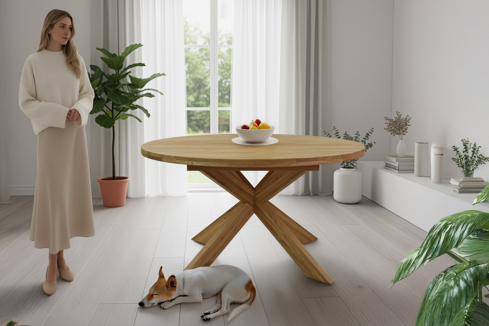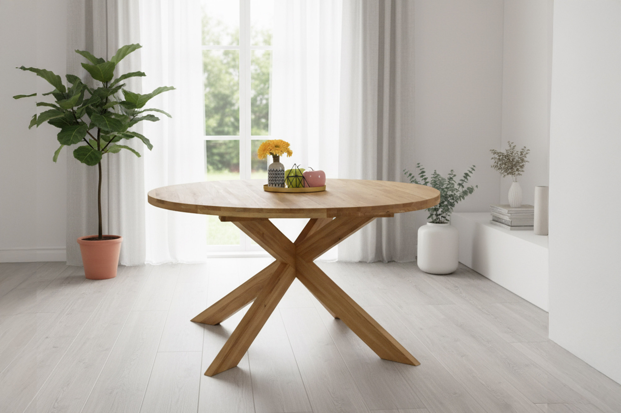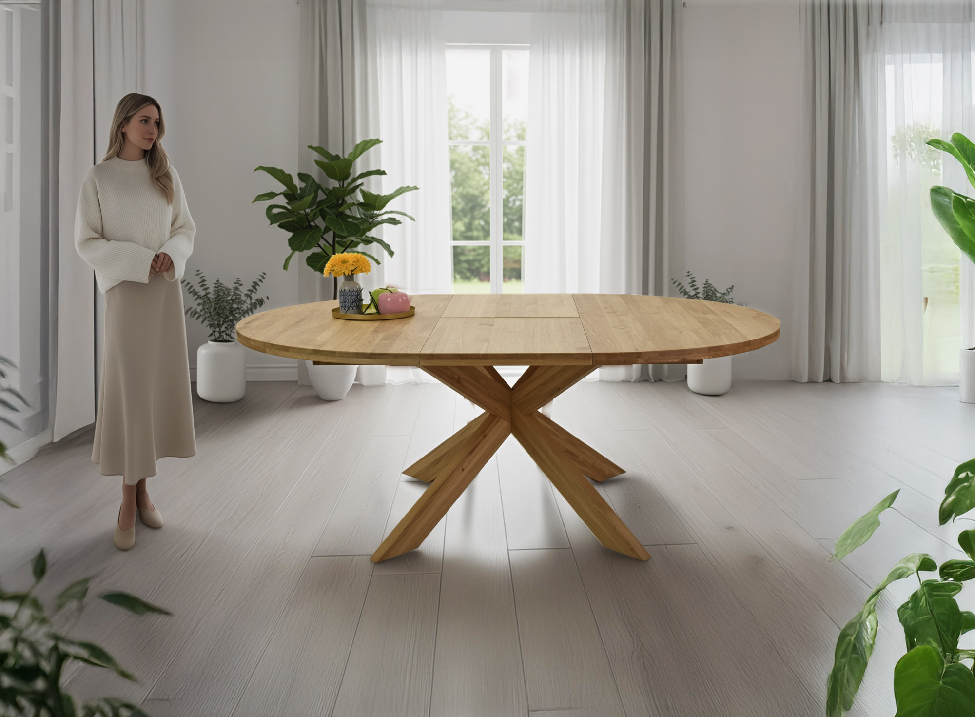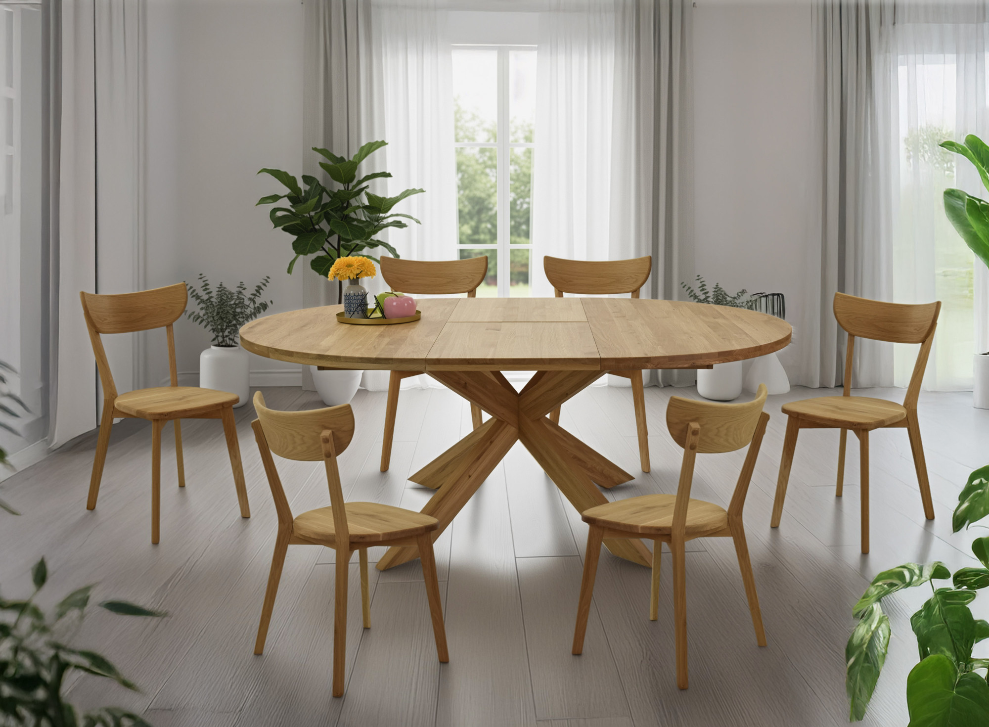 Wenn Sie eine Kombination aus Praktikabilität, Eleganz und natürlichem Stil suchen, ist der runde ausziehbare Tisch und 4 Stühle aus Holz die ideale Wahl für Sie. Dieses Esszimmer-Set besteht aus echtem Eichenmassivholz, das Langlebigkeit, Stabilität und ein natürliches Aussehen garantiert. Das Eichholz ist zudem mit umweltfreundlichem Bormo Wachs-Öl behandelt, das die natürliche Struktur und Farbe des Holzes bewahrt und gleichzeitig die Pflege erleichtert. Der Tisch hat einen Basisdurchmesser von 120 cm, nach dem Ausziehen erhalten Sie eine Fläche von bis zu 170 cm, was Sie bei größeren Familienfeiern oder Besuch von Freunden zu schätzen wissen. Der Ausziehmechanismus ist leicht zu bedienen und die zusätzliche Tischplatte findet im Inneren des Tisches ihren Platz.
