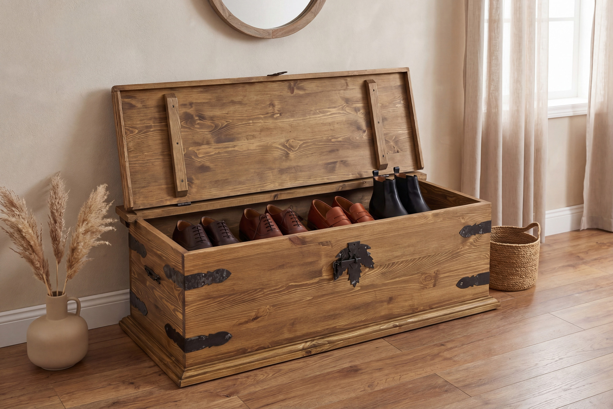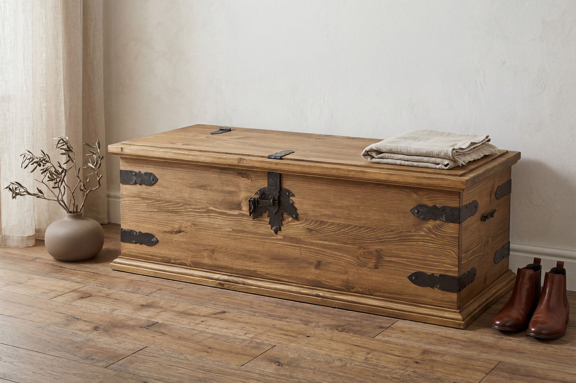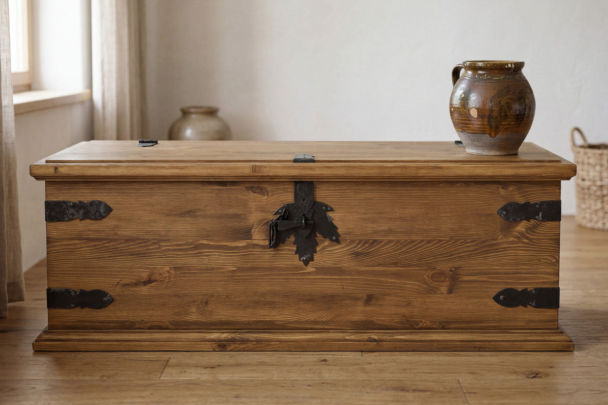 Die Truhe besteht aus hochwertigem Kiefernholz, das für seine Stabilität, natürliche Optik und Langlebigkeit geschätzt wird.