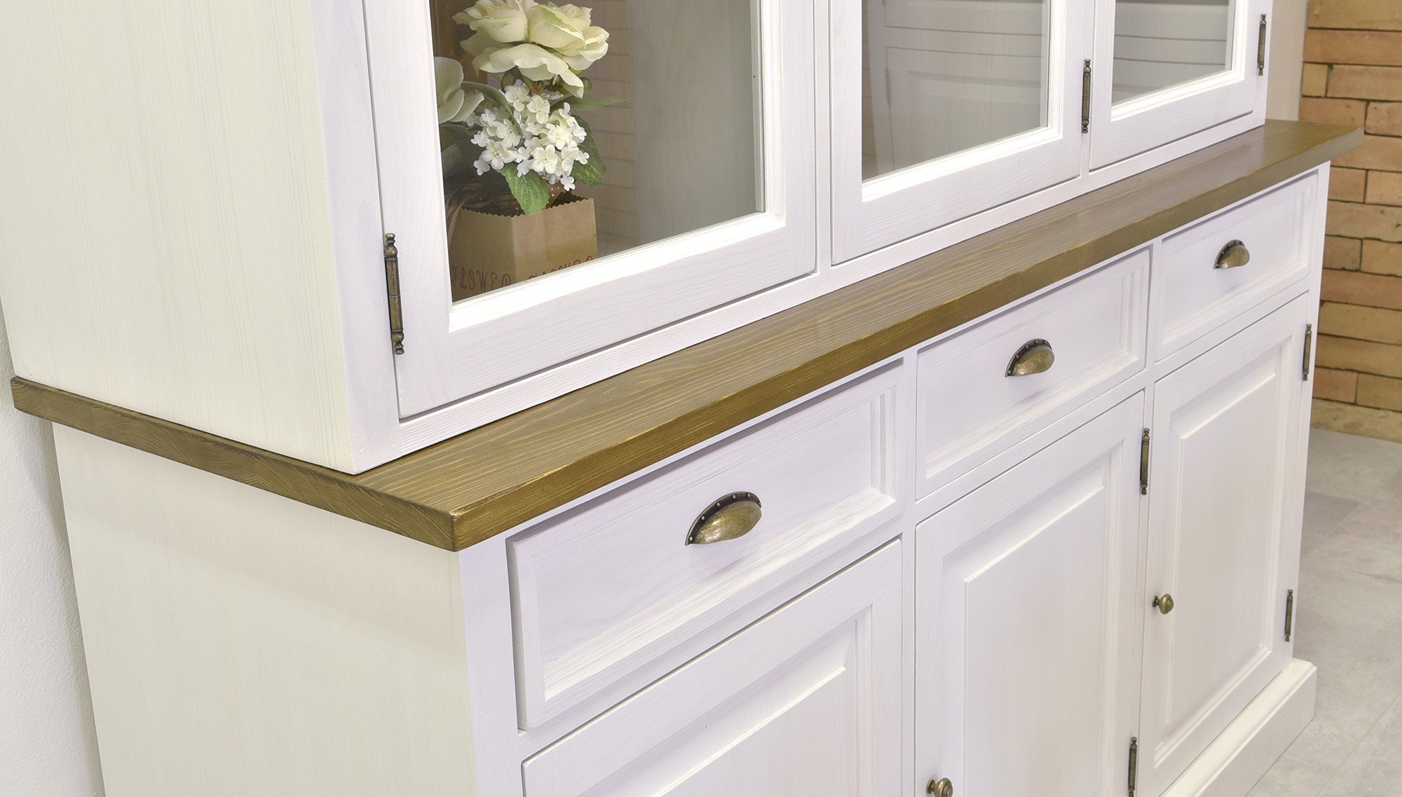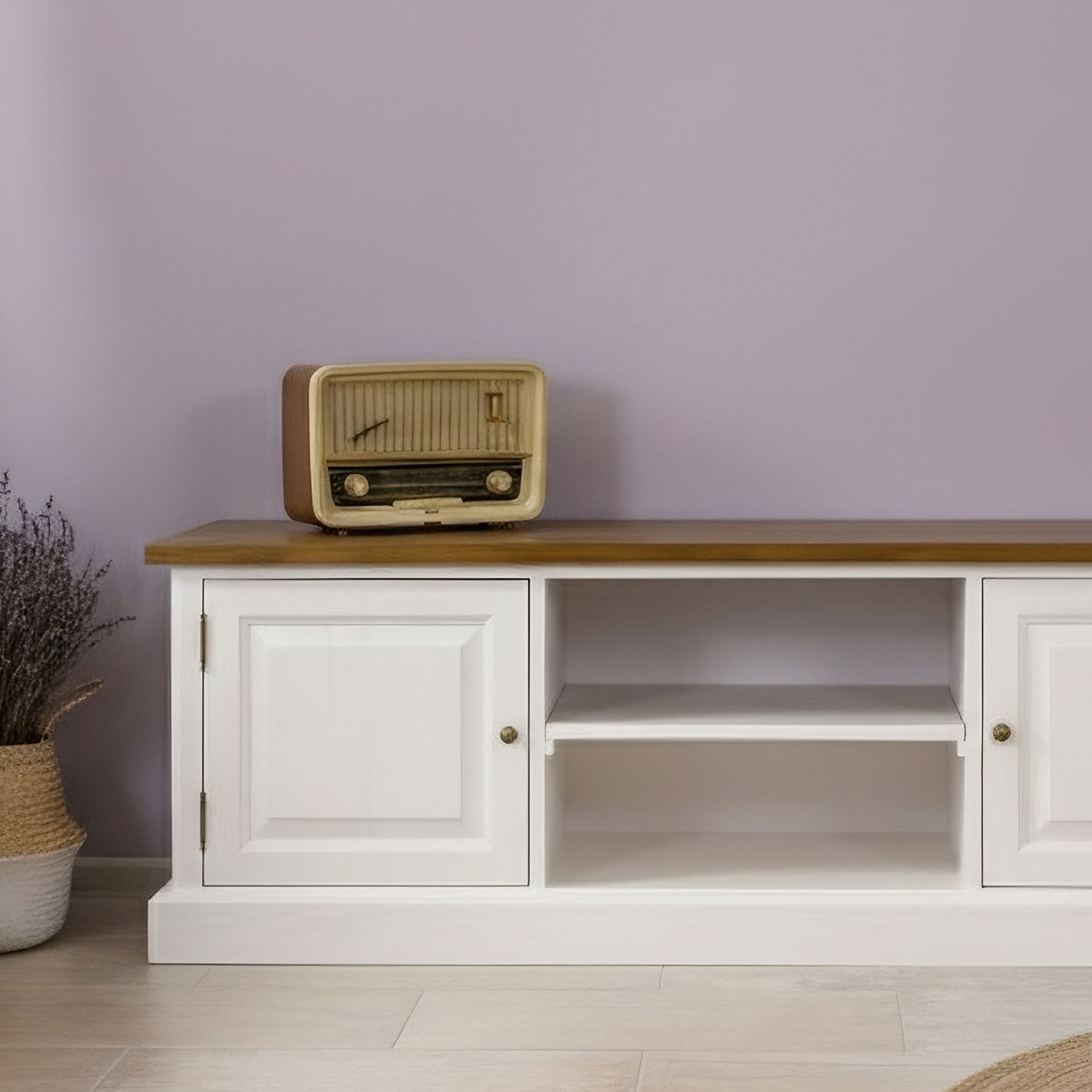 Holz-TV-Kommode im provenzalischen Stil ist ein praktisches und elegantes Accessoire für Ihr Wohnzimmer. Sie wird aus 100% massivem Kiefernholz gefertigt, das Stabilität, Festigkeit und lange Lebensdauer garantiert. Die Tischplatte ist mit hochwertigem Lack behandelt, der sie vor täglichem Verschleiß und Flüssigkeiten schützt, während der weiße Teil mit umweltfreundlicher und gesundheitlich unbedenklicher Farbe oberflächenbehandelt ist. Durch diese Kombination entsteht ein angenehmer Kontrast aus Weiß und Braun, der dem Interieur einen rustikalen Charme verleiht. Die Kommode wird bereits komplett montiert geliefert und ist somit sofort einsatzbereit.