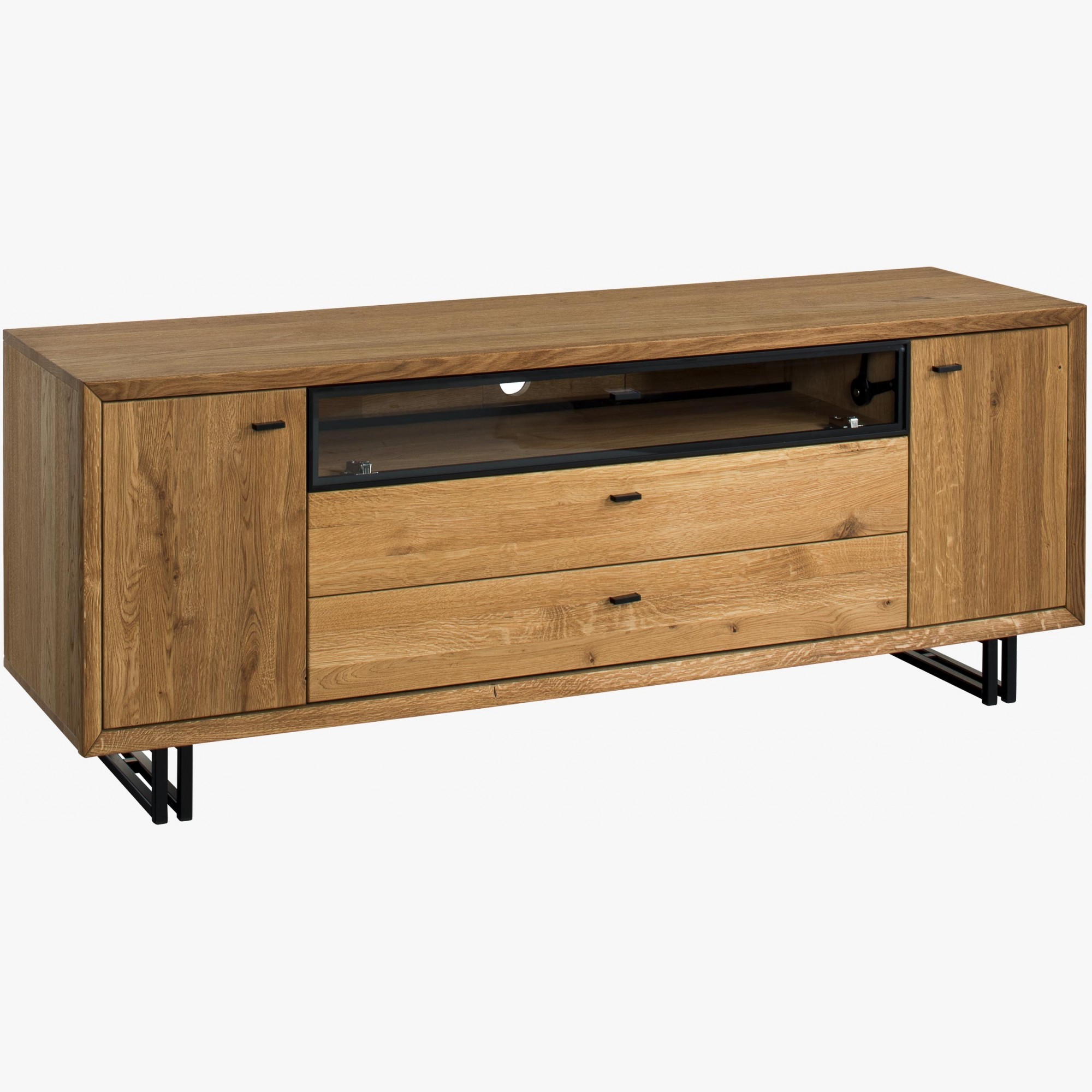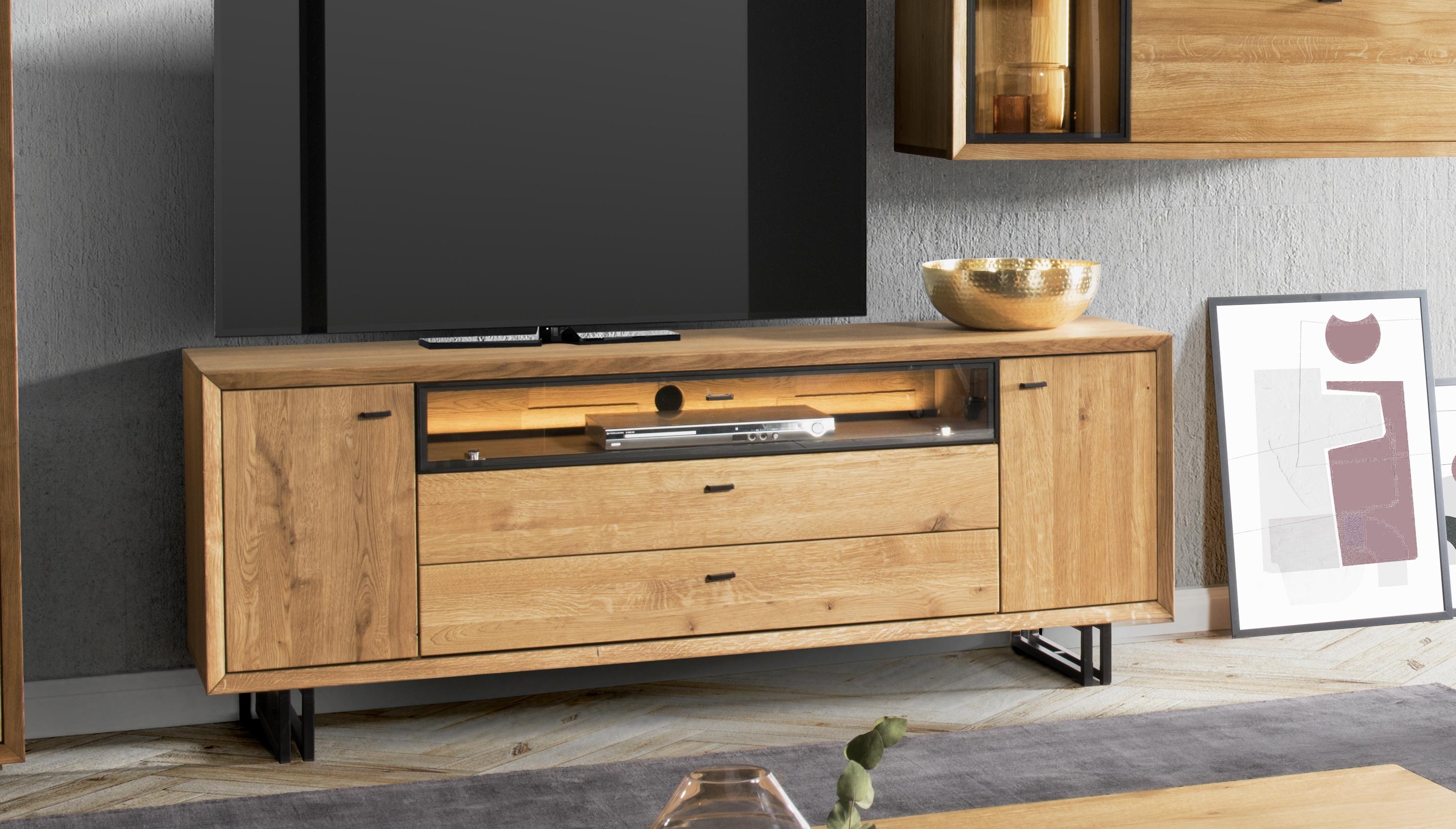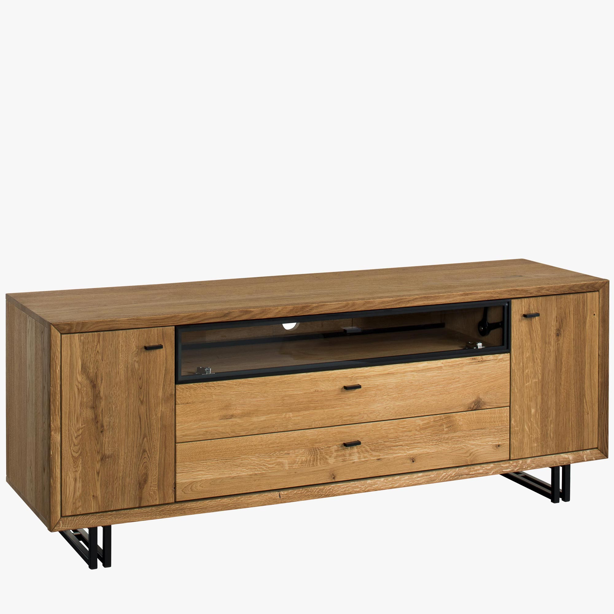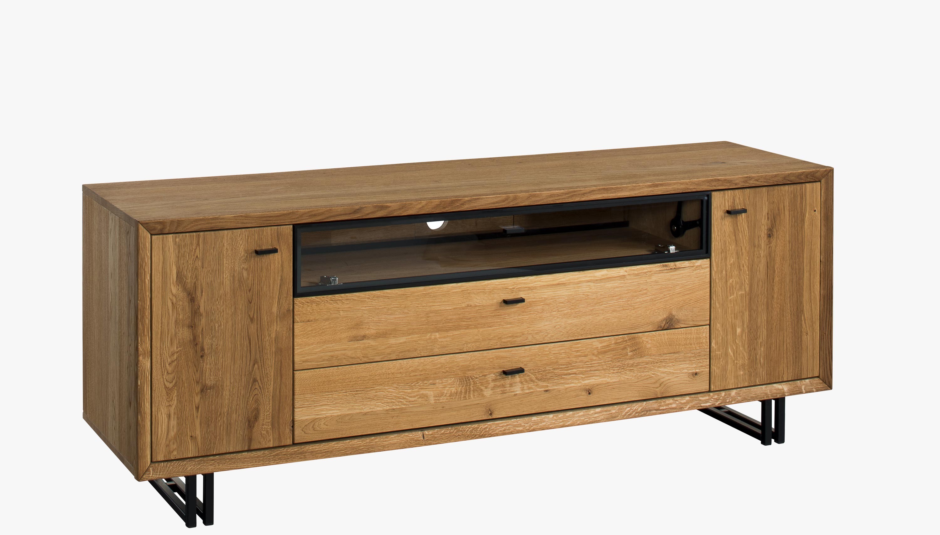 Fernsehkommode im wunderschönen, leicht industriellen Stil mit modernem, zeitlosem Design. Die TV-Kommode ist aus der Möbelkollektion Vilo, einer Neuheit, die im Herbst 2020 vorgestellt wurde. Die TV-Kommode wird bereits montiert in Premiumqualität geliefert. Die Kommode hat 2 Öffnungstüren, im Inneren befindet sich ein Einlegeboden, in der mittleren Abteilung ist ein großer offener Raum, der mit gläsernen Türen verschlossen ist und auf der Rückseite eine Kabeldurchführung hat. Darunter befinden sich 2 große Schubladen. Die Beschläge und die Ausstattung sind mit leisem Soft-Close. Die Vorderseite der Kommode ist Eichenholz, mit einer einzigartigen Struktur des natürlichen Holzcharakters und einer fein strukturierten Oberfläche. Der Rest des Möbelstücks ist natürliche Eichenfurnier höchster Qualität.