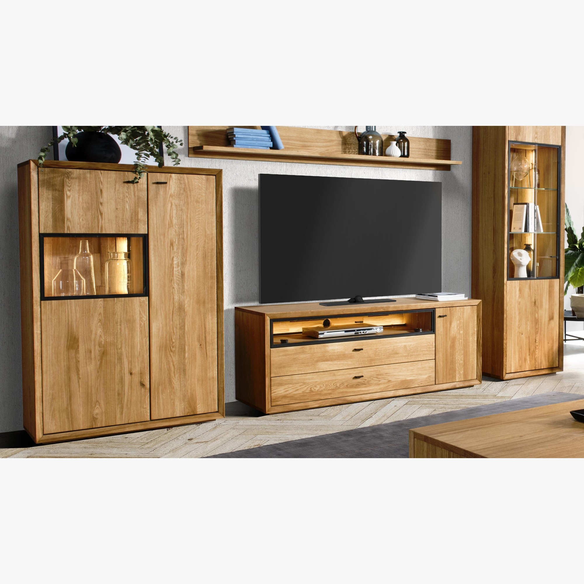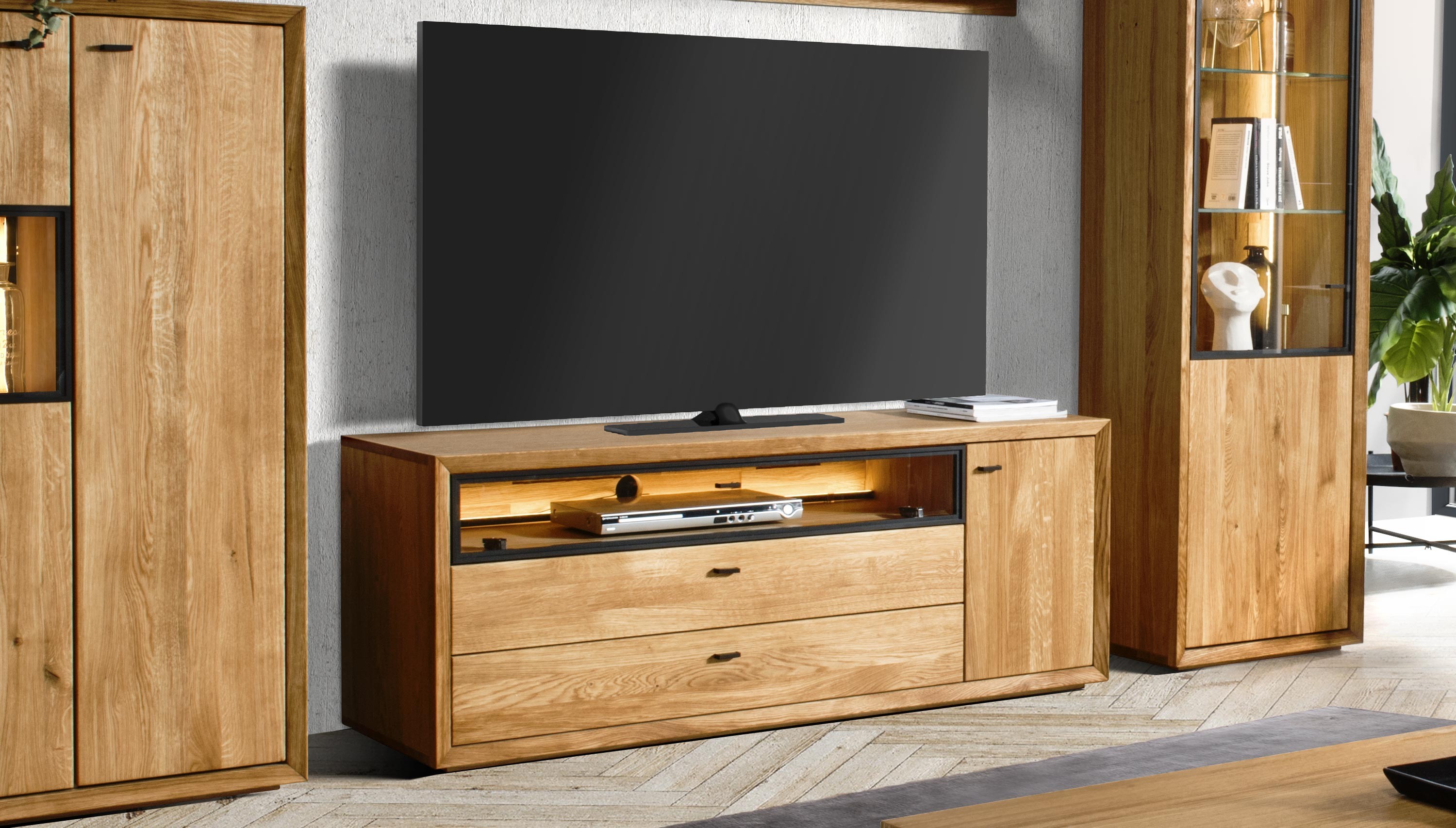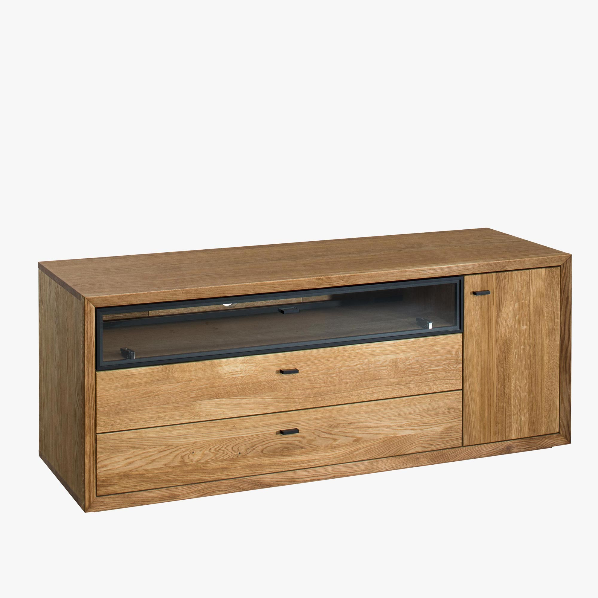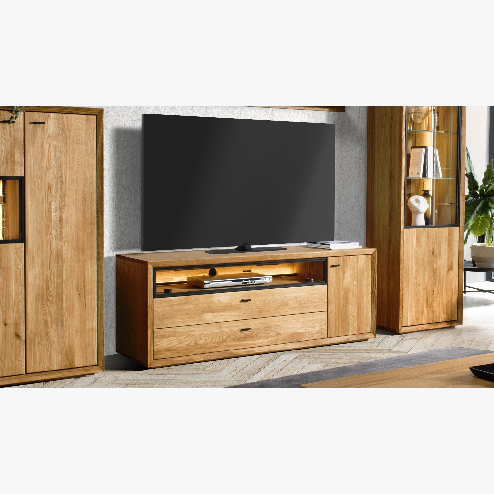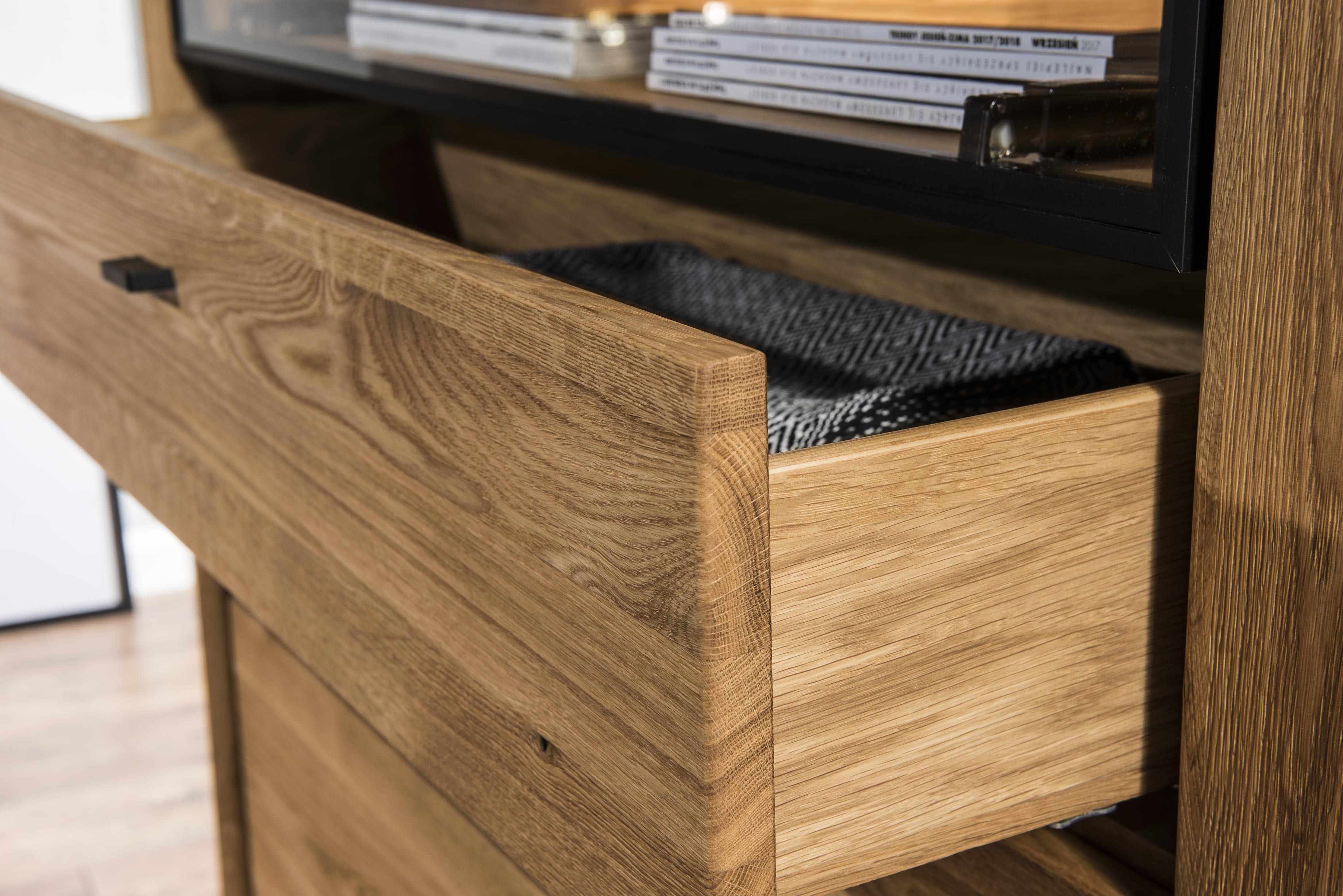 TV-Kommode im wunderschönen, leicht industriellen Stil mit modernem, zeitlosem Design. Die TV-Kommode stammt aus der Möbelkollektion Vilo, einer Neuheit, die im Herbst 2020 vorgestellt wurde. Die TV-Kommode wird bereits montiert in Premium-Qualität geliefert. Die Kommode hat 1 Tür zum Öffnen, darin befindet sich ein Fach, in der mittleren Sektion gibt es einen großen offenen Bereich, der mit Glastüren verschlossen ist und auf der Rückseite eine Öffnung für Kabel hat. Darunter befinden sich 2 große Schubladen. Die Beschläge und das Schließen erfolgt geräuschlos mit Soft-Close. Die Vorderseite der Kommode besteht aus Eichenholz mit einer einzigartigen Struktur der natürlichen Holzmaserung und einer fein strukturierten Oberfläche. Der Rest der Möbel ist mit natürlichem Eichenfurnier von höchster Qualität ausgestattet.