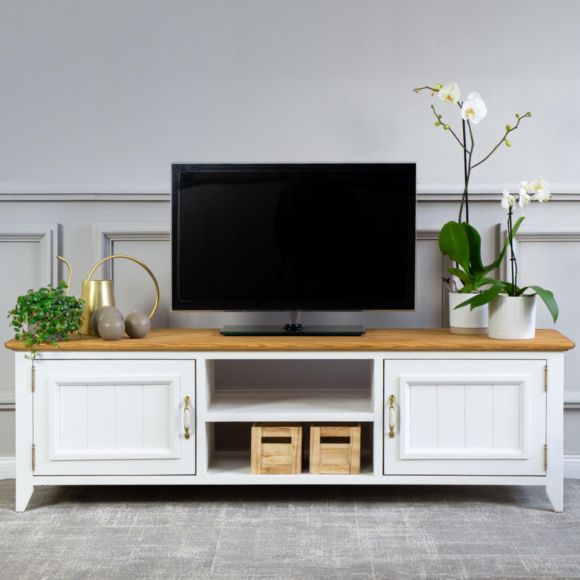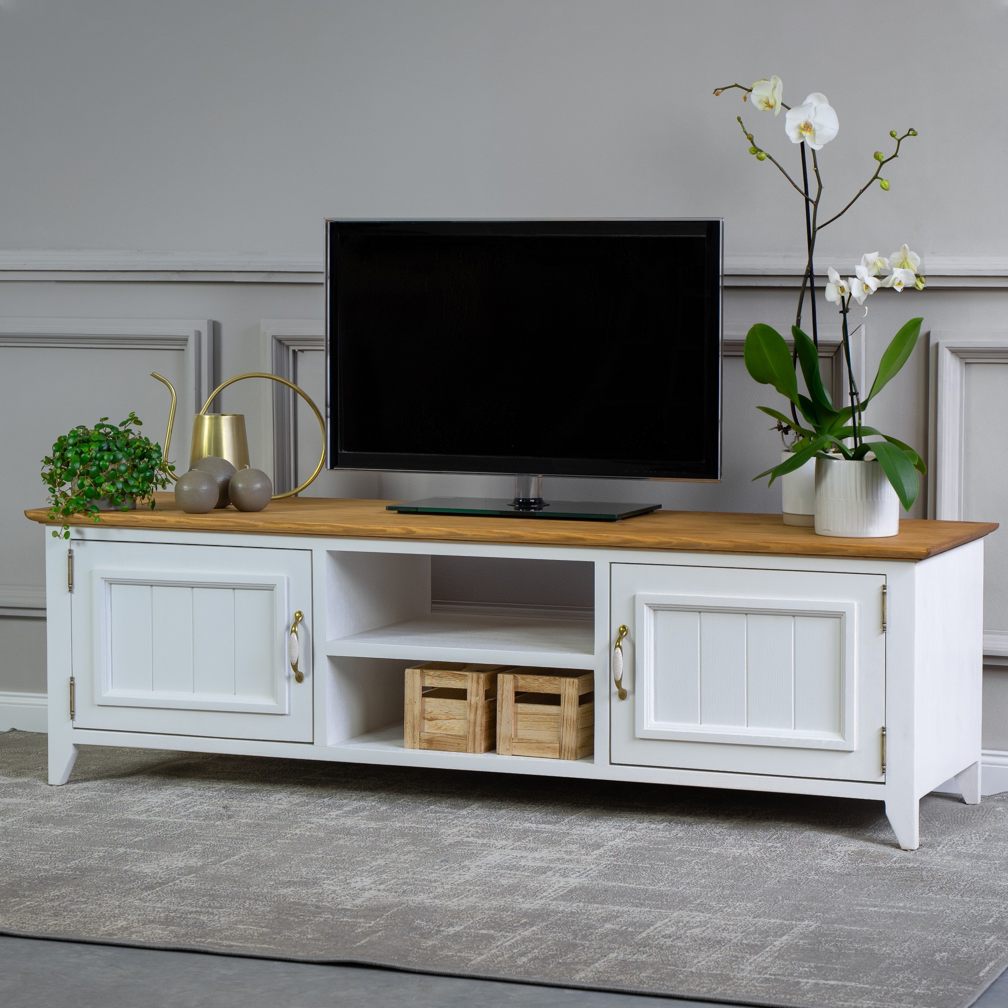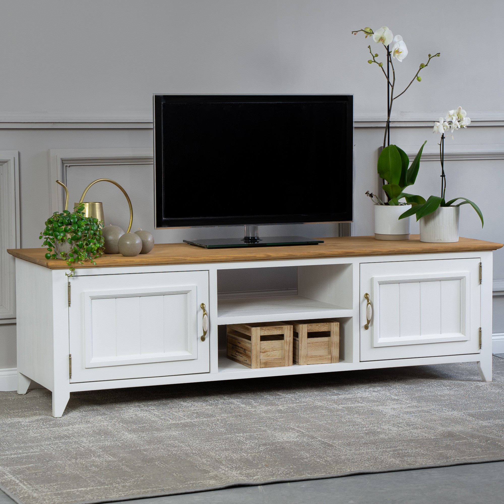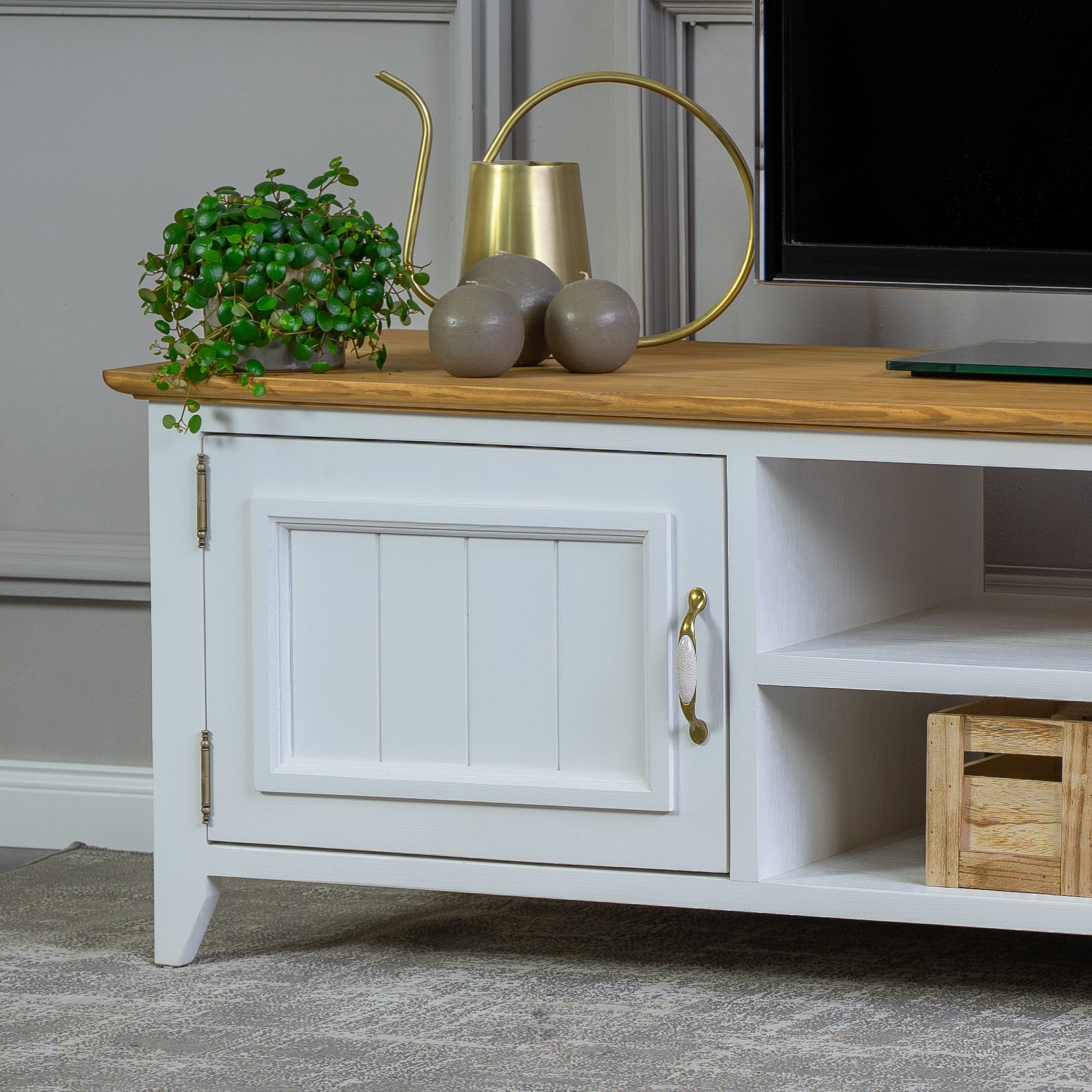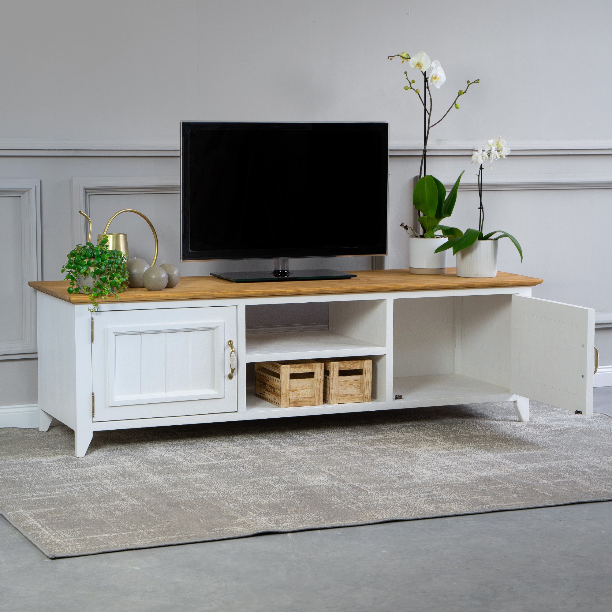 Möchten auch Sie Urlaub auf dem französischen Land erleben, ergänzt durch den frischen Duft von Lavendel? Das können Sie sich ganz leicht erfüllen und jeden Tag erleben. Ein natürlicher Massivholz-TV-Schrank aus der Lille-Kollektion, erweitert um weitere Stücke für Ihr Wohnzimmer, schafft Ihnen die perfekte Atmosphäre des französischen Landlebens. Der TV-Schrank in der Farbkombination Weiß-Braun ist aus reinem Kiefernholz gefertigt. Der TV-Schrank wird bereits montiert geliefert und hat an den Seiten aufklappbare Türen, in der Mitte ist ein Regal. Erweitern Sie Ihr Interieur mit diesem attraktiven Stück und erleben Sie täglich die Kraft von Naturholz. Die Ökologie des Naturprodukts und die Harmonie eines wunderschönen Designs sind Eigenschaften, die wir bei der Herstellung des Lille TV-Schranks vereint haben.