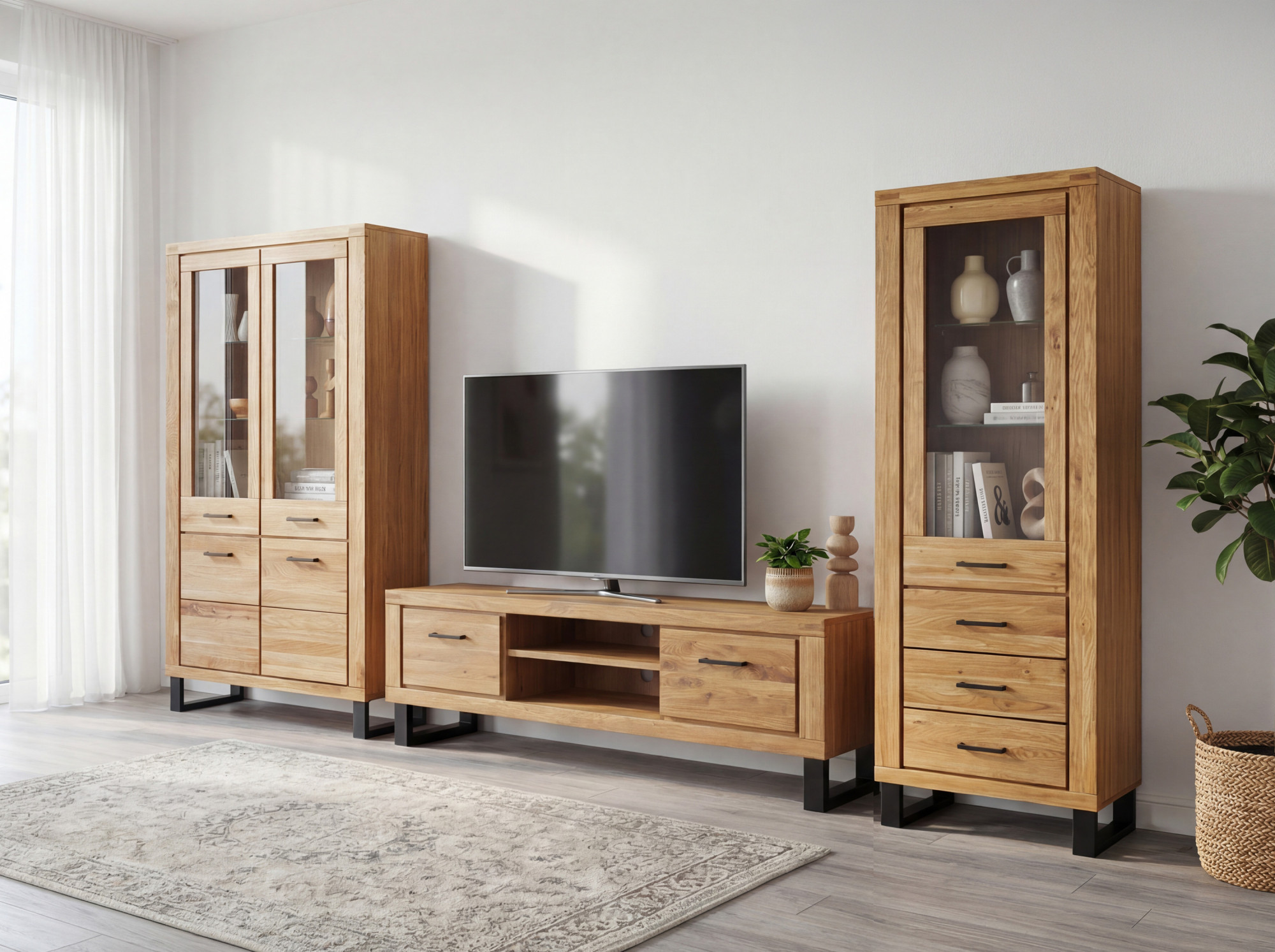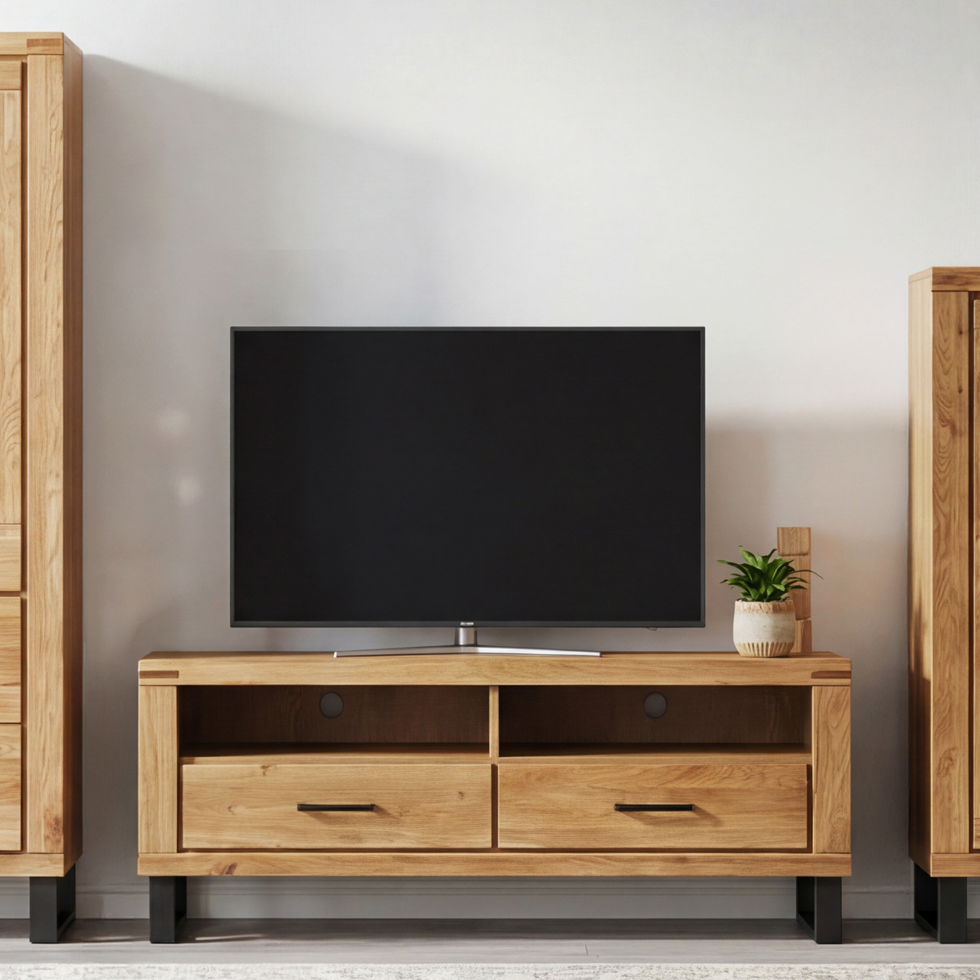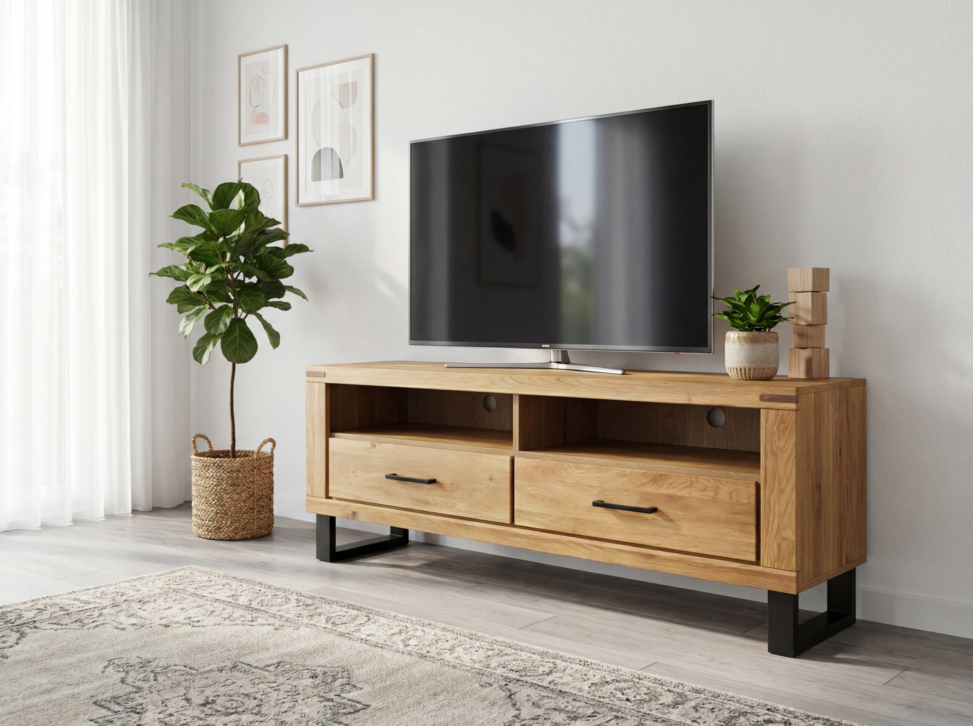 Massive Eiche TV-Kommode mit Schubladen und Metallfüßen