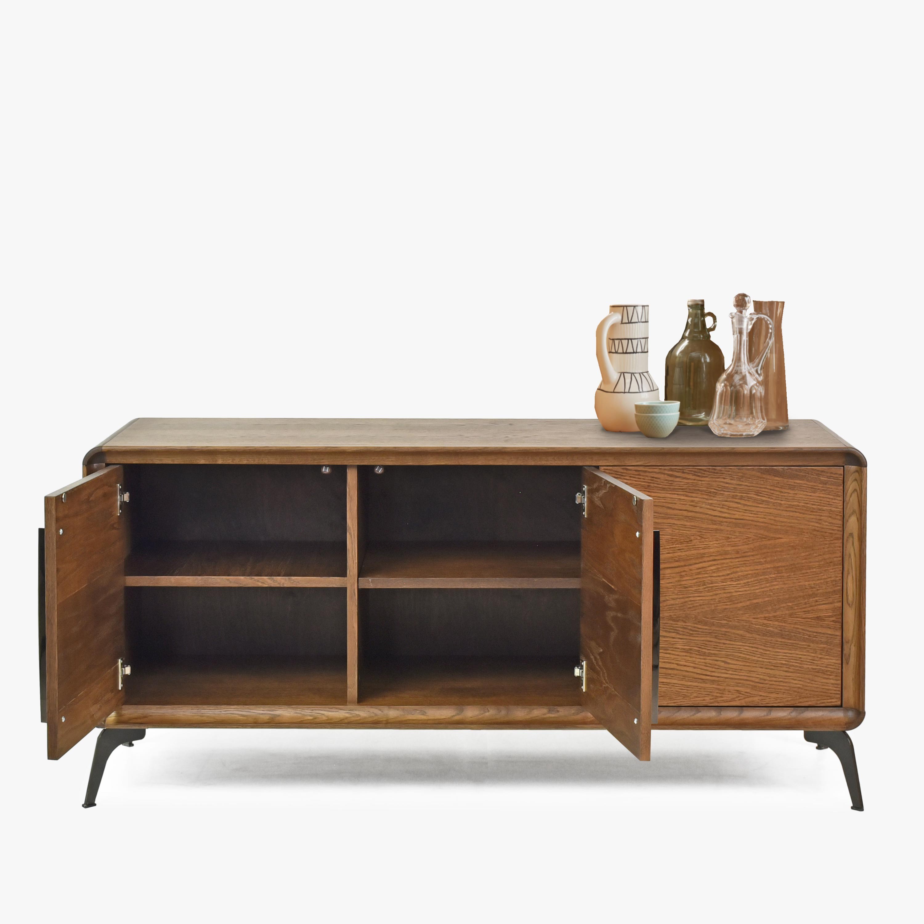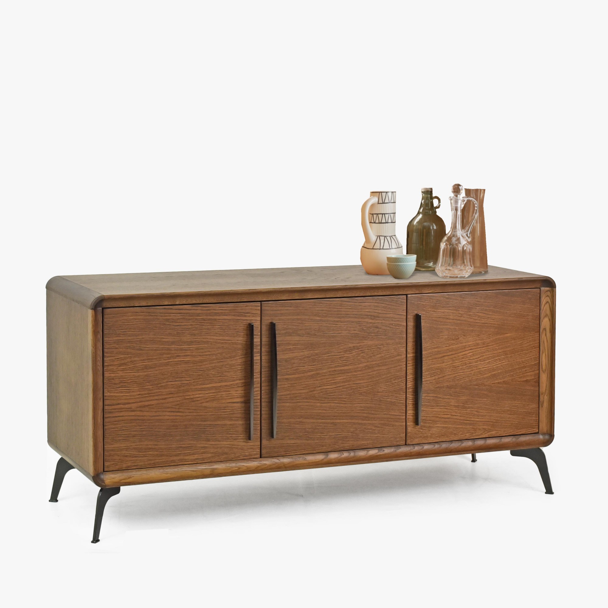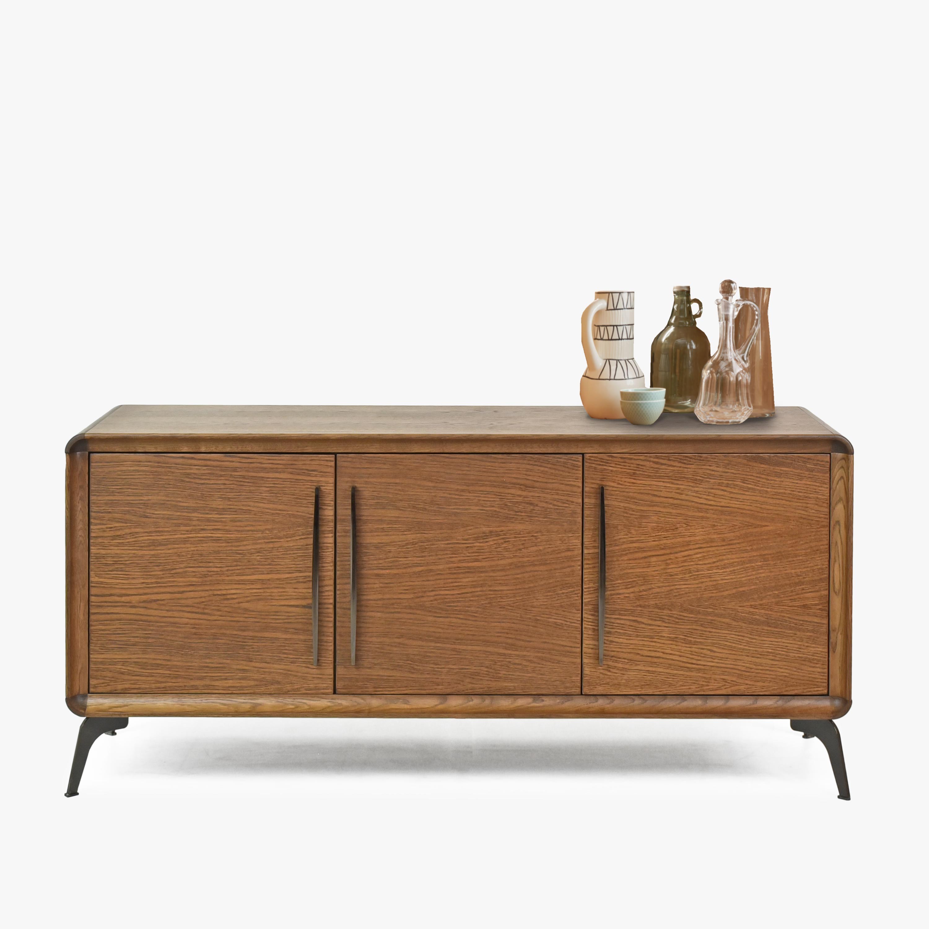 Die Kommode Lissabon ist aus erstklassigem Eichenfurnier und massivem Eichenholz in stilvollen Nussbaumfarben gefertigt, was lange Lebensdauer und Widerstandsfähigkeit gegen Verschleiß garantiert. Die einzigartige Kombination aus natürlichen Materialien, abgerundeten Ecken und harmonischen Proportionen der Kommode verleiht dem Gesamterscheinungsbild ein Gefühl von Luxus und Zeitlosigkeit. Drei geräumige Türen bieten ausreichend Stauraum für Ihre persönlichen Gegenstände, Kleidung oder andere Dinge, die Sie griffbereit haben möchten.