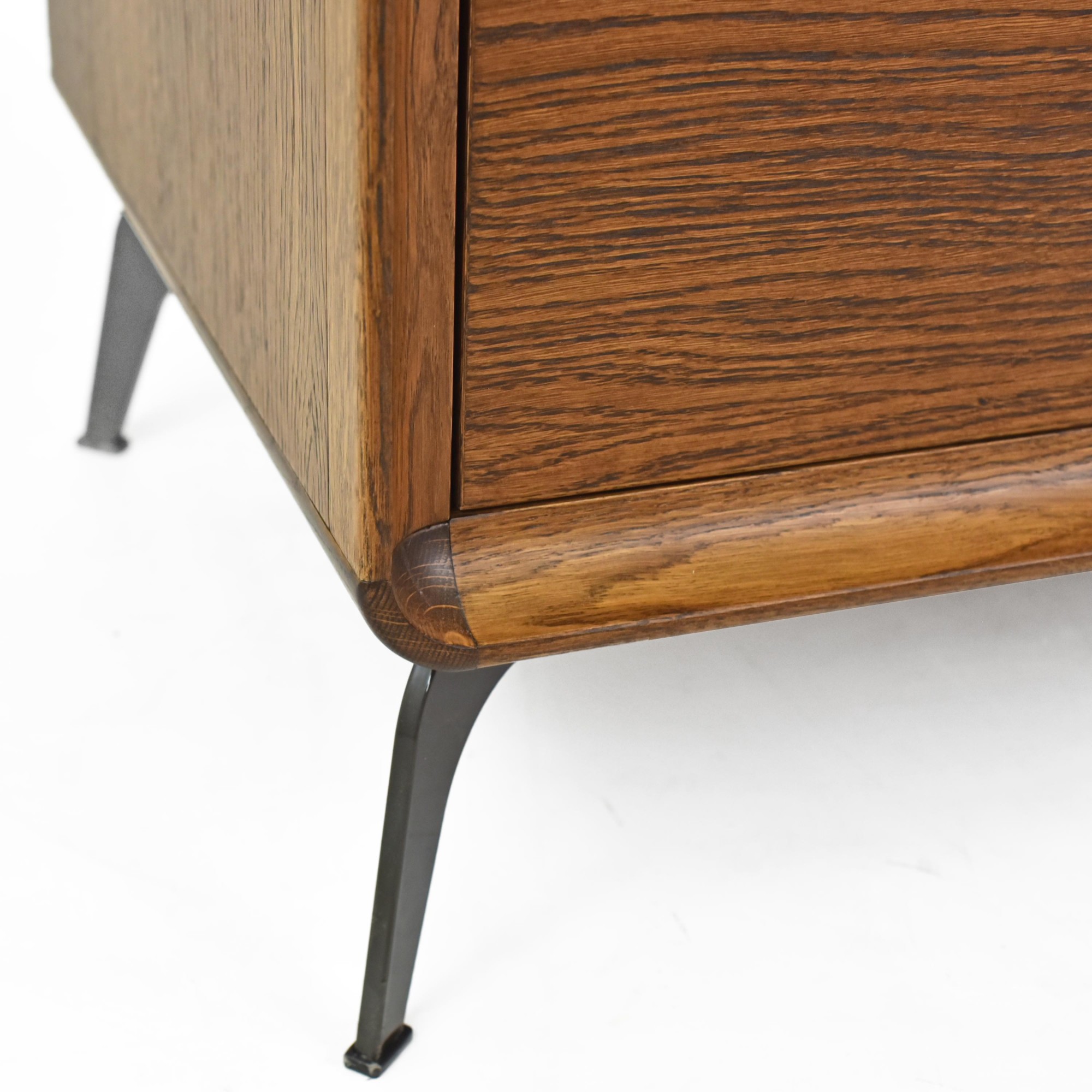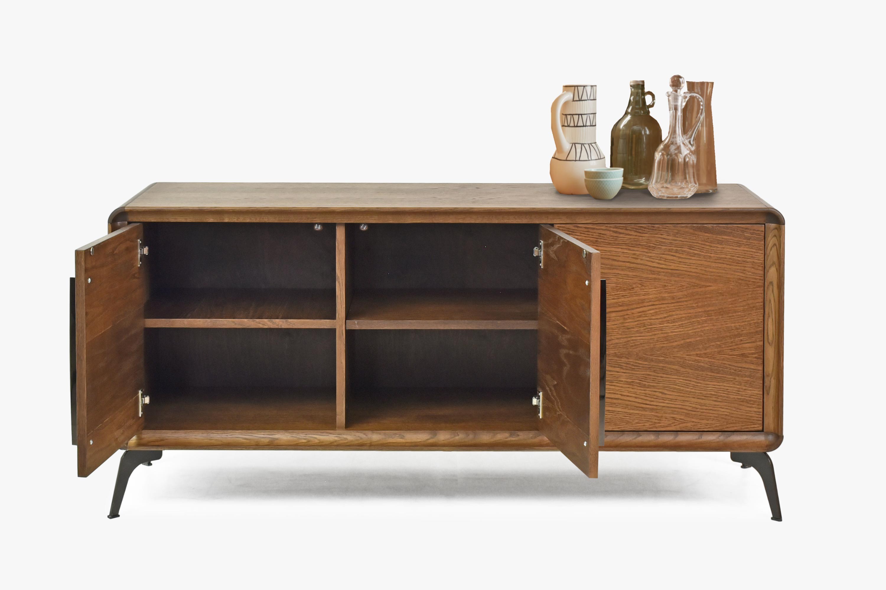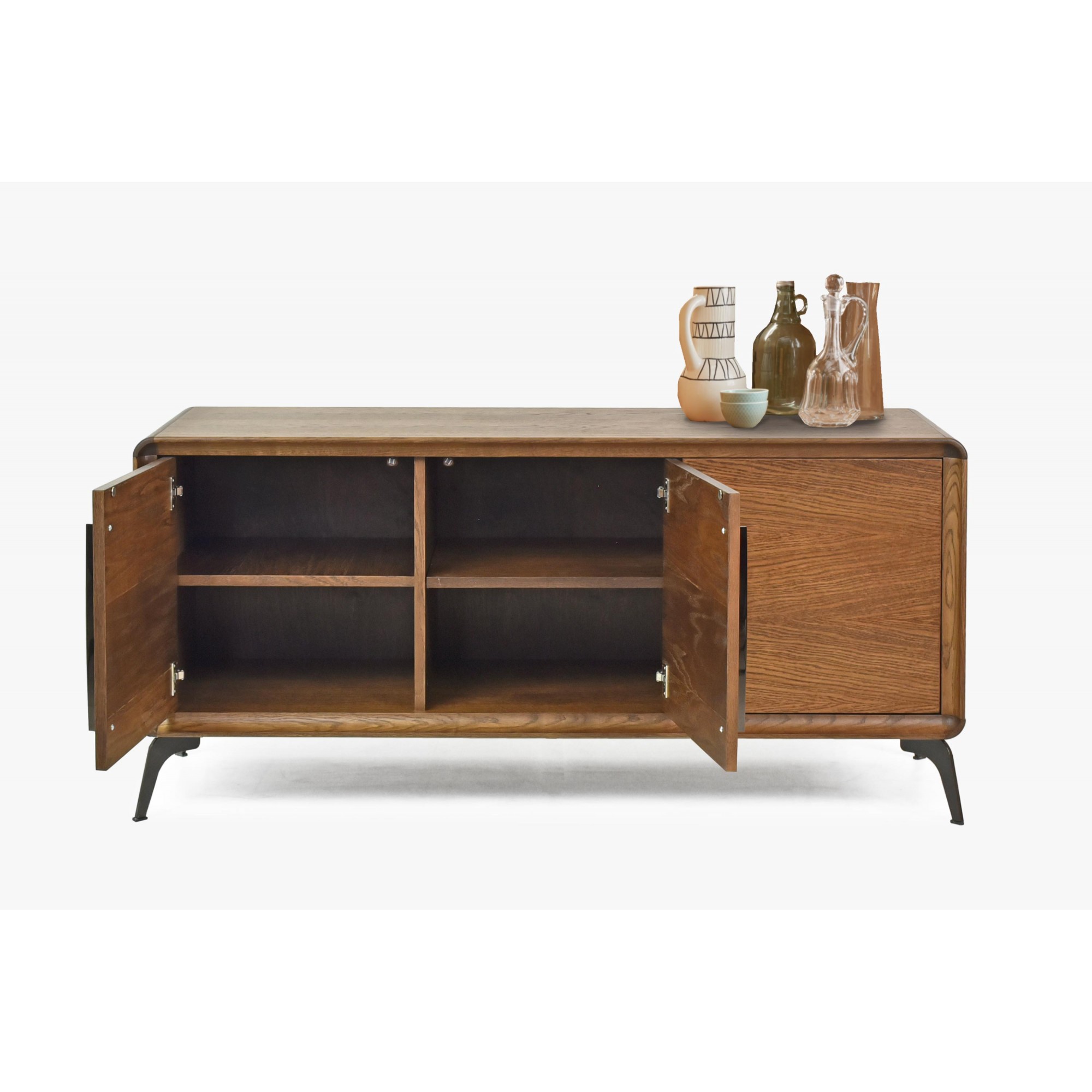 Präzise Verarbeitung der Möbel garantiert deren lange Lebensdauer und Zufriedenheit der Nutzer. Die Farbvariante Nussbaum wird durch stilvolle metallene Füße ergänzt, die dem Interieur ein modernes Aussehen verleihen. Die Variante in Eiche hingegen ist so gestaltet, dass sie direkt auf dem Boden steht, was sie zur idealen Lösung für minimalistische Einrichtungen macht.