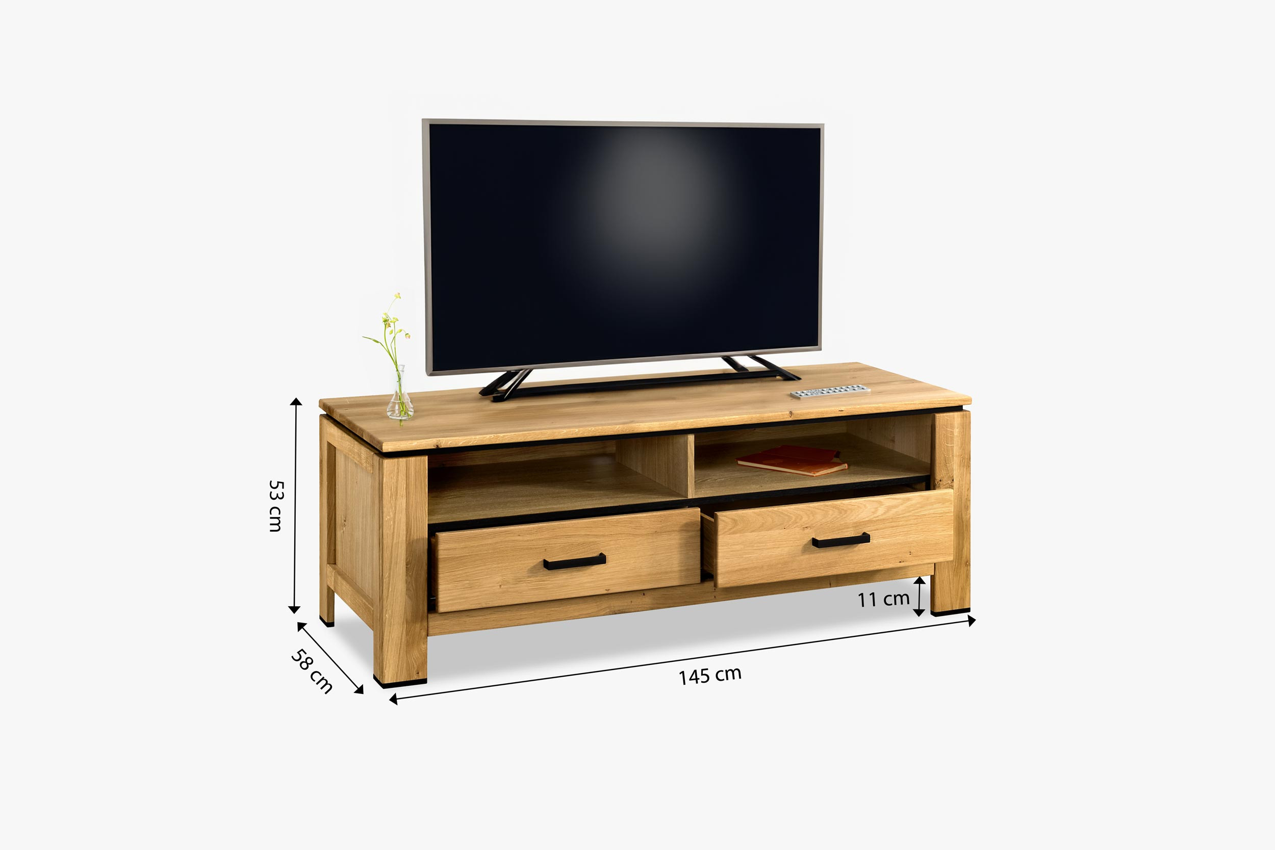 Diese eiche TV-Kommode mit schwarzen Griffen ist die perfekte Kombination aus Funktionalität und modernem Design, ideal für jedes Wohnzimmer oder Entertainment-Zimmer. Hergestellt aus hochwertigem Eichenholz und ergänzt mit natürlichem Eichenfurnier, garantiert diese Kommode nicht nur hohe Haltbarkeit, sondern auch einen ästhetischen Wert, der schnell zum dominierenden Element Ihres Interieurs wird. Dank der Oberflächenbehandlung mit hochwertigem deutschem Livos-Öl ist die Kommode widerstandsfähig gegen normale Abnutzung und leicht zu pflegen, was ihre langfristige Schönheit und Funktionalität sichert.