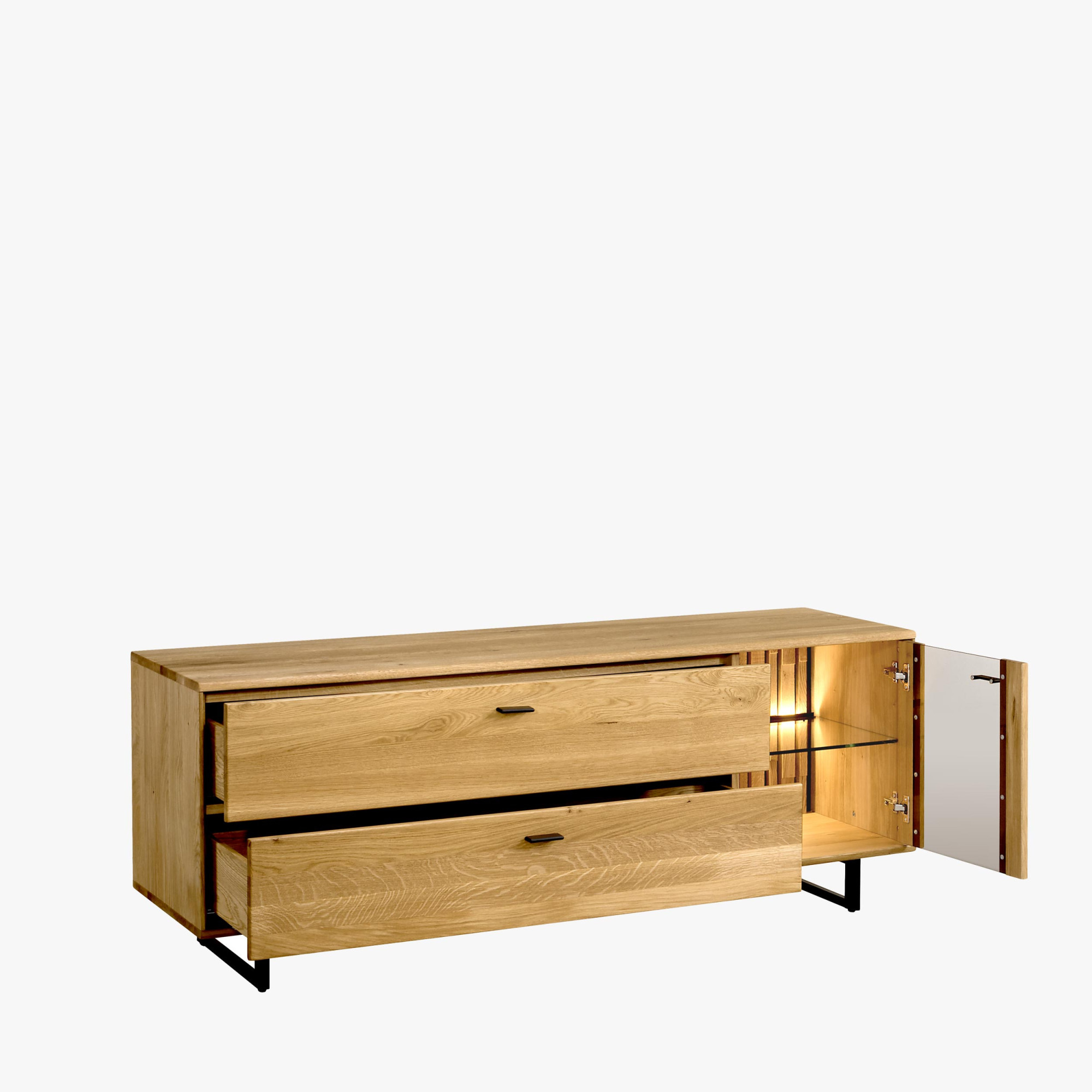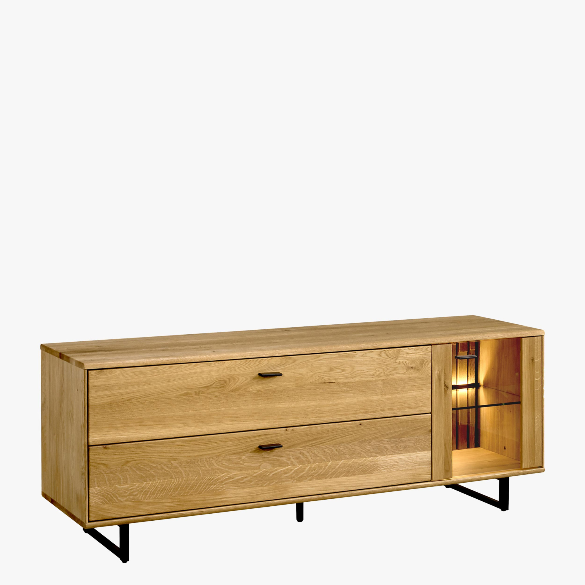 Moderne TV-Kommode aus Eichenholz, auf schwarzen Metallbeinen
