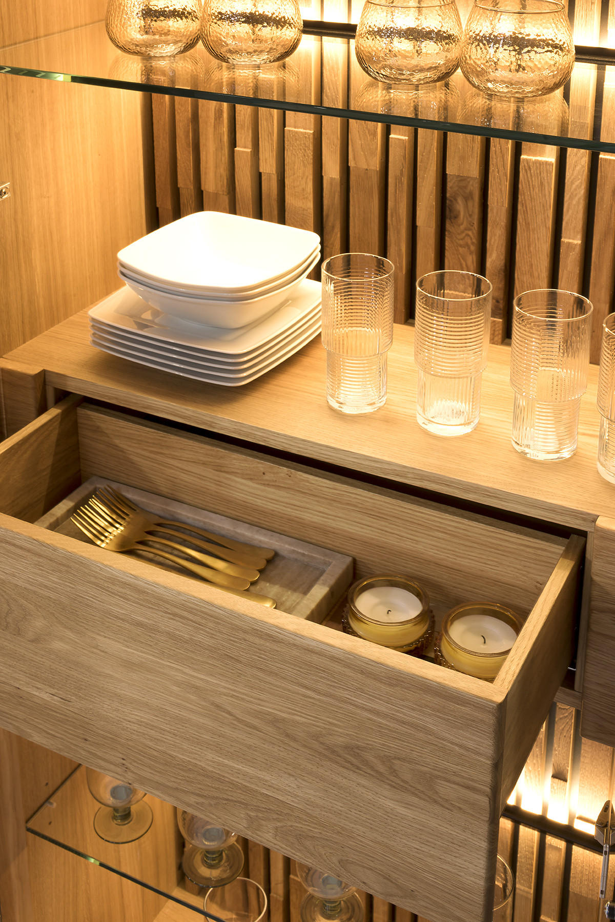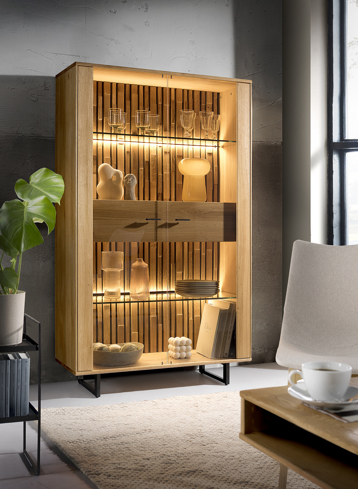 Luxuriöse Möbel für das Wohnzimmer in hochwertiger Ausführung aus massivem Eichenholz in Kombination mit Eichenfurnier, wobei die Hauptsichtteile massiv sind. Erhältlich in natürlicher honigfarbener gebürsteter Eiche. Die Möbel werden montiert geliefert (stabiler, stabiler, ohne sichtbare und die Ästhetik beeinträchtigende Schrauben wie ein Puzzle) und die Schubladen und Türen sind mit einem Dämpfungssystem für sanftes und leises Schließen ausgestattet. Regale in den verglasten Teilen sind aus Glas. Elegante Eichen-Wohnzimmergarnitur aus massivem Holz und natürlichem Furnier. Modernes industrielles Design mit Parkettmuster und Metallfüßen - das sind die Hauptmerkmale der Eichenmöbel Tramontino. Die Rückseiten der verglasten Türen sind mit einem speziellen Design aus zusammengesetzten Parkettplatten gefertigt, siehe Foto. Die Möbel sind mit natürlichem Wachs und Öl der deutschen Marke Livos behandelt.