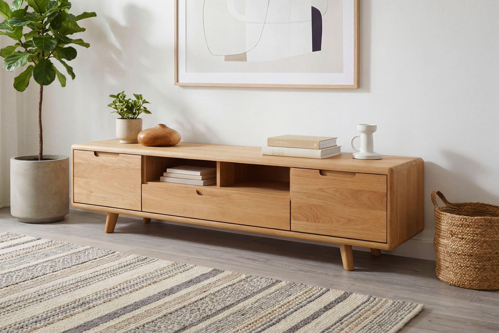 Schlüsselwörter: TV-Kommode, skandinavisches Design, Eichenholz, Bratislava-Kollektion, Natur-Eiche, Olio-Wachs-Oberfläche, Soft-Close, zeitloser Stil, hochwertige Möbel, Stauraum.