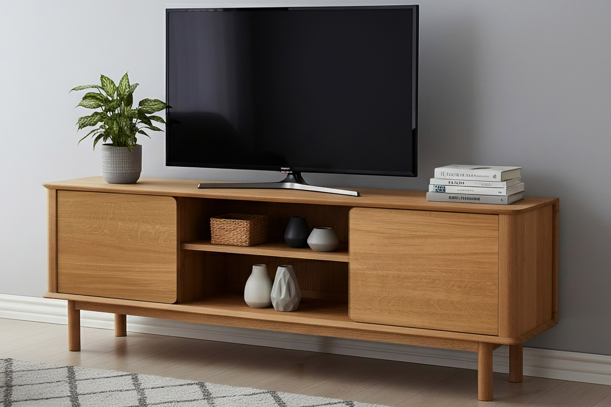 Eichen-TV-Kommode mit Türen und offenem Regal, naturholz