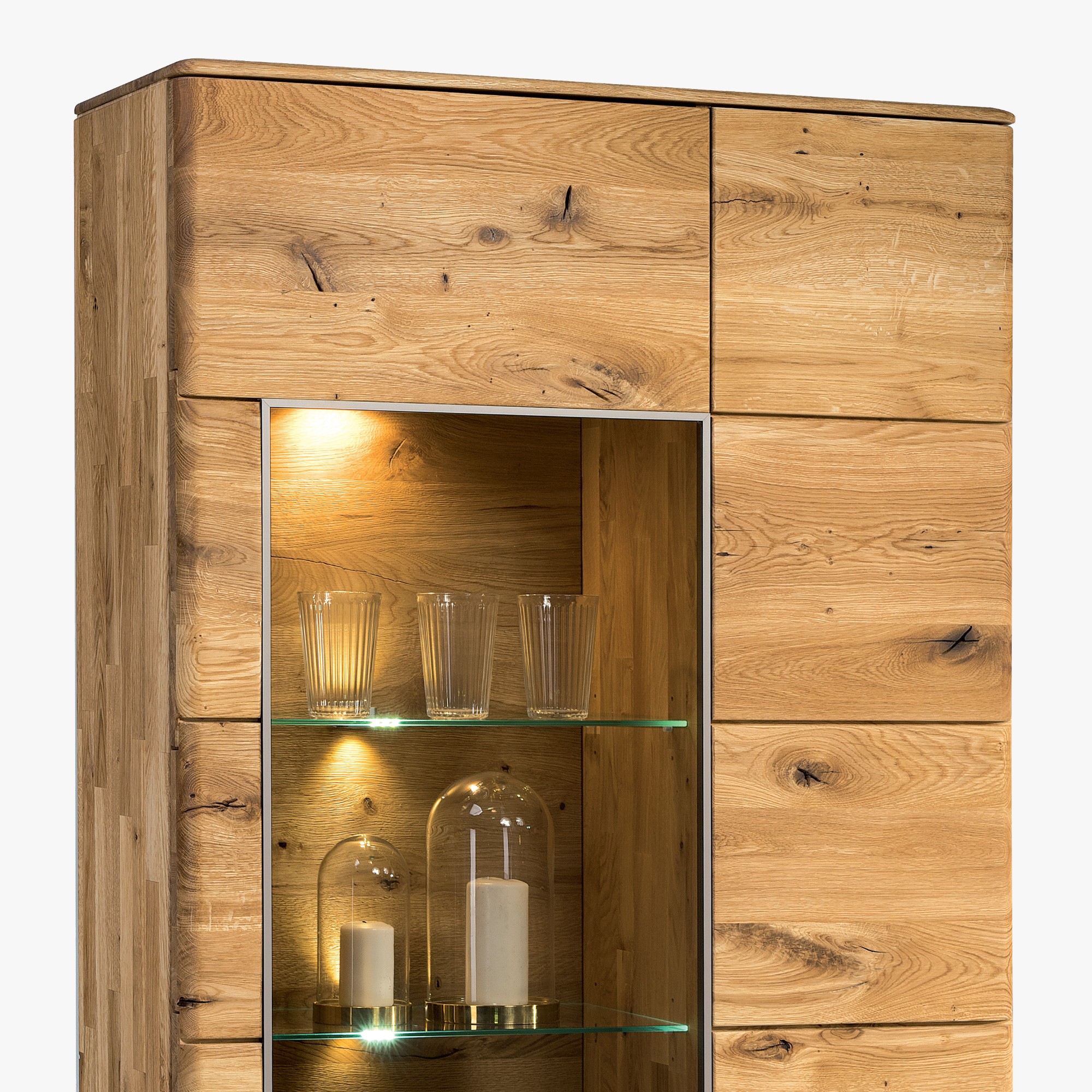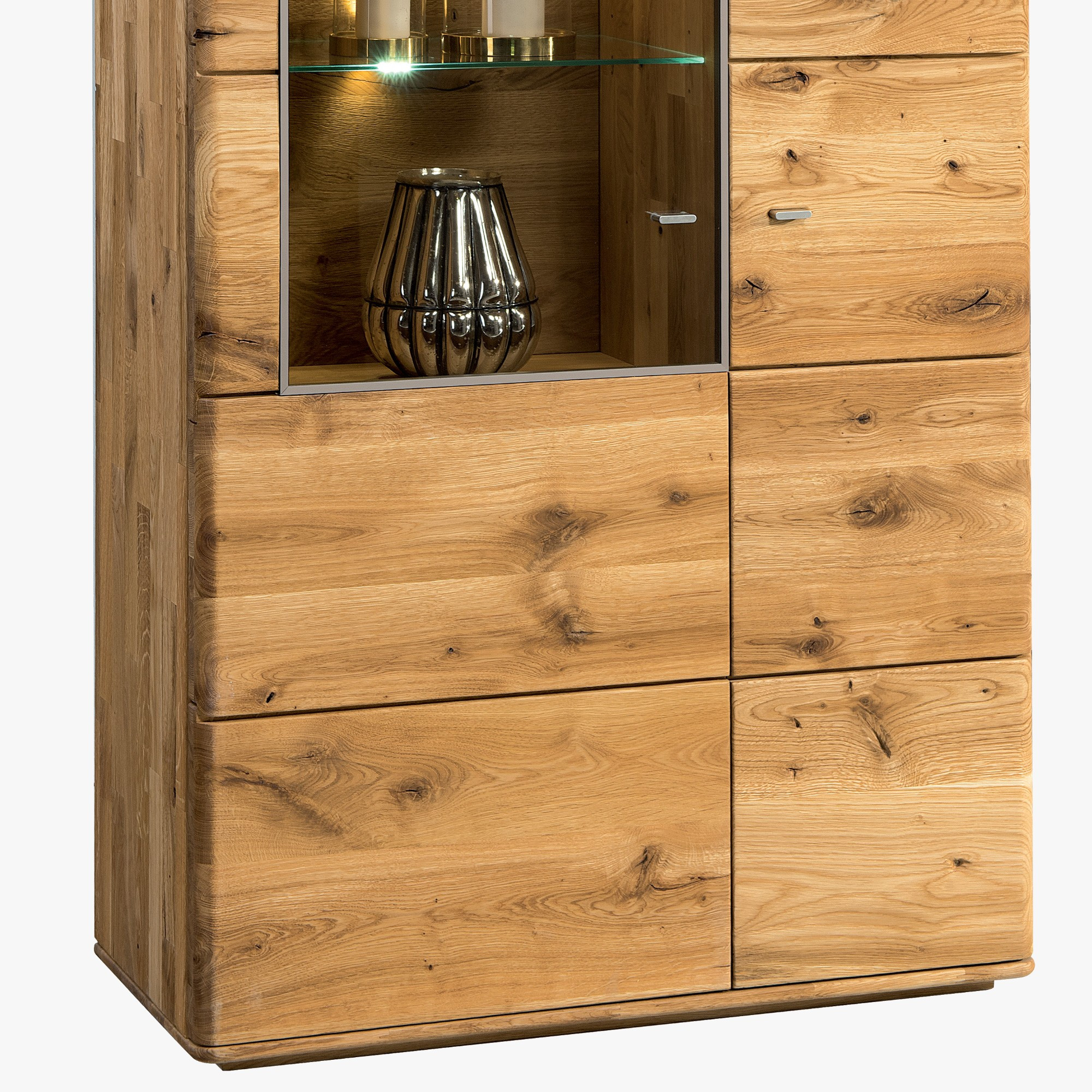 Praktischen Vitrinen gönnen und gleichzeitig Ihr Zuhause mit warmem Holz gemütlich gestalten – das geht nur mit der Eichenkollektion Texas. Eine hohe Kommode, halb verglast, halb geschlossen, gehört dazu. Gemeinsam mit weiteren Eichenmöbeln bildet sie eine sehr luxuriöse Kollektion aus massivem Eichenholz. Die Kollektion eignet sich zur Einrichtung von Ess- und Wohnzimmern. Wir wollen Ihnen nicht vorschreiben, wie Sie Ihr Zuhause einrichten, daher liegt es ganz bei Ihnen, wo Sie die Möbel platzieren. Eine hohe und teilweise verglaste Vitrine fügt sich jedoch am besten ins Esszimmer ein. Im verglasten Regalteil können Sie repräsentatives Inventar und andere Dinge ausstellen, in den geschlossenen Bereich alles andere.