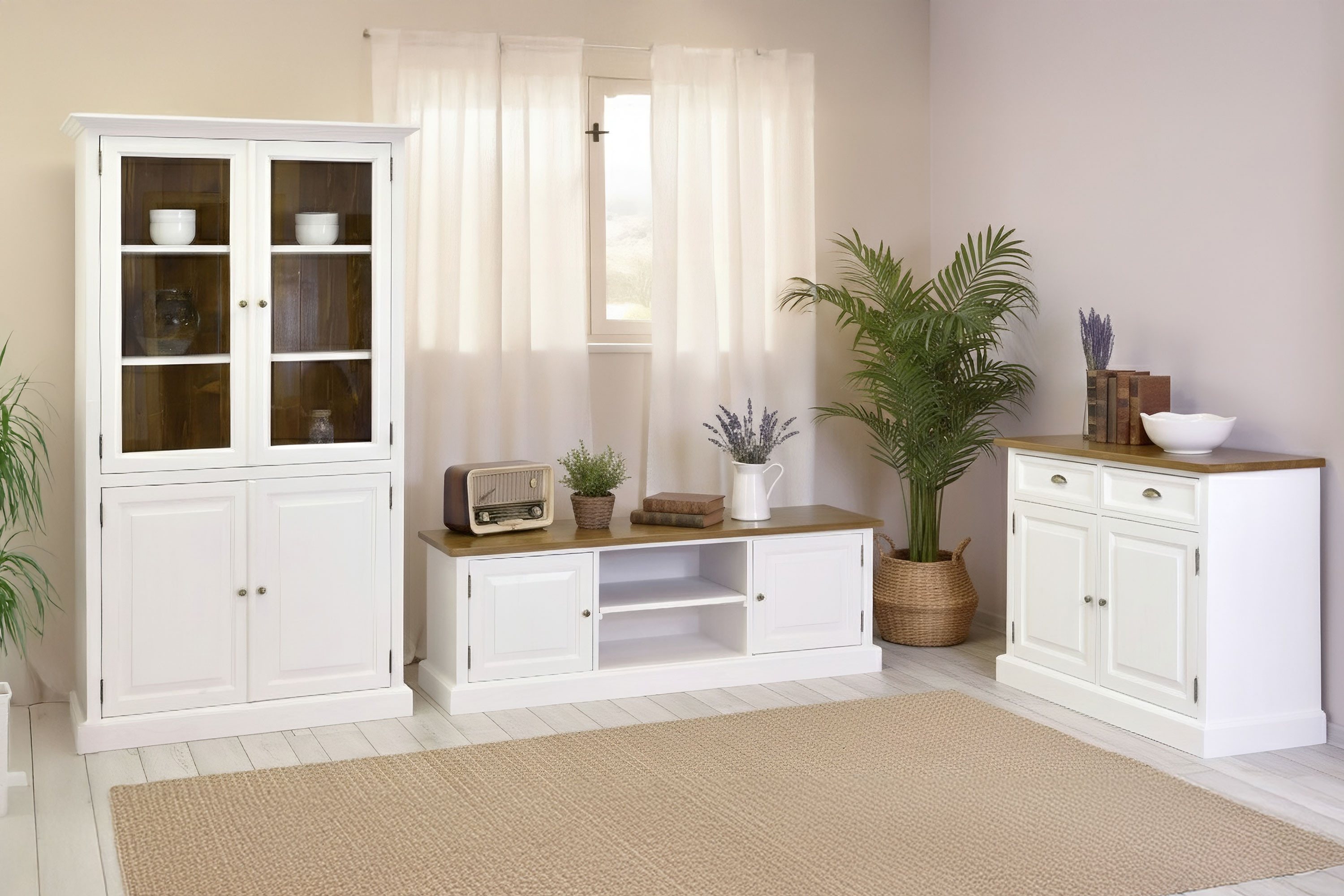 Massive Vitrine mit zwei Türen im Provence-Stil ist ein elegantes Möbelstück, das praktischen Nutzen mit einem romantischen Aussehen verbindet, das vom französischen Land inspiriert ist. Sie ist aus 100% massivem Kiefernholz gefertigt, das Festigkeit, Stabilität und lange Lebensdauer garantiert. Die Kombination aus weißer, ökologischer Farbe und brauner lackierter Platte schafft einen zeitlosen Kontrast, der sowohl in moderne als auch klassische Inneneinrichtungen passt. Dank der Glastüren können Sie Dekorationen, Glas oder Porzellan ausstellen, während der untere Teil der Vitrine praktischen Stauraum bietet.