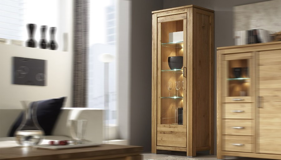 Eichevitrine im wunderschönen Design, hergestellt aus Eichenholz und natürlicher Eichenfurnier. Die Vitrine enthält 3 Glasscheiben, die auch für Bücher geeignet sind. Gegen Aufpreis besteht die Möglichkeit, eine Beleuchtung dazuzukaufen. Die Eichevitrine ist sehr stabil und gehört zur Serie New Line, so dass Sie Ihr Wohnzimmer nach Ihren Vorstellungen gestalten können. Die Eichevitrine wird bereits montiert geliefert. Die vorderen Türen sind aus massivem Eichenholz, der Rahmen der Vitrine ebenfalls aus massivem Eichenholz, die Seitenteile sind aus natürlichem Eichenfurnier.