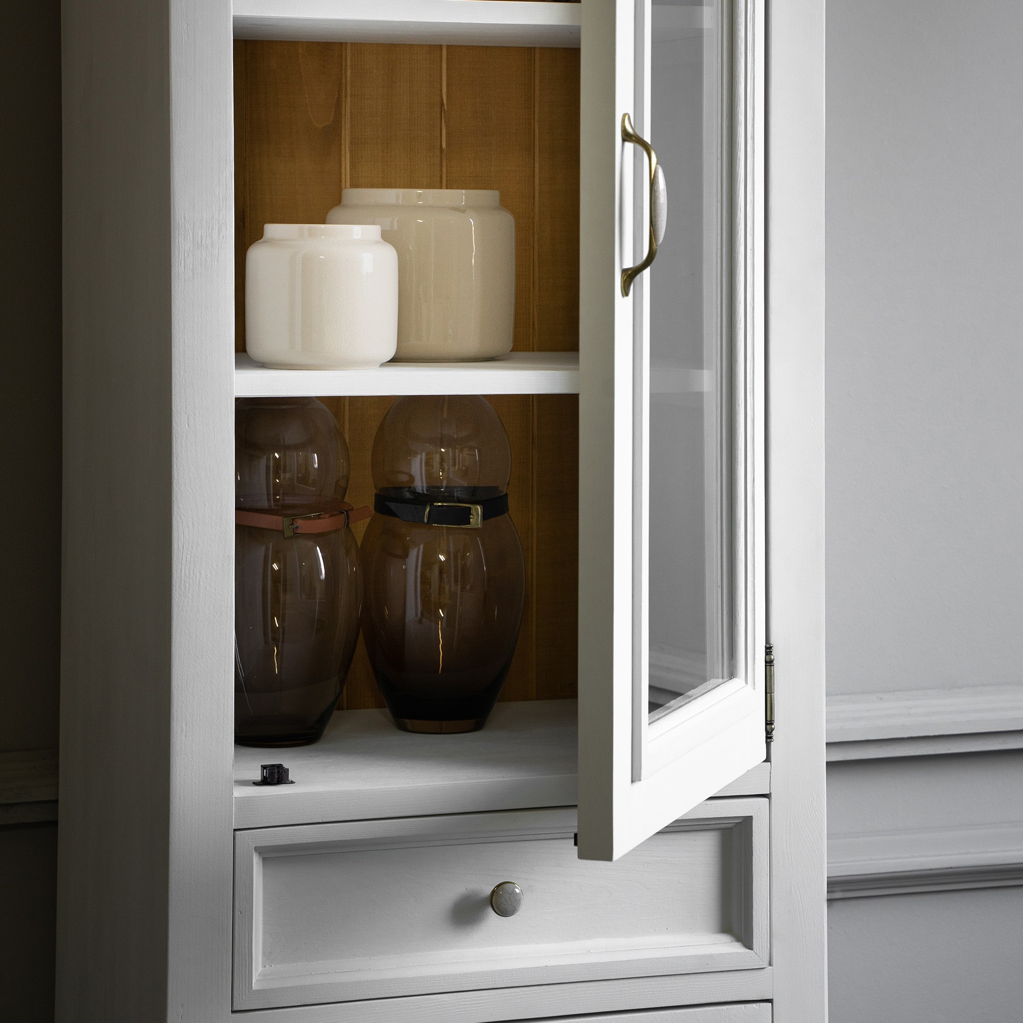 weiße Holzvitrine einflügelig mit Glas und Schublade