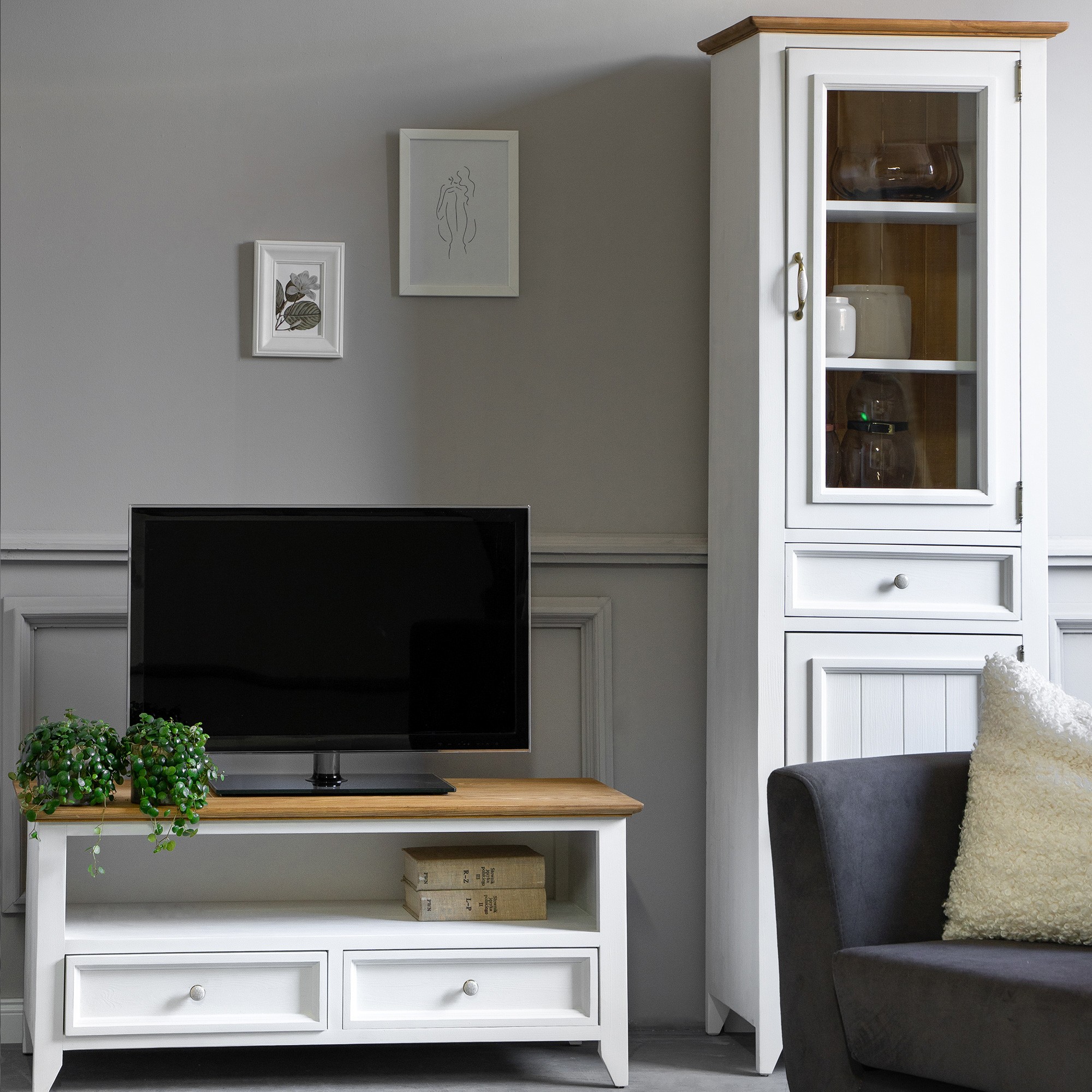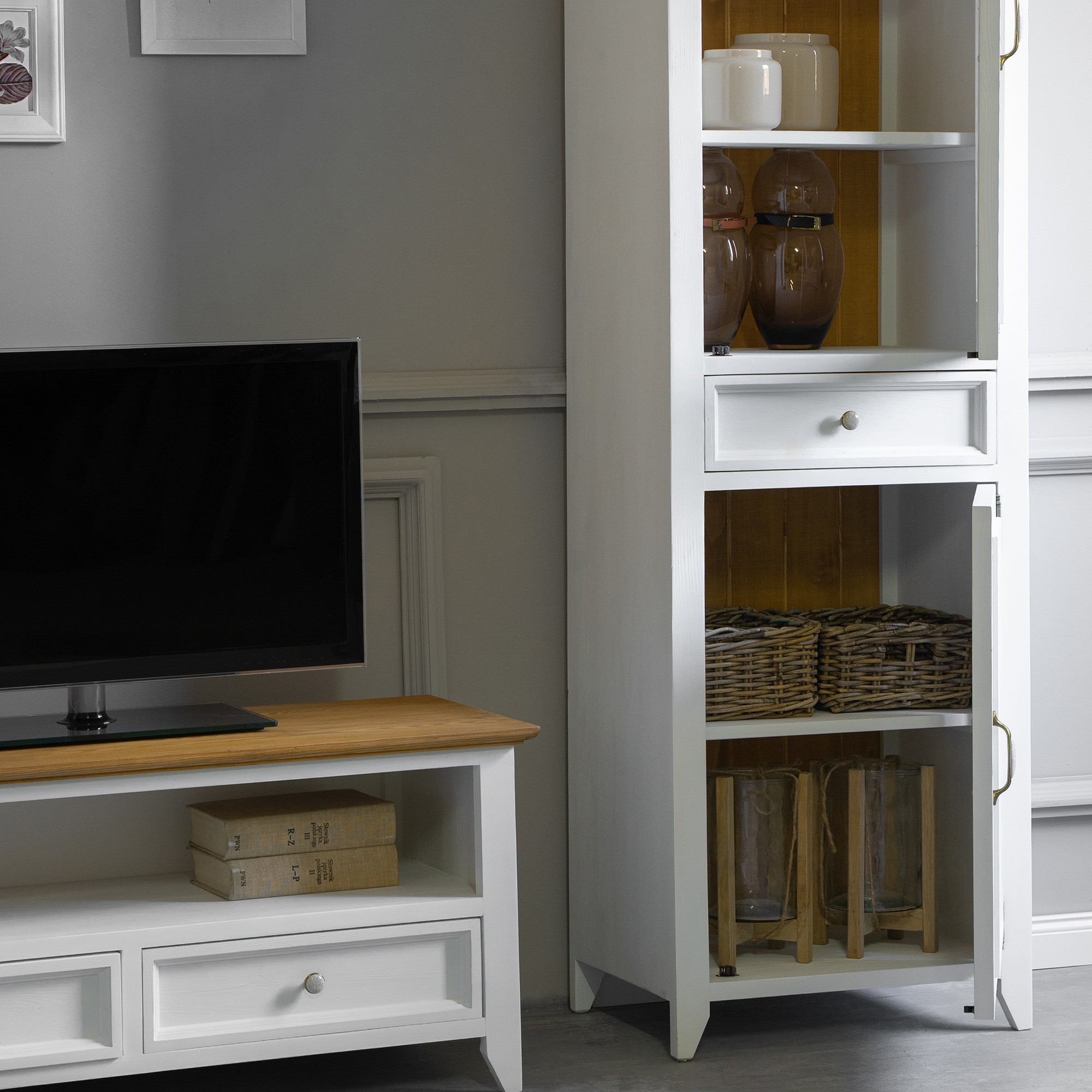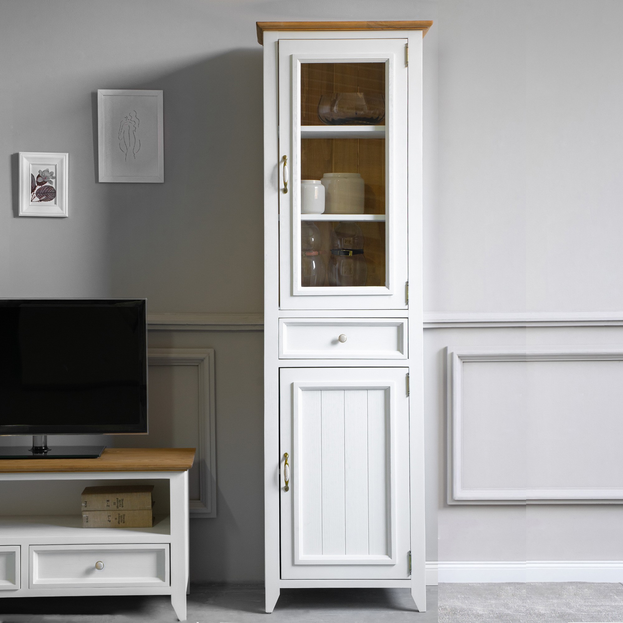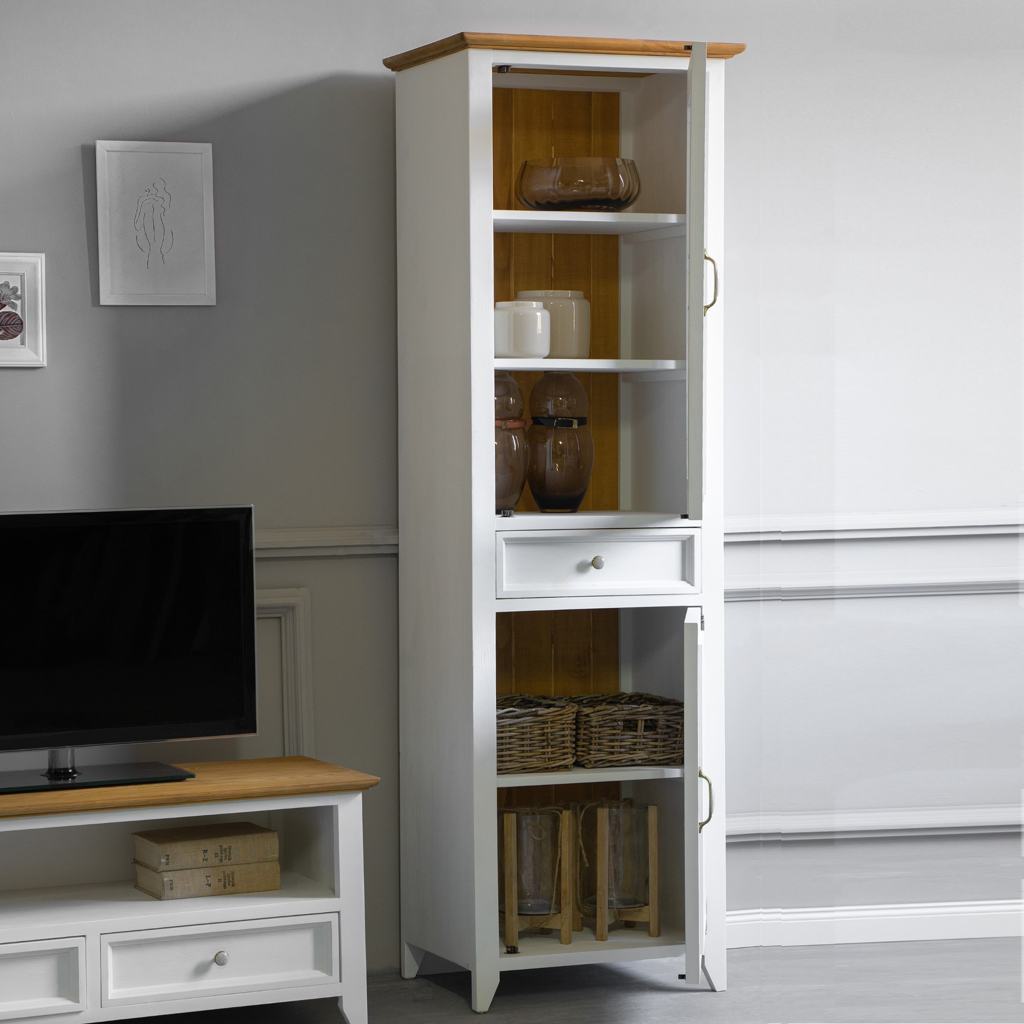 Attraktives Aussehen, Naturprodukt und französischer Wohnstil. Das sind die Eigenschaften, die die weiße Vitrine aus der Kollektion Lille auszeichnen. Die Vitrine, die für Esszimmer oder auch Arbeitszimmer vorgesehen ist, verfügt über einen verglasten und einen festen Türteil. In jedem Innenbereich befindet sich zusätzlich ein Regal für weiteren Stauraum. In der Mittelzone ist eine Schublade. Stellen Sie sich den Duft von frischem Gebäck vor, der Ihr Esszimmer, ausgestattet mit Möbeln aus der Kollektion Lille, erfüllt und tanken Sie täglich die Energie der ländlichen Atmosphäre. Erweitern Sie Ihr Interieur mit diesem attraktiven Stück und erleben Sie täglich die Kraft natürlichen Mobiliars. Die Ökologie des Naturprodukts und die Harmonie des wunderschönen Designs sind Eigenschaften, die wir bei der Herstellung des Buffets LILLE vereint haben.