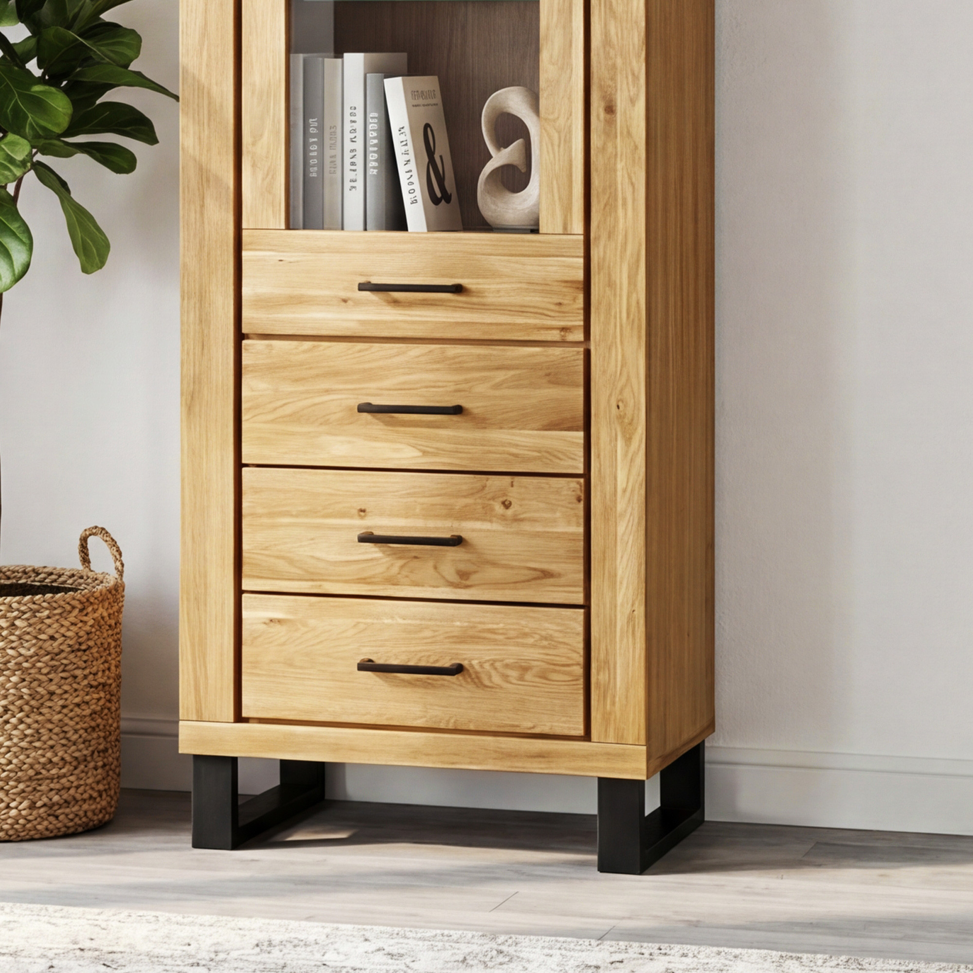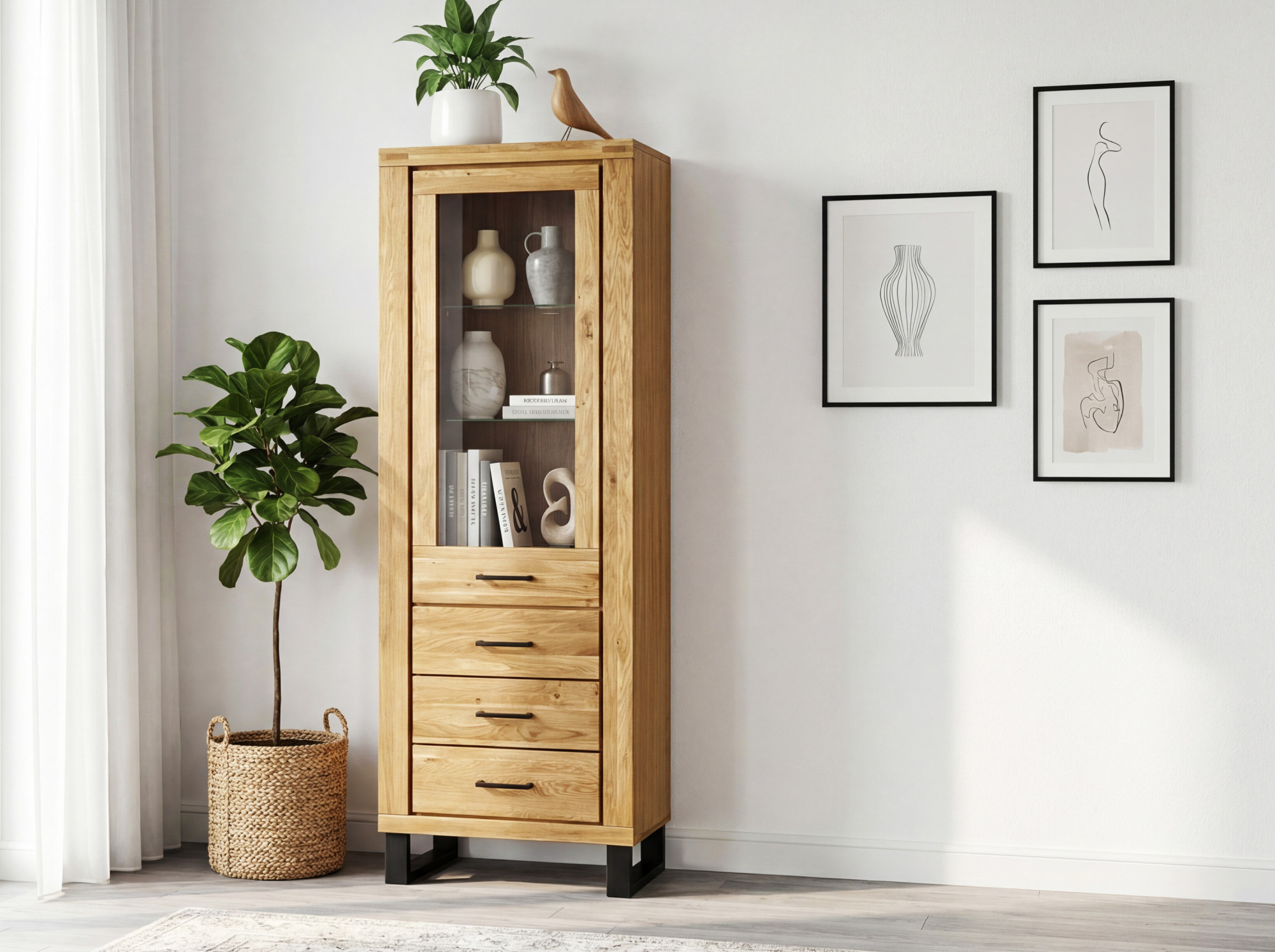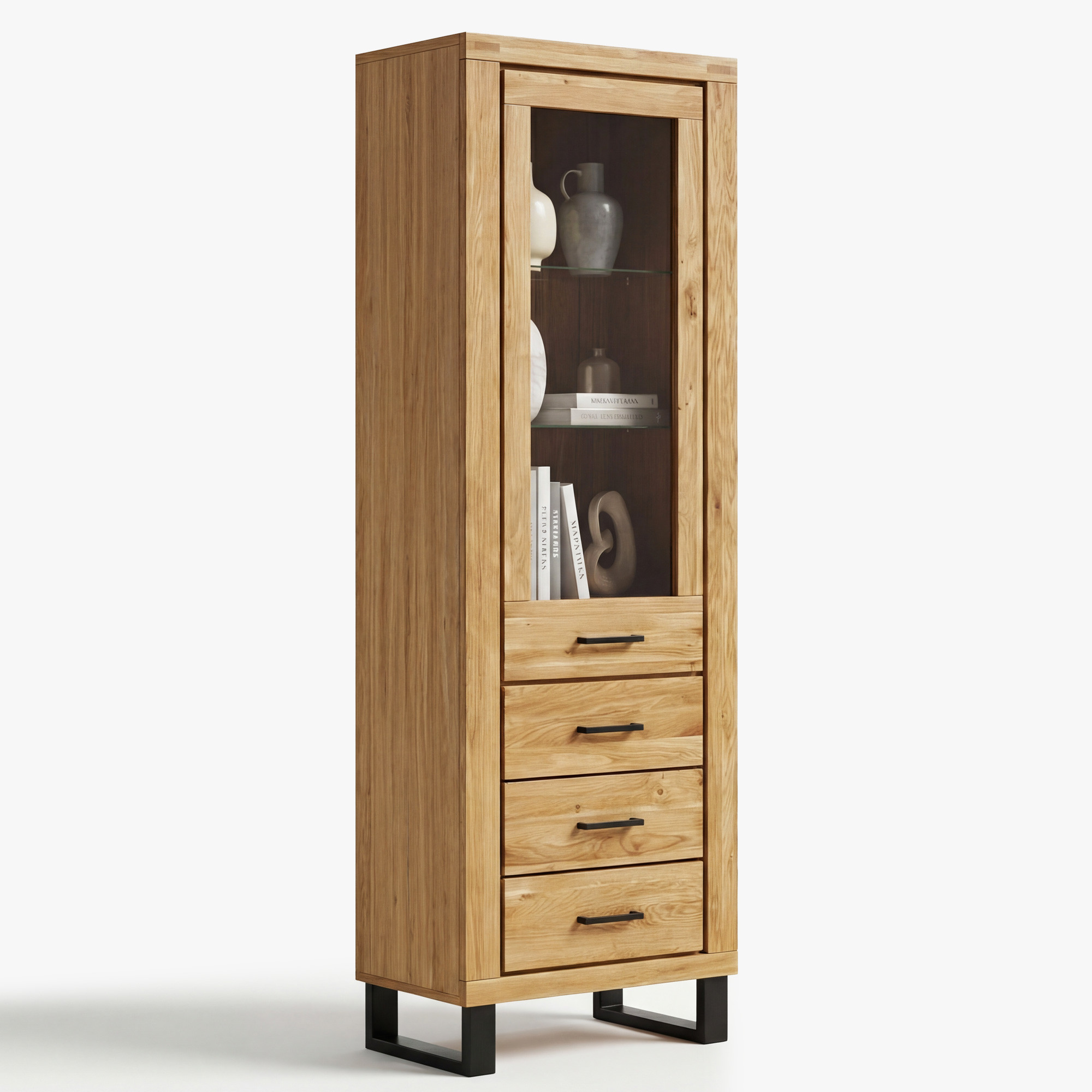 Der Korpus der Vitrine besteht aus einer furnierten Eichentafel und die inneren Regalböden sind aus laminierter Platte in Eichenoptik, was ein optimales Verhältnis von Qualität und Preis sicherstellt. Die Schubladen sind mit einem Soft-Close-System für ein leises und sanftes Schließen ausgestattet. Dank der kompakten Maße 67,5 × 40 × 199 cm eignet sich die Vitrine auch für kleinere Wohnungen, entfaltet sich jedoch ebenso gut in geräumigen Häusern. Die Vitrine steht auf eleganten Füßen, die dem Möbelstück ein luftiges Aussehen verleihen und die Reinigung des Bodens erleichtern. Das Möbelstück wird bereits montiert geliefert, sodass Sie es sofort nach der Lieferung verwenden können.