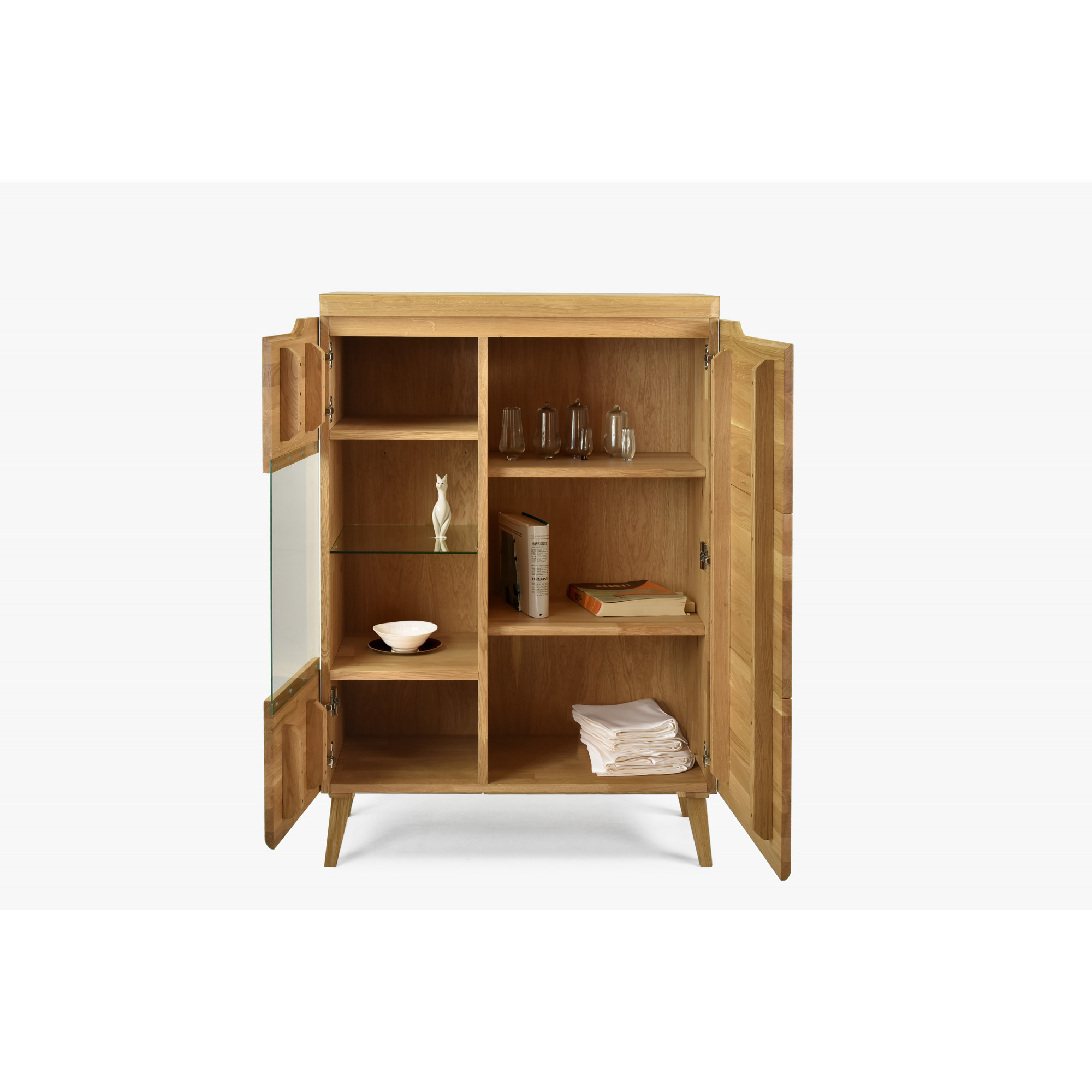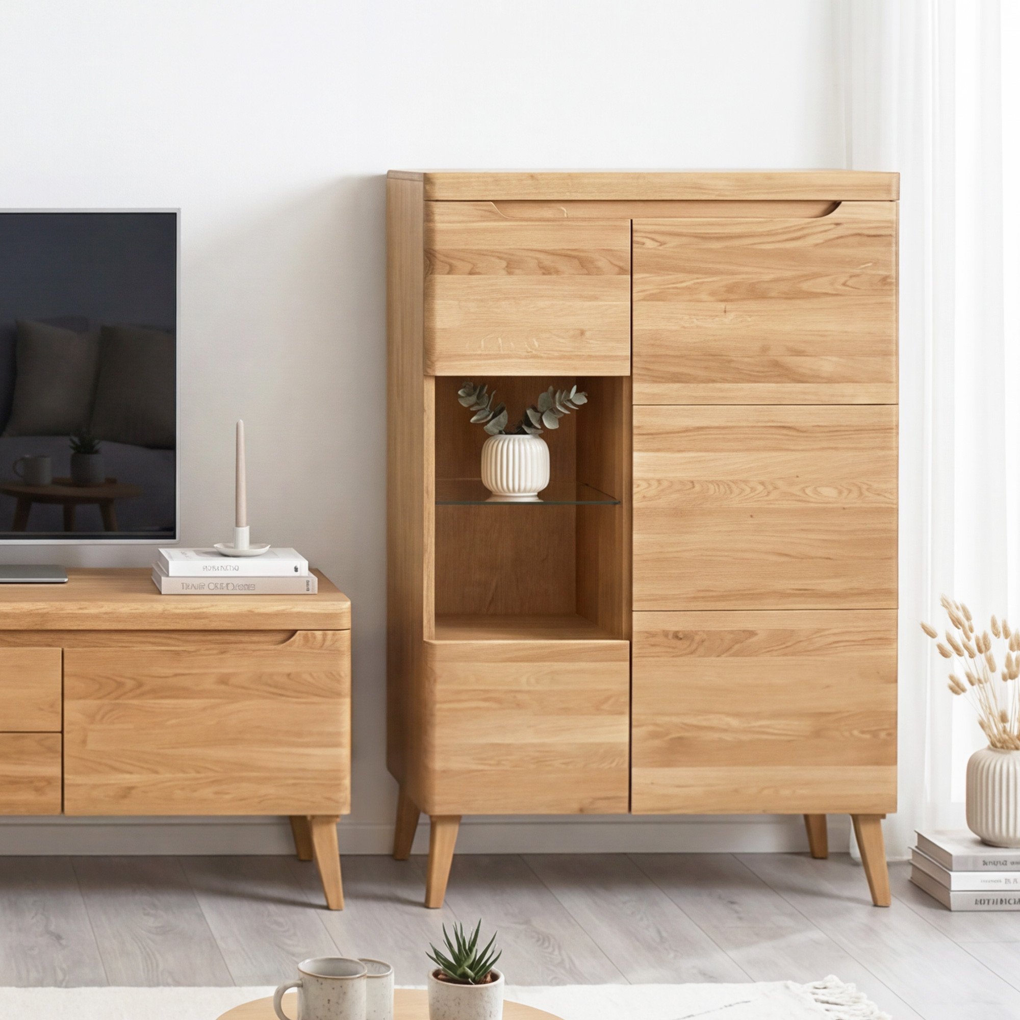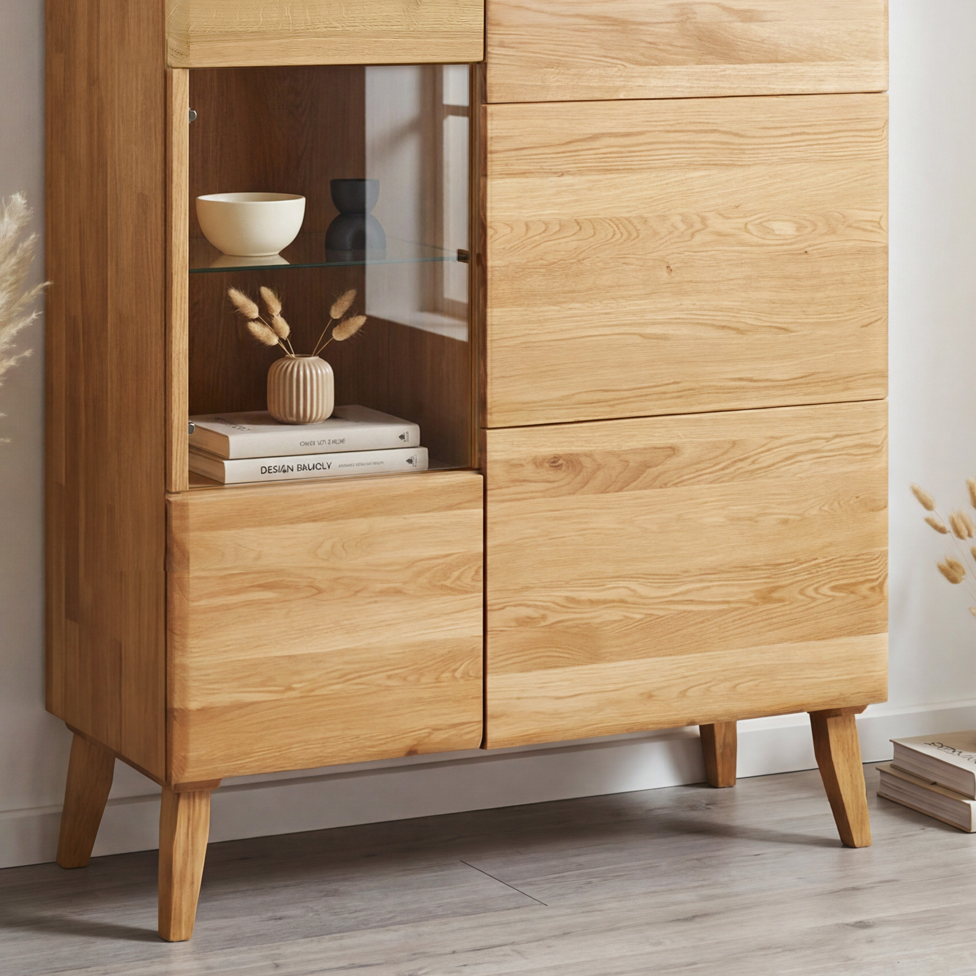 Der Vitrinenschrank hat zwei Türen – der linke Teil ist teilweise verglast und ideal zur Ausstellung von Dekorationen oder Sammlungen, der rechte geschlossene Teil bietet diskreten Stauraum.