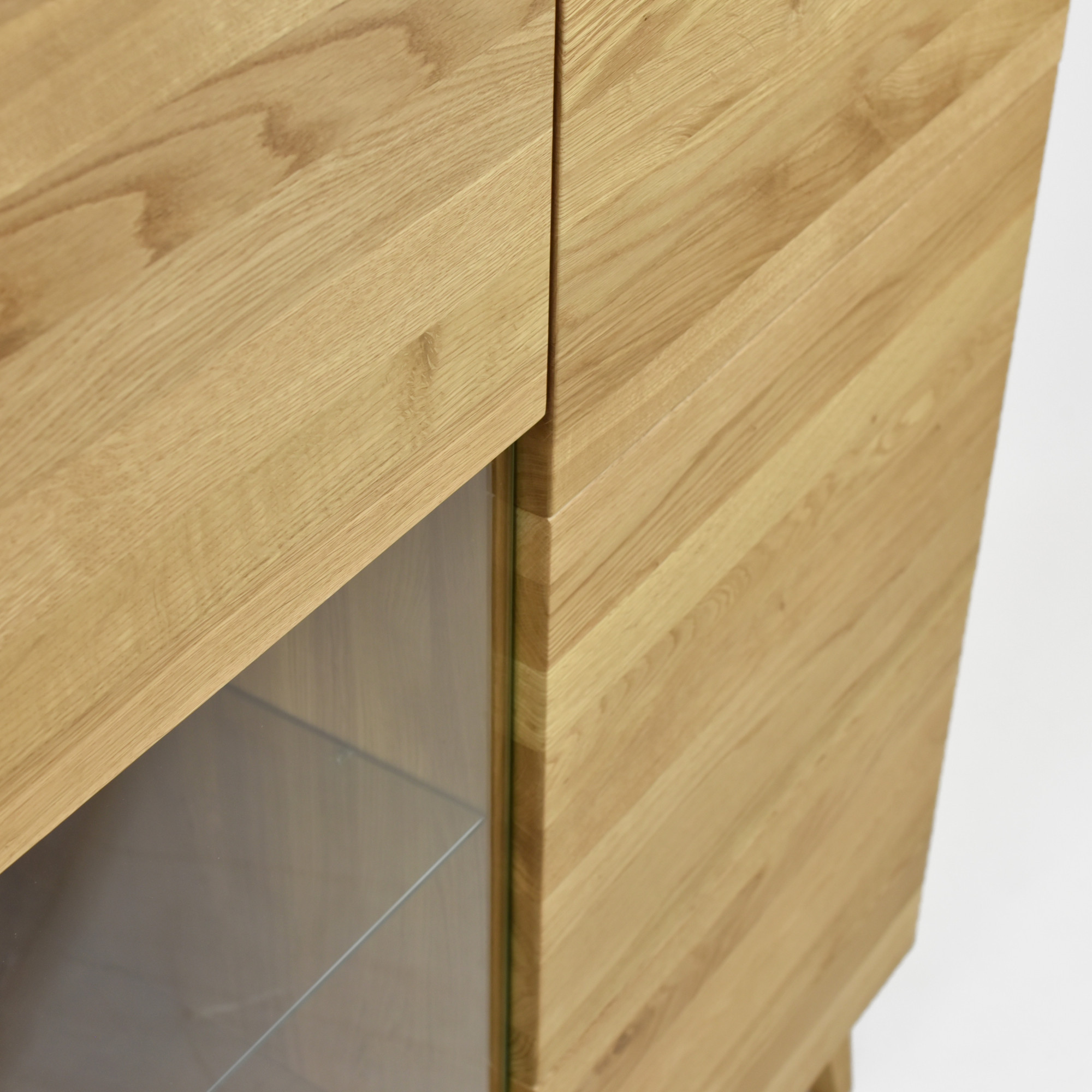 Suchen Sie einen niedrigen Eichen-Vitrinenschrank, der skandinavische Eleganz mit praktischem Stauraum und Ausstellungsfläche verbindet? Der niedrige Vitrinenschrank Praha ist Teil unserer besonders beliebten Kollektion aus Eichenmöbeln Praha und überzeugt Sie nicht nur durch sein minimalistisches Design, sondern auch durch die hochwertige Verarbeitung aus massiver Eiche. Dank der schlanken holzernen Füße wirkt der Vitrinenschrank luftig und leicht, wodurch der Raum optisch vergrößert wird. Die Oberfläche ist mit natürlichem Öl der italienischen Marke Borma Wachs in der Farbe Eiche natural behandelt, das das Holz schützt und seine natürliche Maserung und Struktur schön hervorhebt.