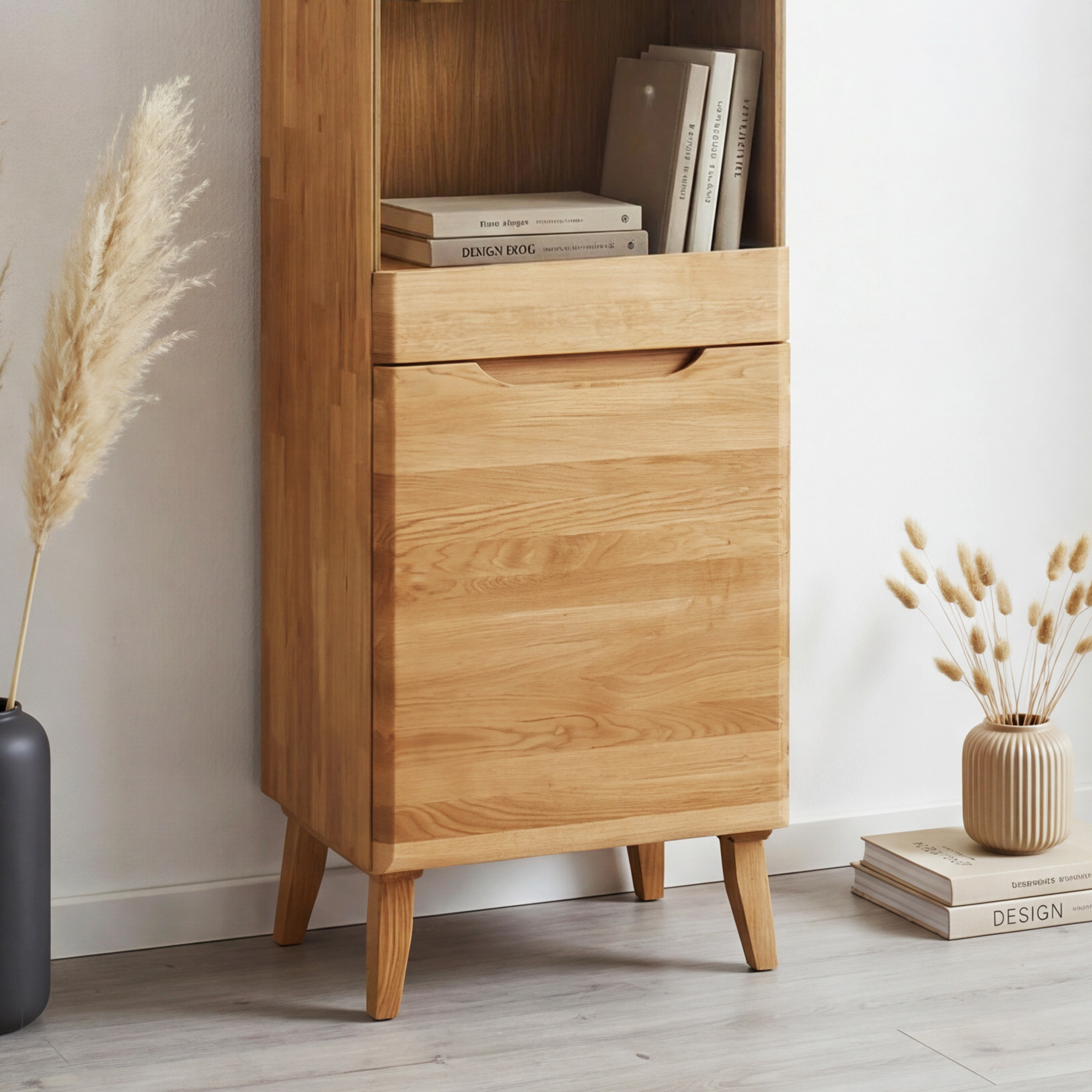 Die Vitrine ist durchdacht in zwei Bereiche unterteilt – der obere verglaste Teil eignet sich ideal zur Präsentation von Dekorationen, Porzellan, Büchern oder Souvenirs, während der untere geschlossene Teil diskreten Stauraum für Dinge bietet, die Sie zur Hand haben, aber vor Blicken verborgen halten möchten. Ein besonderes Designelement sind die eingefrästen Griffe direkt im Holz, die den Bedarf an traditionellen Griffen eliminieren und dem Möbelstück ein sauberes, einheitliches Aussehen verleihen. Mit den Maßen Breite 53 cm, Höhe 197 cm und Tiefe 40 cm ist die Vitrine aufgrund ihrer schlanken Form auch ideal für kleinere Räume, Flure oder schmale Wände geeignet. Das Möbelstück wird bereits komplett montiert geliefert – der Kunde befestigt vor Ort nur die Füße, was die Handhabung vereinfacht und Zeit spart.