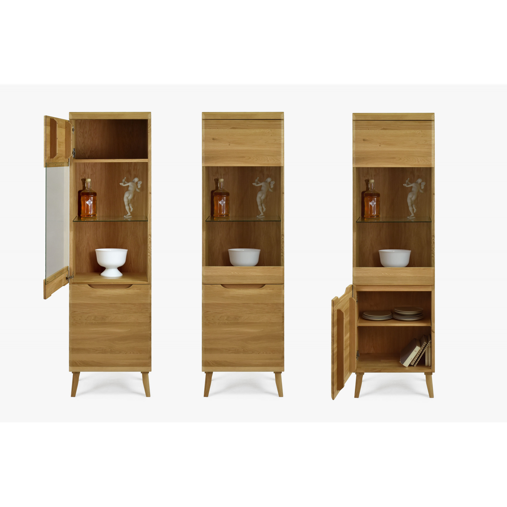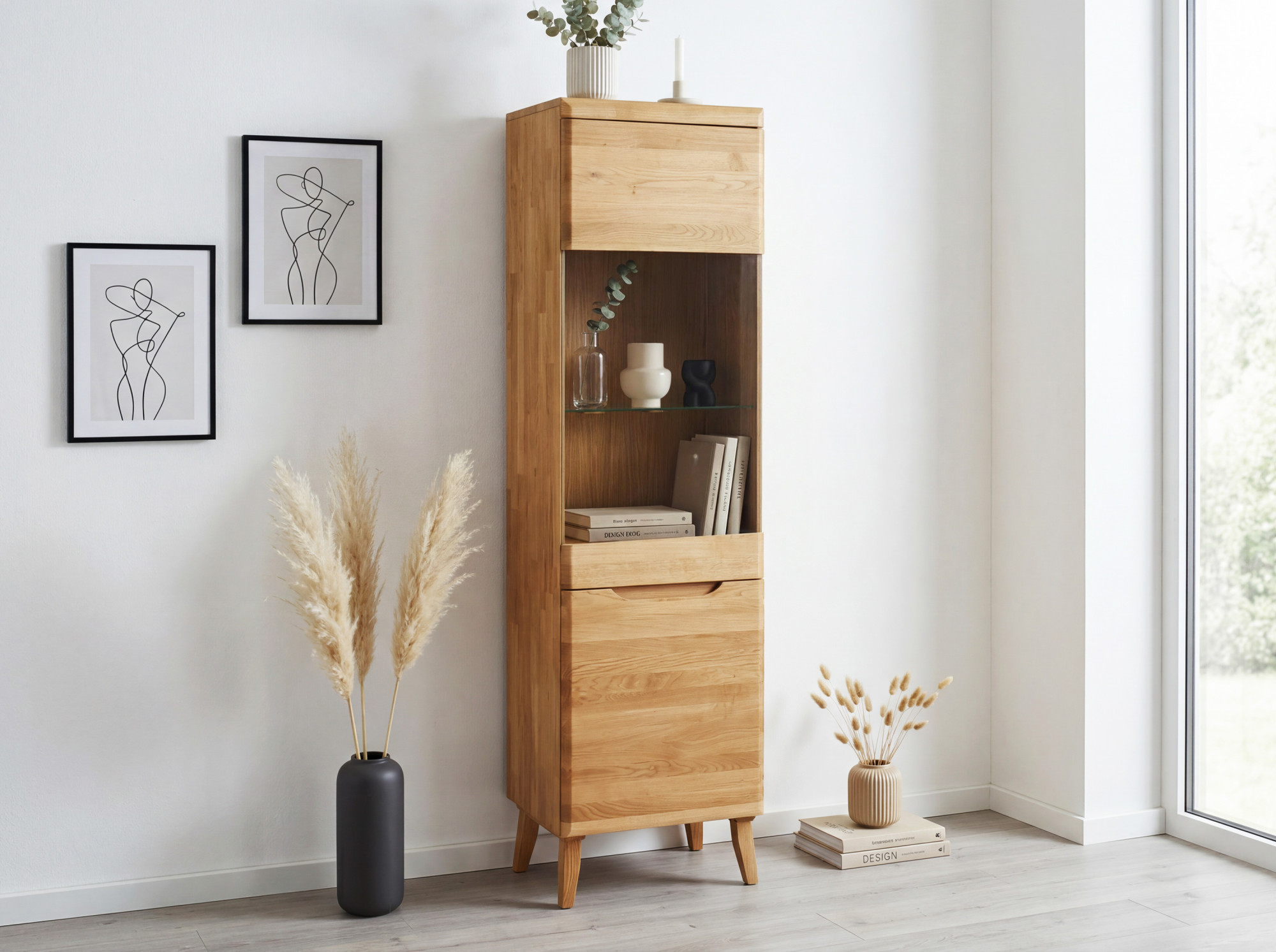 Hohe Eichenvitrine Praha auf Füßen – massives skandinavisches Design 53 x 197 cm