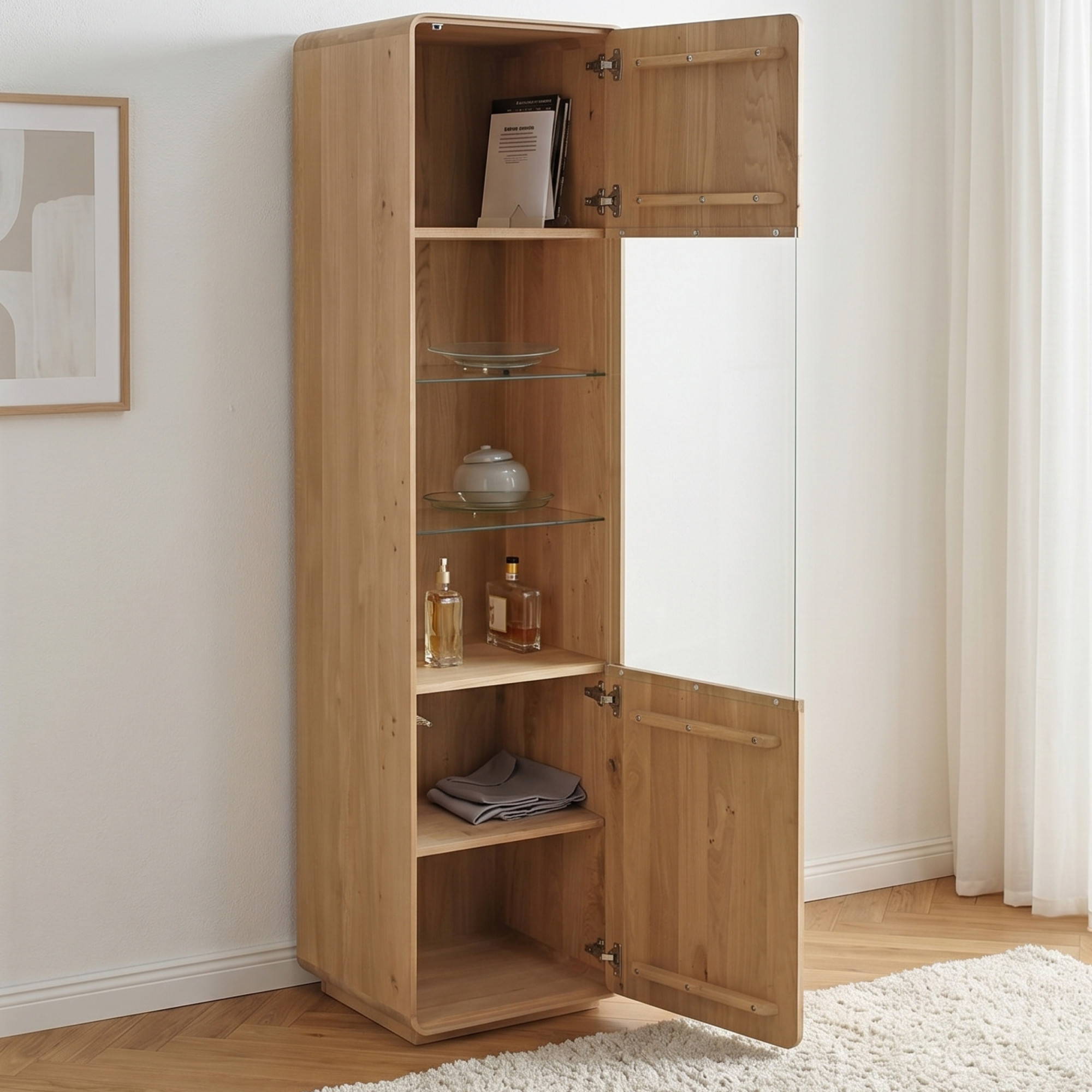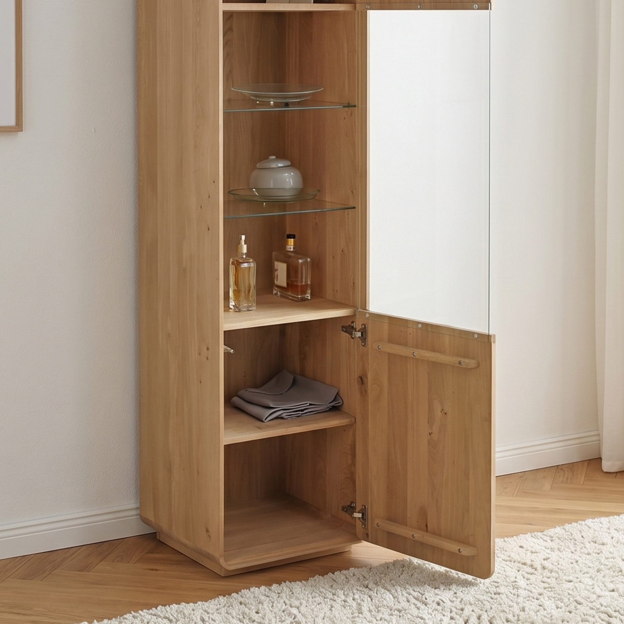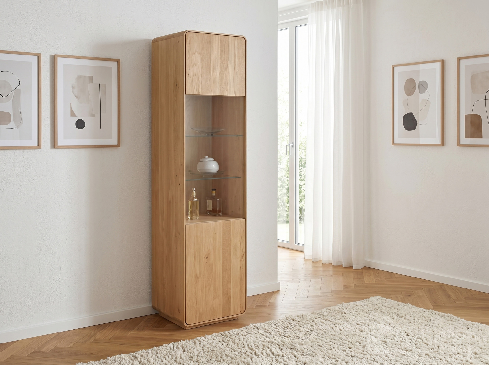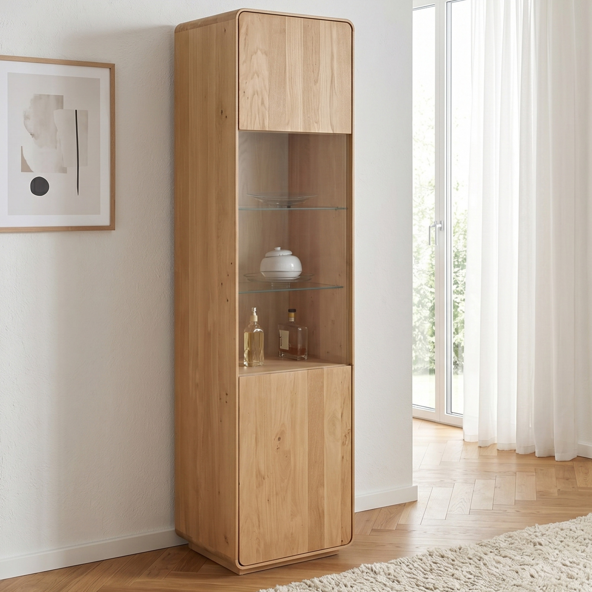 Wir präsentieren Ihnen eine einzigartige einflügelige Eichenvitrine aus unserer renommierten Avalon Kollektion, hergestellt aus hochwertigem Eichenholz, das nicht nur Langlebigkeit und Stabilität bietet, sondern auch Ihrem Interieur eine warme und natürliche Ausstrahlung verleiht. Diese Vitrine, mit natürlichem Öl in der Farbe weiß geölte Eiche behandelt, ist die perfekte Verbindung von modernem Design und Funktionalität und bietet idealen Platz zur Präsentation Ihrer wertvollsten Stücke oder Bücher. Das FSC-Zertifikat garantiert, dass das Holz verantwortungsvoll und nachhaltig gewonnen wurde, was unserem Engagement für den Umweltschutz entspricht. Die Vitrinentür ist mit einem tip on-System für einfaches Öffnen per Druck ausgestattet, was das minimalistische und benutzerfreundliche Design unterstreicht. Außerdem bringt die Vitrine dank der abgerundeten Ecken Sanftheit und Eleganz in jeden Raum, während die Montage maximal vereinfacht ist – die Vitrine wird komplett montiert geliefert.