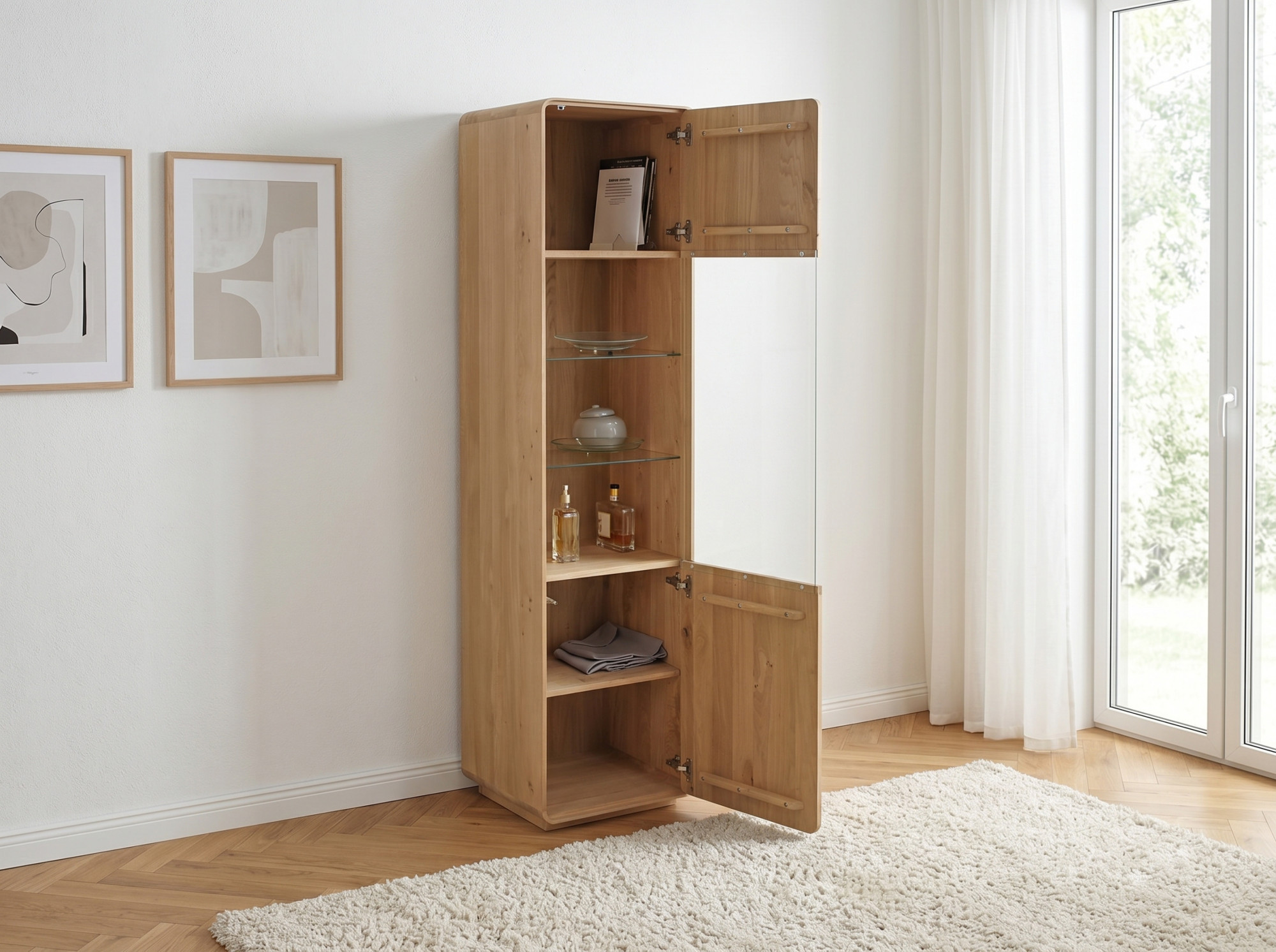 - Besteht das Möbelstück aus Eichenholz? Ja, diese Vitrine ist aus hochwertigem Eichenholz mit FSC-Zertifikat gefertigt, was Nachhaltigkeit und Materialqualität garantiert.