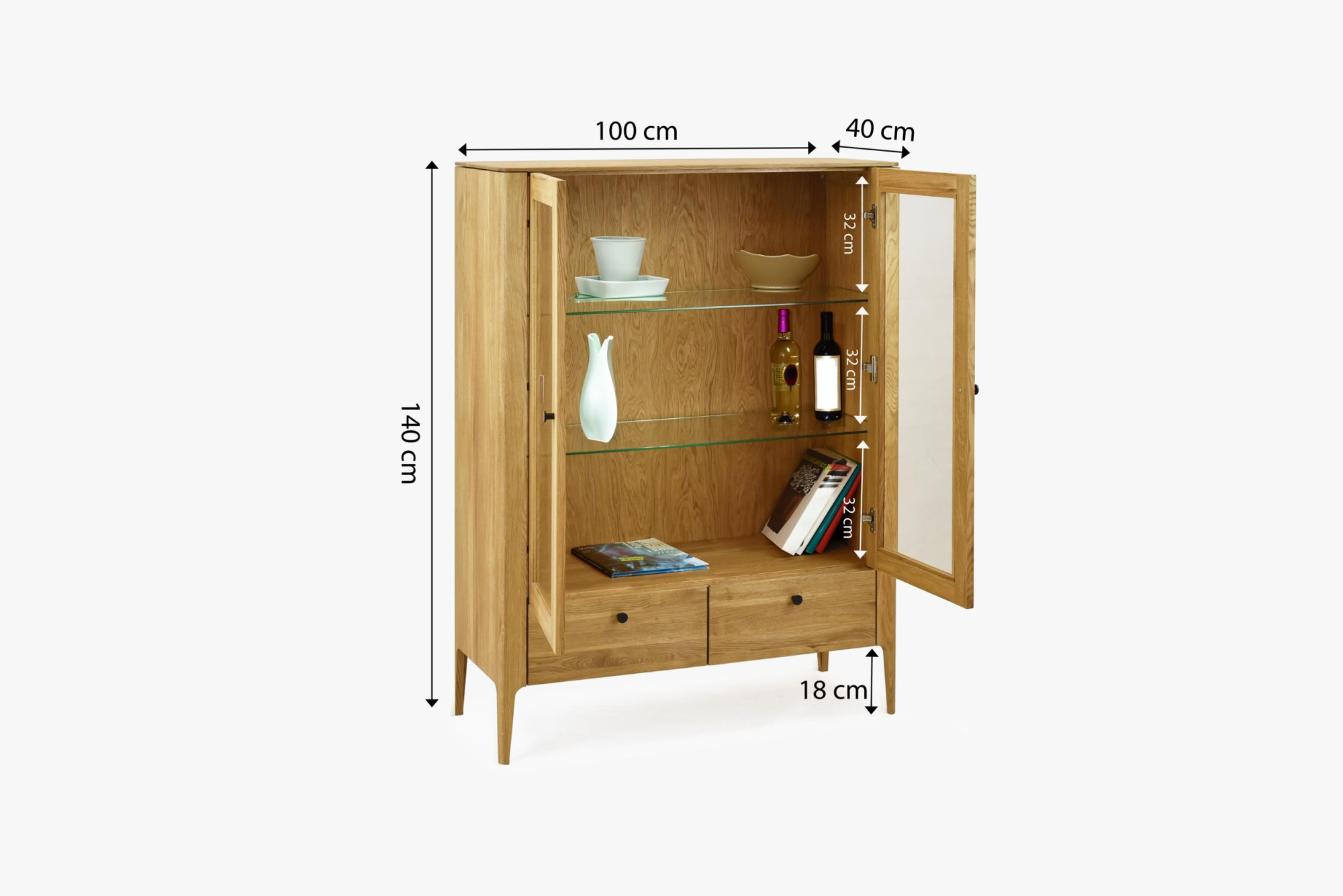 - Praktische Anordnung: Zwei verglaste Türen und zwei geräumige Schubladen für ausreichend Stauraum.