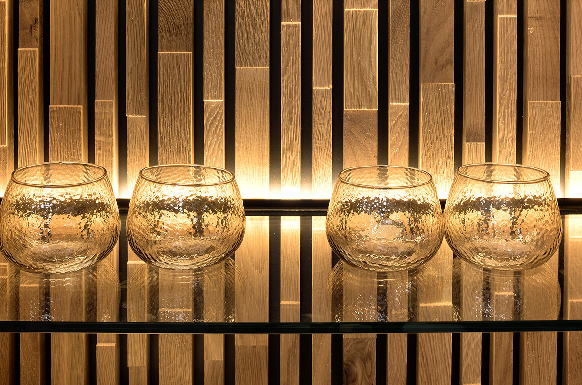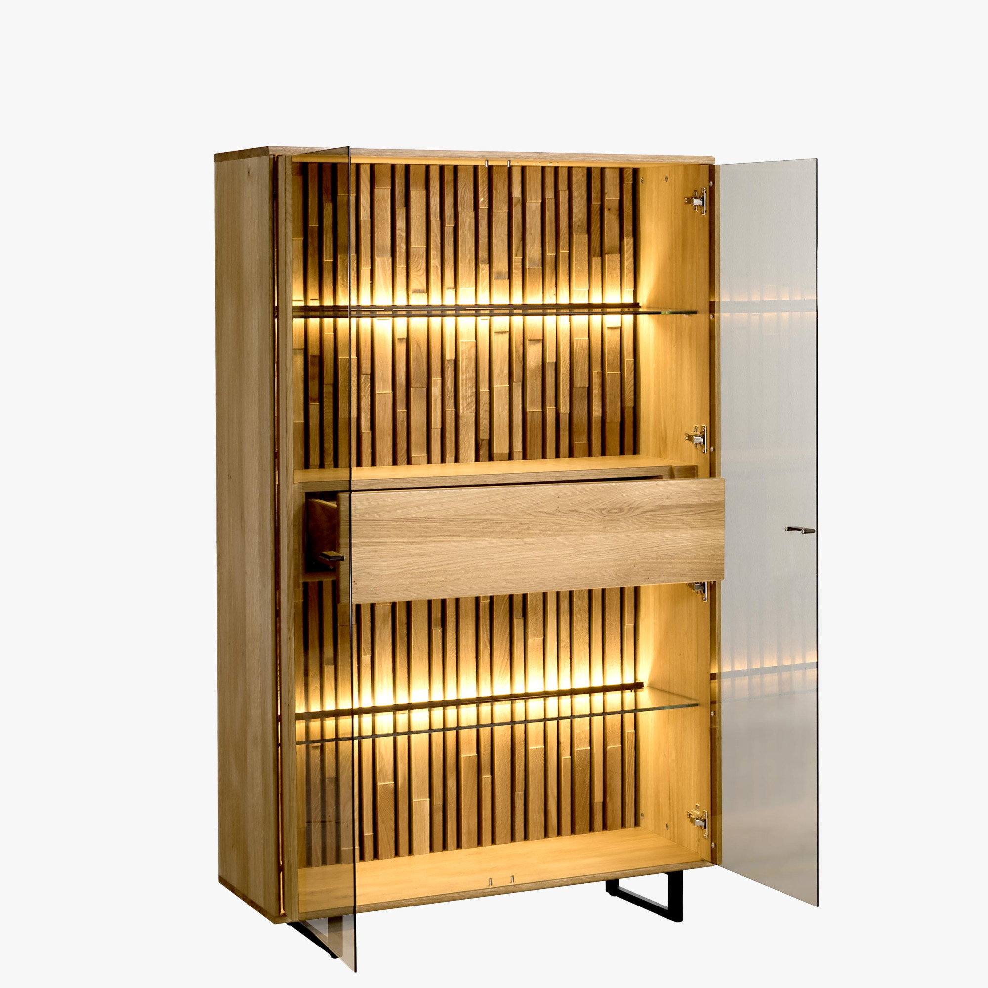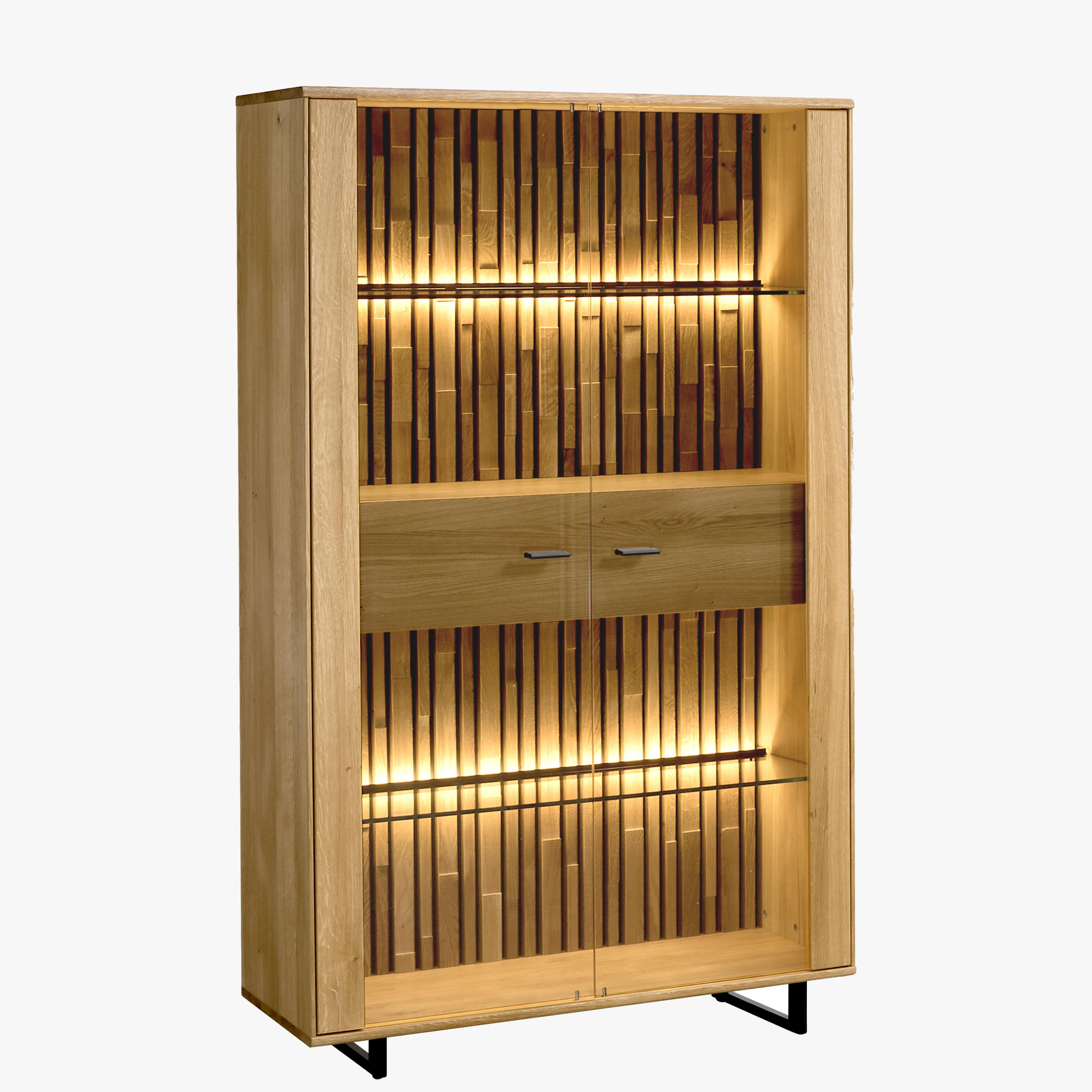 - Material: Die Frontteile der Vitrine sind aus hochwertigem massivem Eichenholz gefertigt, das geschliffen wurde, um die natürliche Holzstruktur zu betonen. Die oberen und unteren Teile der Vitrine sowie das Rückenteil im Parkettmuster sind ebenfalls aus massivem Holz. Diese Parkette haben unterschiedliche Höhen, was ein einzigartiges und individuelles Aussehen schafft.