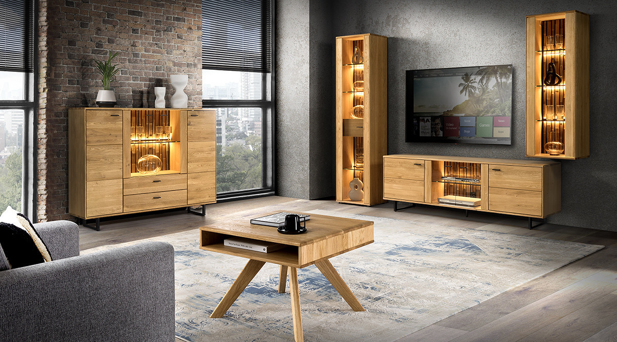 Luxuriöse Möbel für das Wohnzimmer in hochwertiger massiver Eichen-Ausführung in Kombination mit Eichenfurnier, wobei die Hauptsichtteile massiv sind. Erhältlich in natürlichem honigfarbenem gebürstetem Eichenfinish. Die Möbel werden montiert geliefert (stabiler, fester, ohne sichtbare und die Ästhetik beeinträchtigende Schrauben wie bei einem Puzzle) und die Schubladen und Türen sind mit einem Dämpfungssystem für sanftes und leises Schließen ausgestattet. Die Regale in den verglasten Teilen sind aus Glas. Elegante Eichen-Wohnzimmerkombination aus massivem Holz und natürlichem Furnier. Modernes industrielles Design mit Parkettmuster und metallischen Füßen - das sind die Hauptmerkmale der Eichenmöbel Tramontino. Die Rückseiten der verglasten Türen sind mit einem speziellen Design aus zusammengesetzten Parkettplatten gefertigt, siehe Foto. Die Möbel sind mit natürlichem Wachs und Öl der deutschen Marke Livos behandelt.