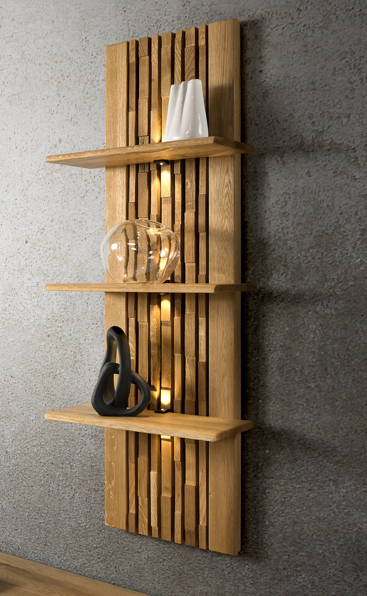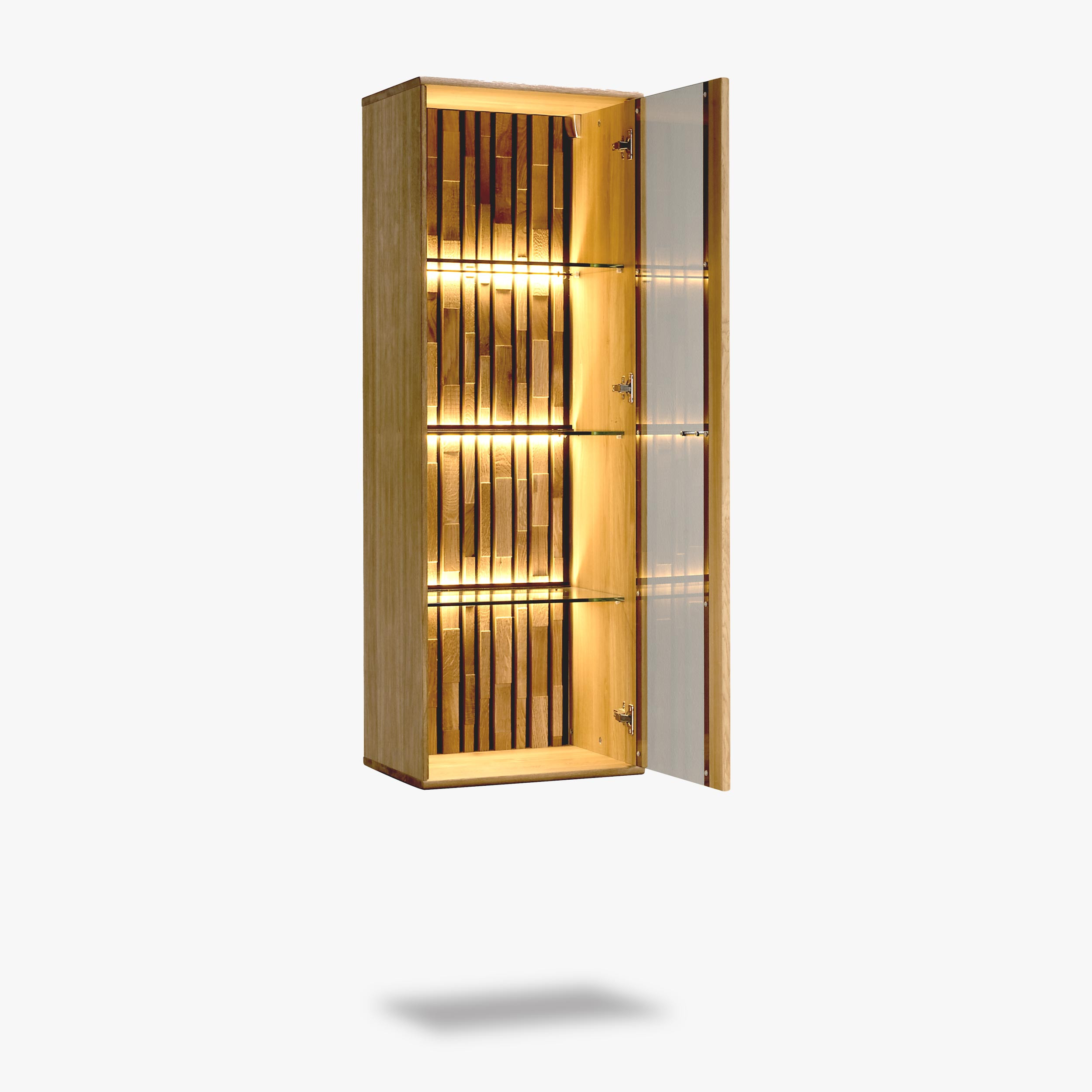 Diese elegante Wandvitrine aus massivem Eichenholz und Eichenfurnier ist die perfekte Ergänzung für jedes Interieur. Dank der integrierten Beleuchtung verleiht sie dem Raum ein modernes Aussehen und schafft eine angenehme Atmosphäre. Dieser Schrank ist die ideale Wahl für das Wohnzimmer, das Esszimmer, das Schlafzimmer oder das Büro, wo er praktischen Stauraum und stilvolles Design bietet.