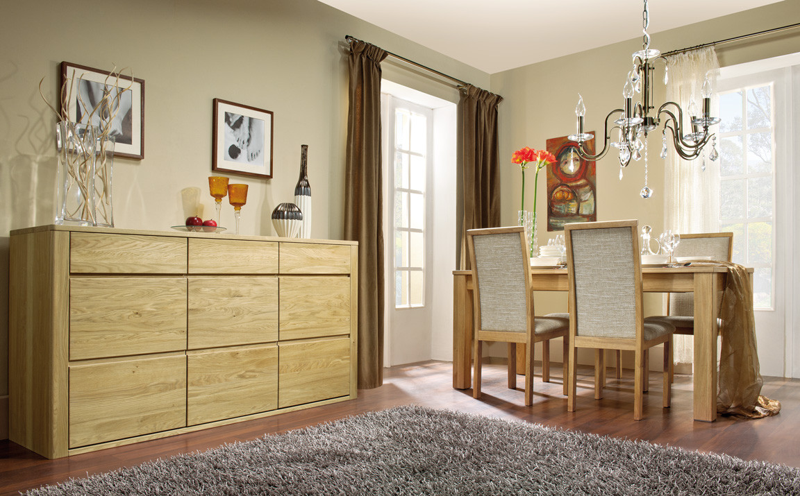 Möbel der Kollektion Nice, wo Sie Kommoden, TV-Tische, Vitrinen finden. Möbel für Ess- und Wohnzimmer in drei Farben erhältlich: naturbelassene Eiche Öl, Eiche Bianco und Eiche in Nussfarbe. Zeigen Sie hier die gesamte Kollektion.