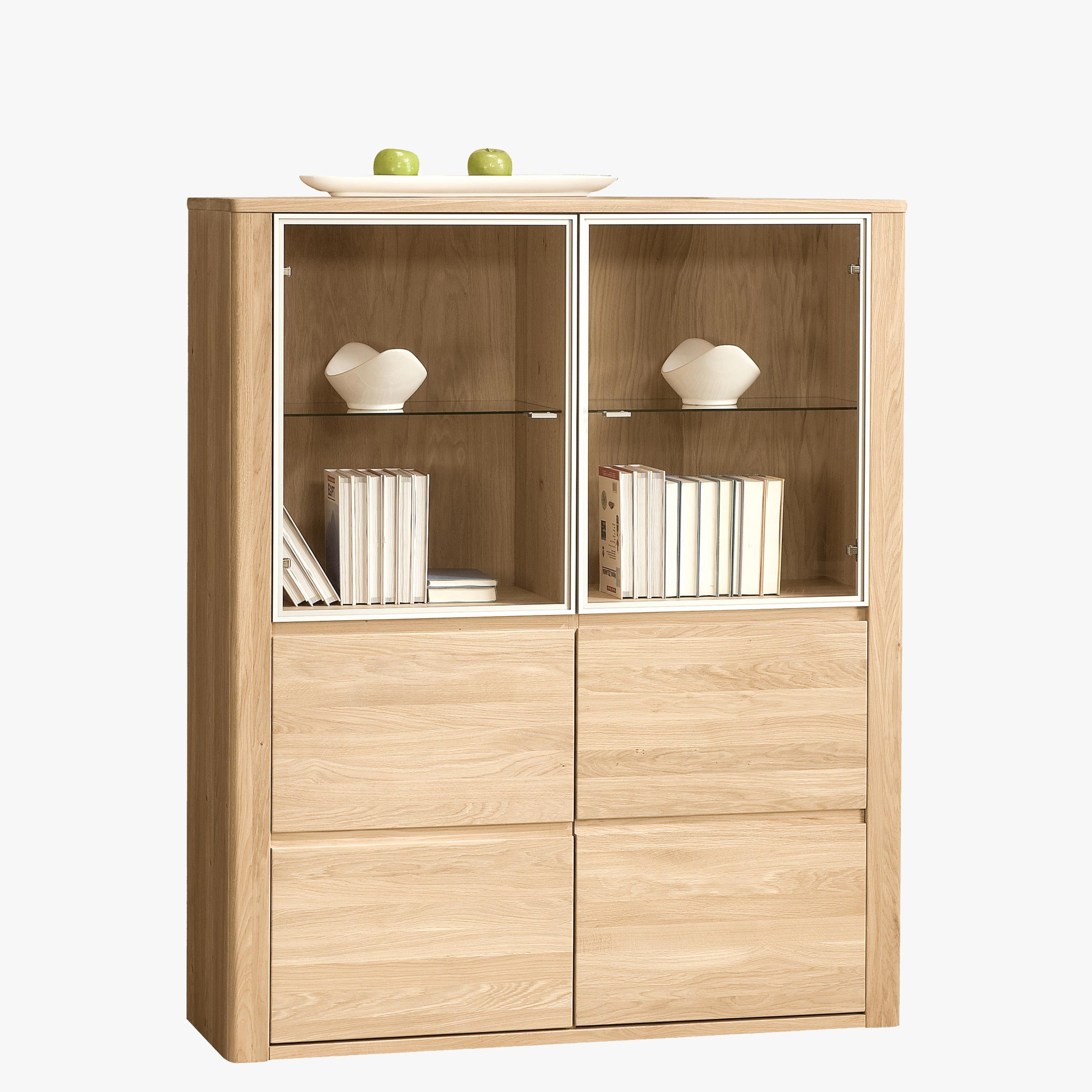 Luxuriöse Vitrine aus massivem Eichenholz in Kombination mit Eichfurnier, die Sie mit ihrer präzise ausgearbeiteten und modernen Gestaltung verzaubert, die zudem mit dem Diamanten des Möbelhandwerks 2013 ausgezeichnet wurde. Die Vitrine ist zur Hälfte mit Glastüren und zur anderen mit Holztüren geteilt.