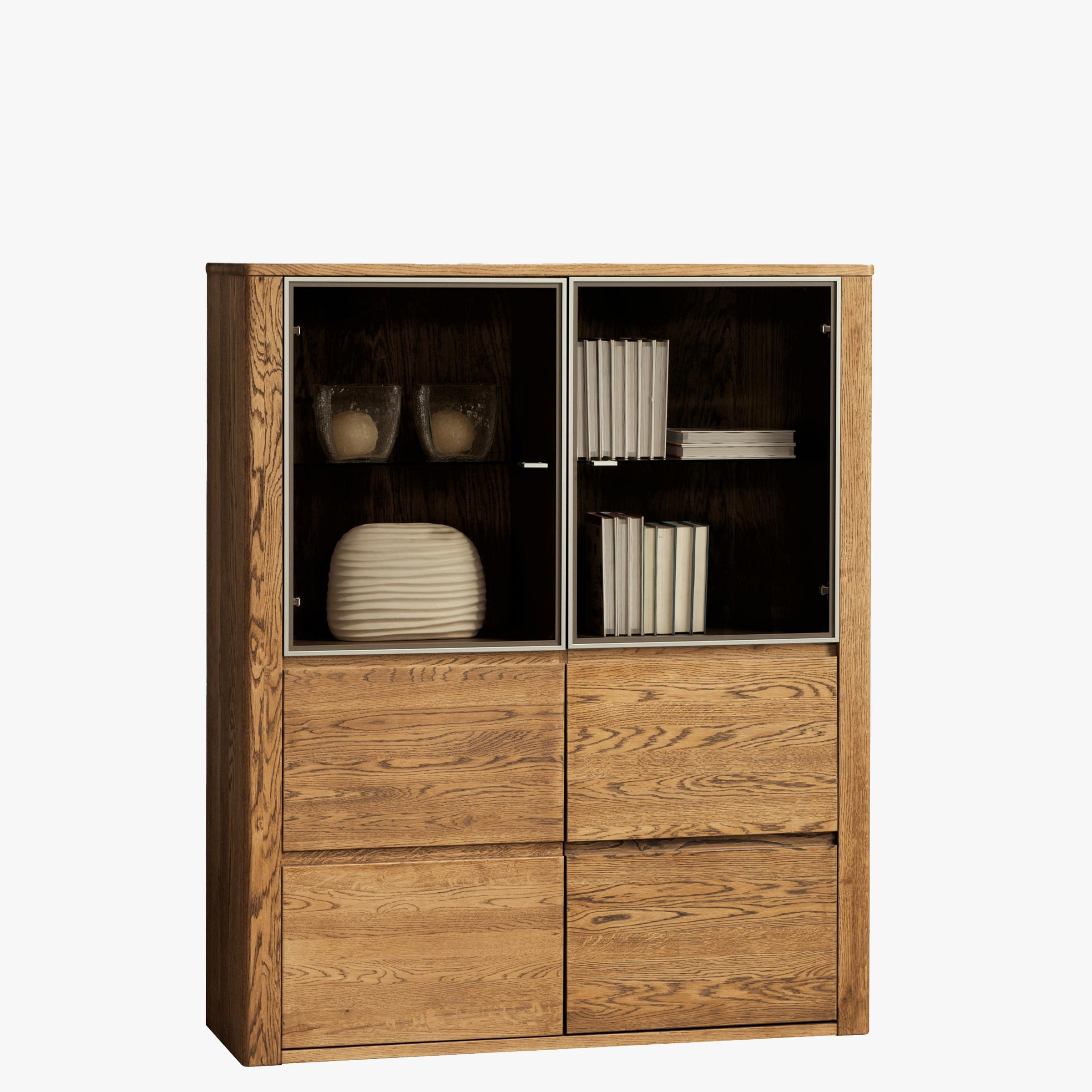 Luxuriöse Vitrine aus massiver Eiche in Kombination mit Eichenfurnier, die Sie mit ihrem präzise ausgearbeiteten und modernen Design verzaubert und zudem mit dem Diamanten des Möbelhandwerks 2013 ausgezeichnet wurde. Die Vitrine ist zur Hälfte mit verglasten Türen und zur anderen Hälfte mit Holztüren ausgestattet.