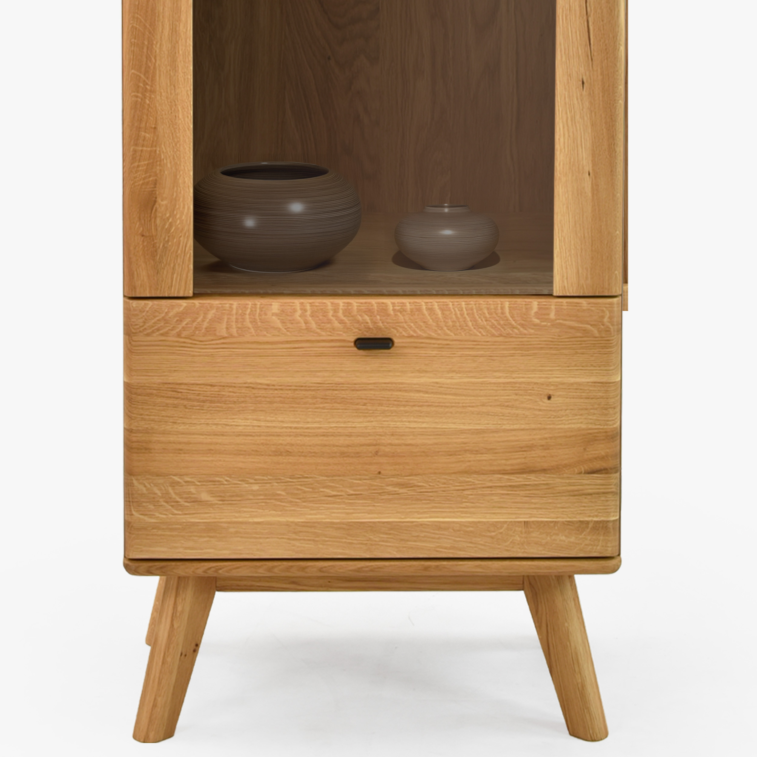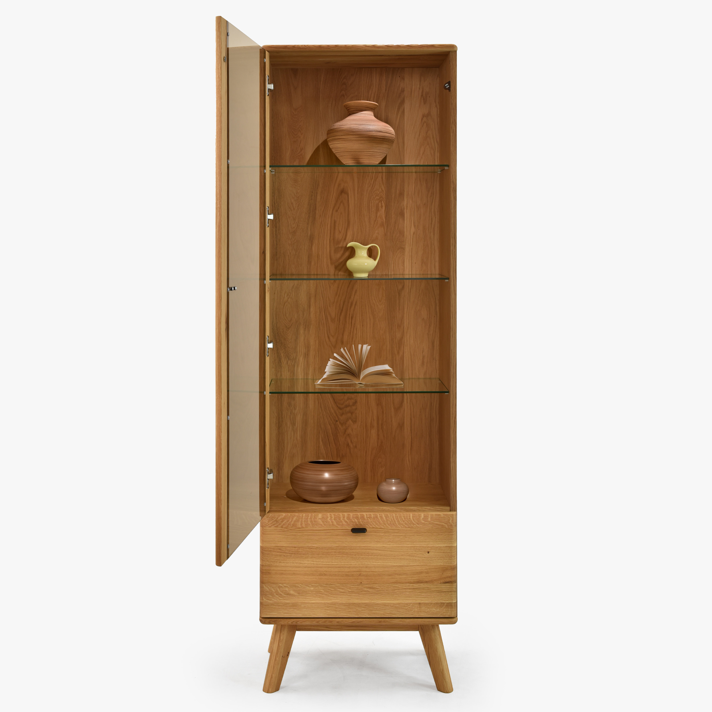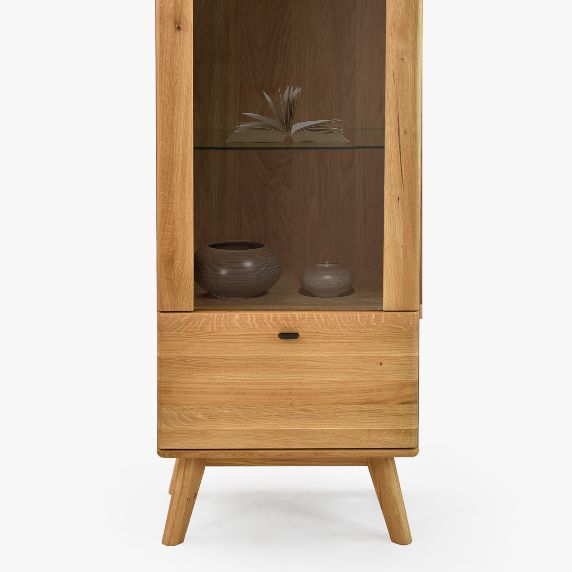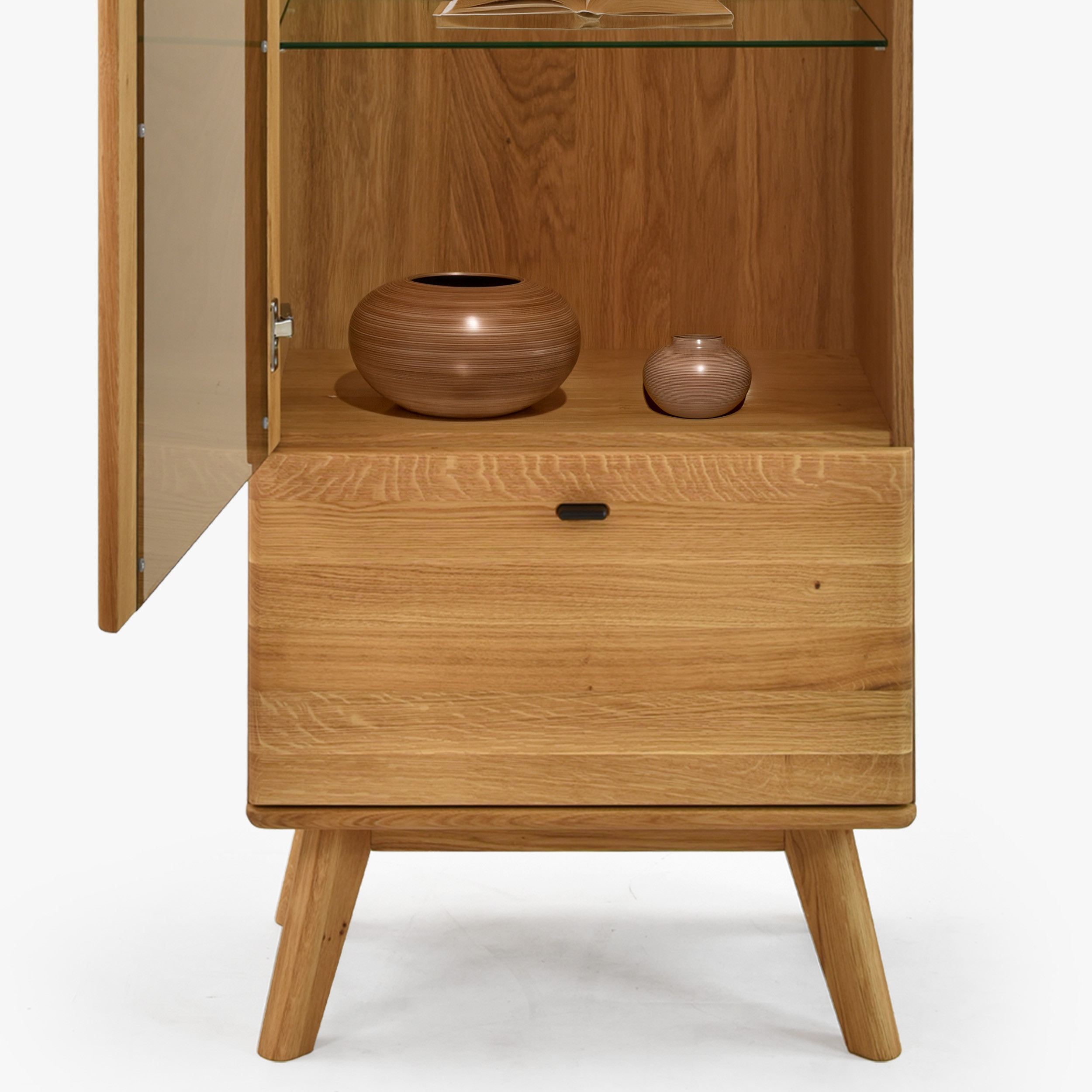Einflügellige massive Vitrine auf Füßen aus der Kollektion Jánošík stellt eine Verbindung aus natürlichem Eichenholz, modernem Design und präziser handwerklicher Verarbeitung dar. Dieses Modell ist die ideale Wahl für jeden, der Qualität von echtem Massivholz schätzt und ein Stück Natur in sein Zuhause bringen möchte. Die Vitrine ist gefertigt aus einer Kombination von massiver Eiche (obere Platte, Frontteile, Füße und Konstruktionselemente) und Premium-Eichenfurnier (Seiten und Korpus), was ein perfektes Aussehen und eine lange Lebensdauer garantiert. Standardmäßig verfügt sie über Türscharniere auf der linken Seite, kann aber dank Vorbereitung leicht auf die rechte Seite umgestellt werden. Im Inneren befinden sich drei Glasböden zur Präsentation von Dekorationen, Porzellan oder Glas sowie unten eine praktische Schublade für Kleinigkeiten.