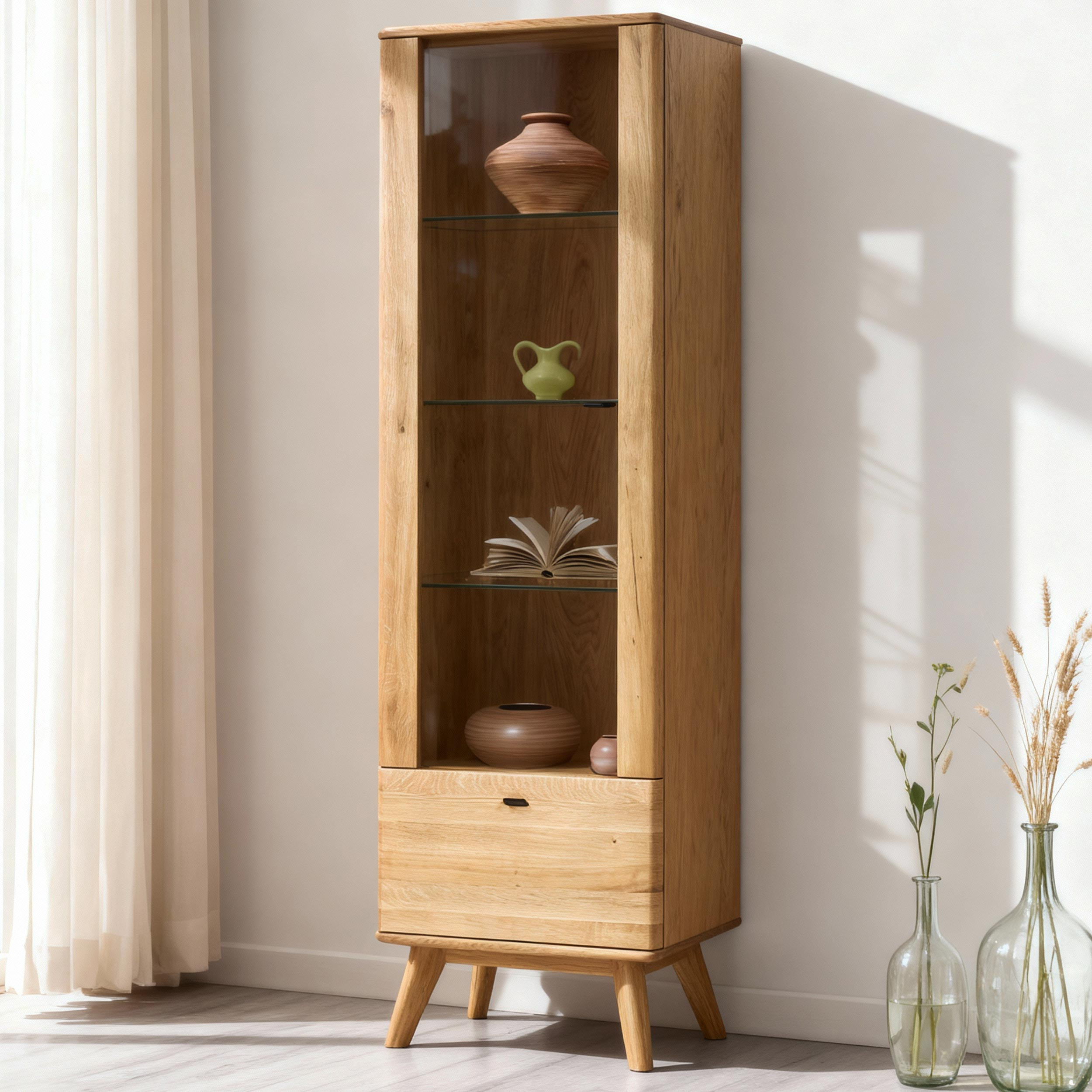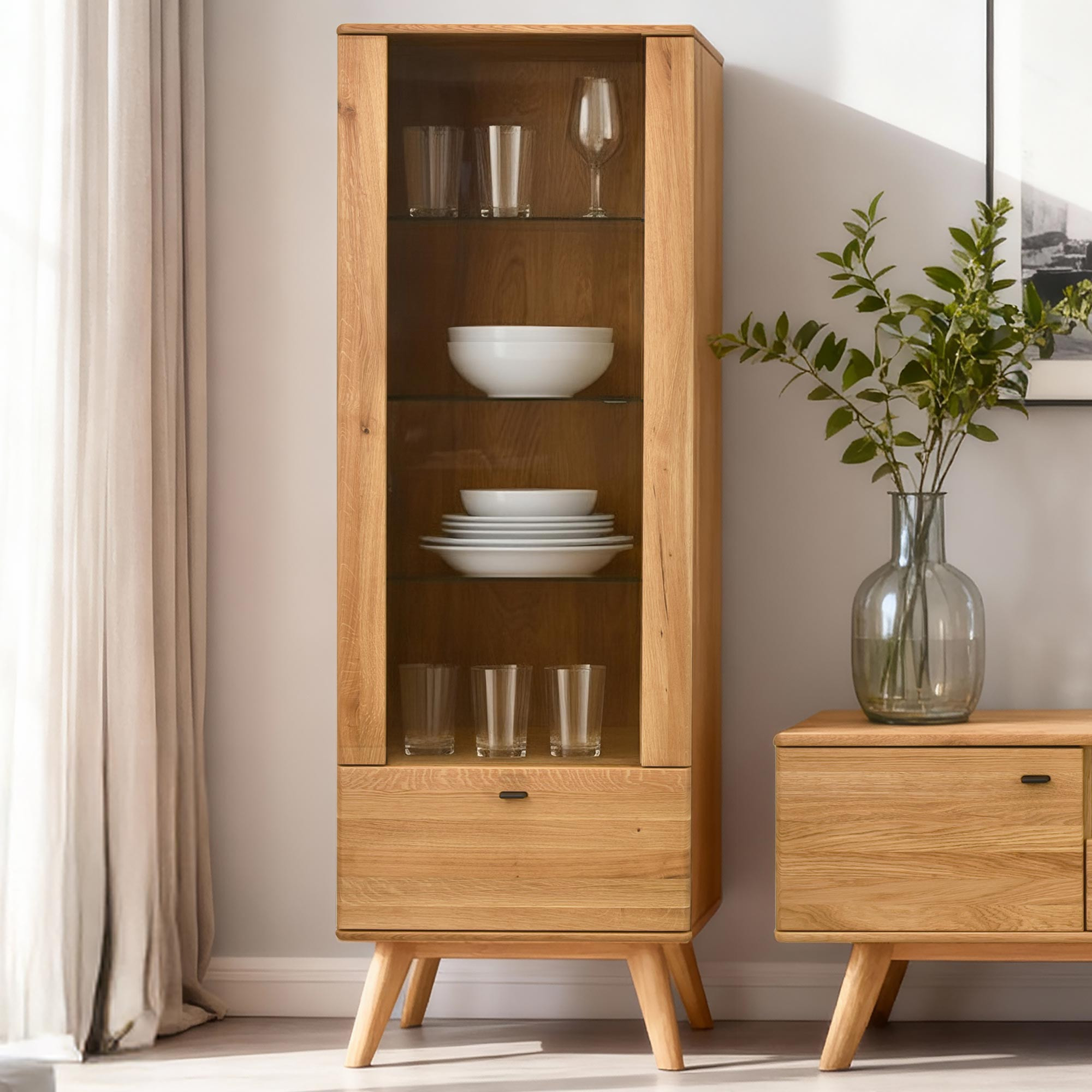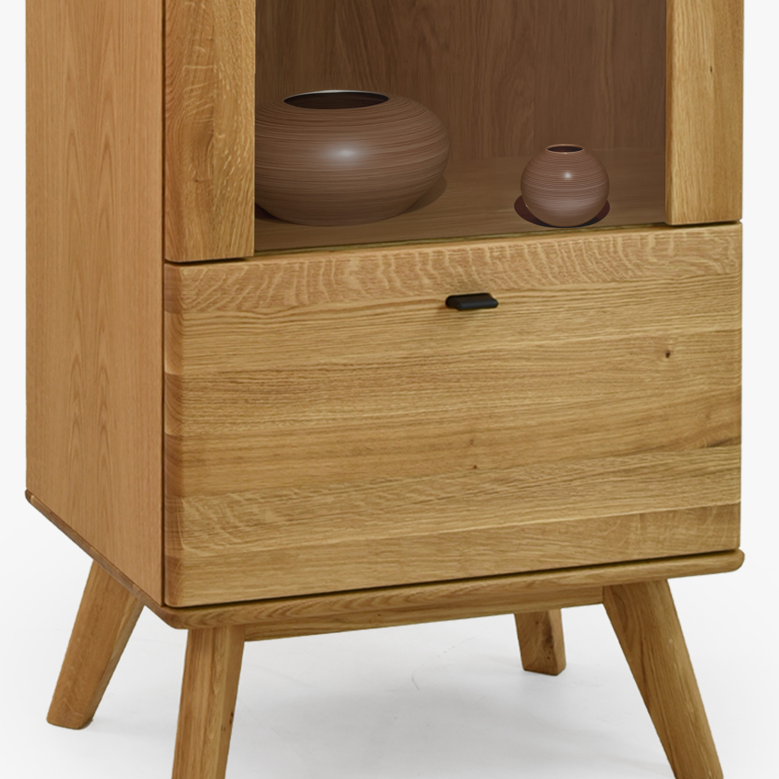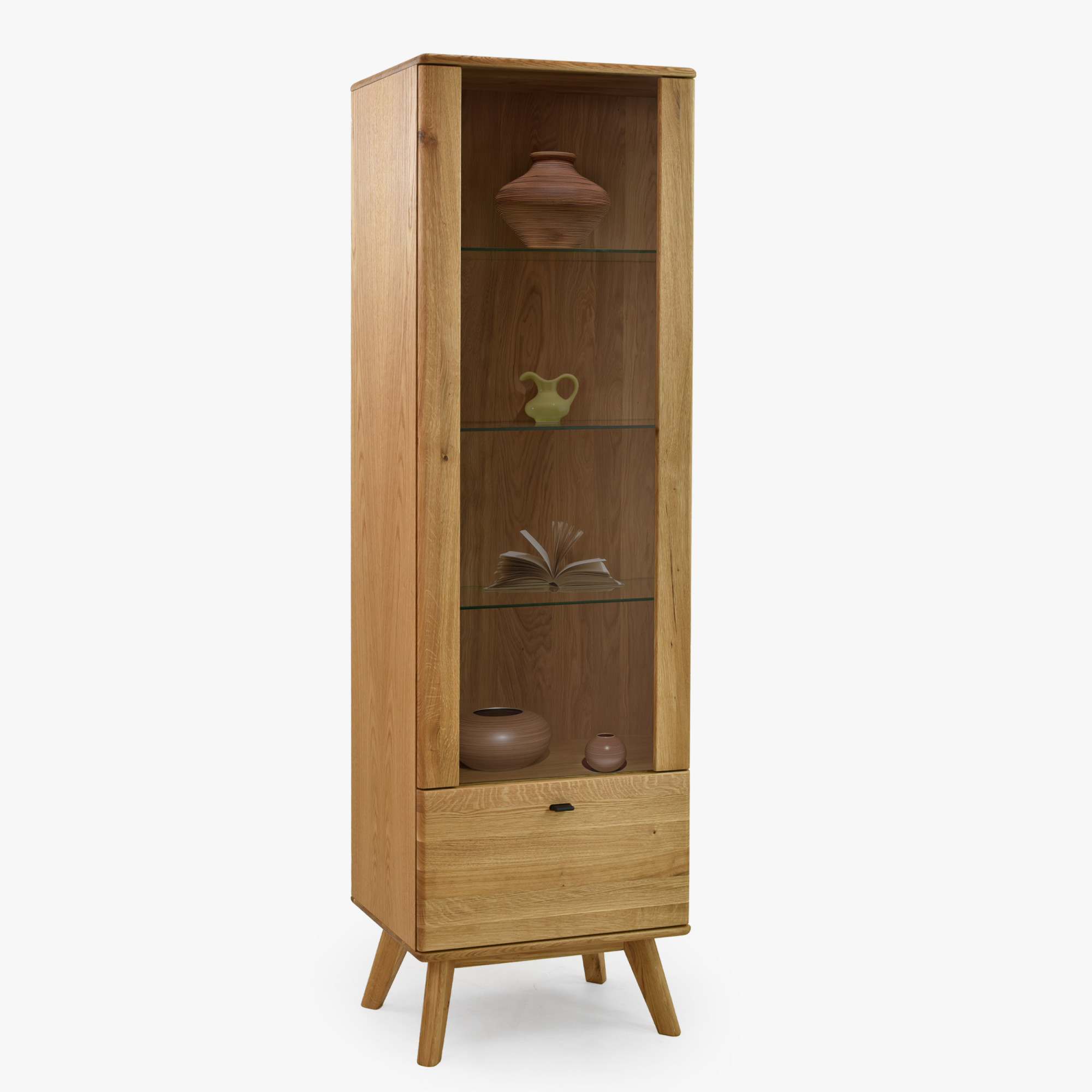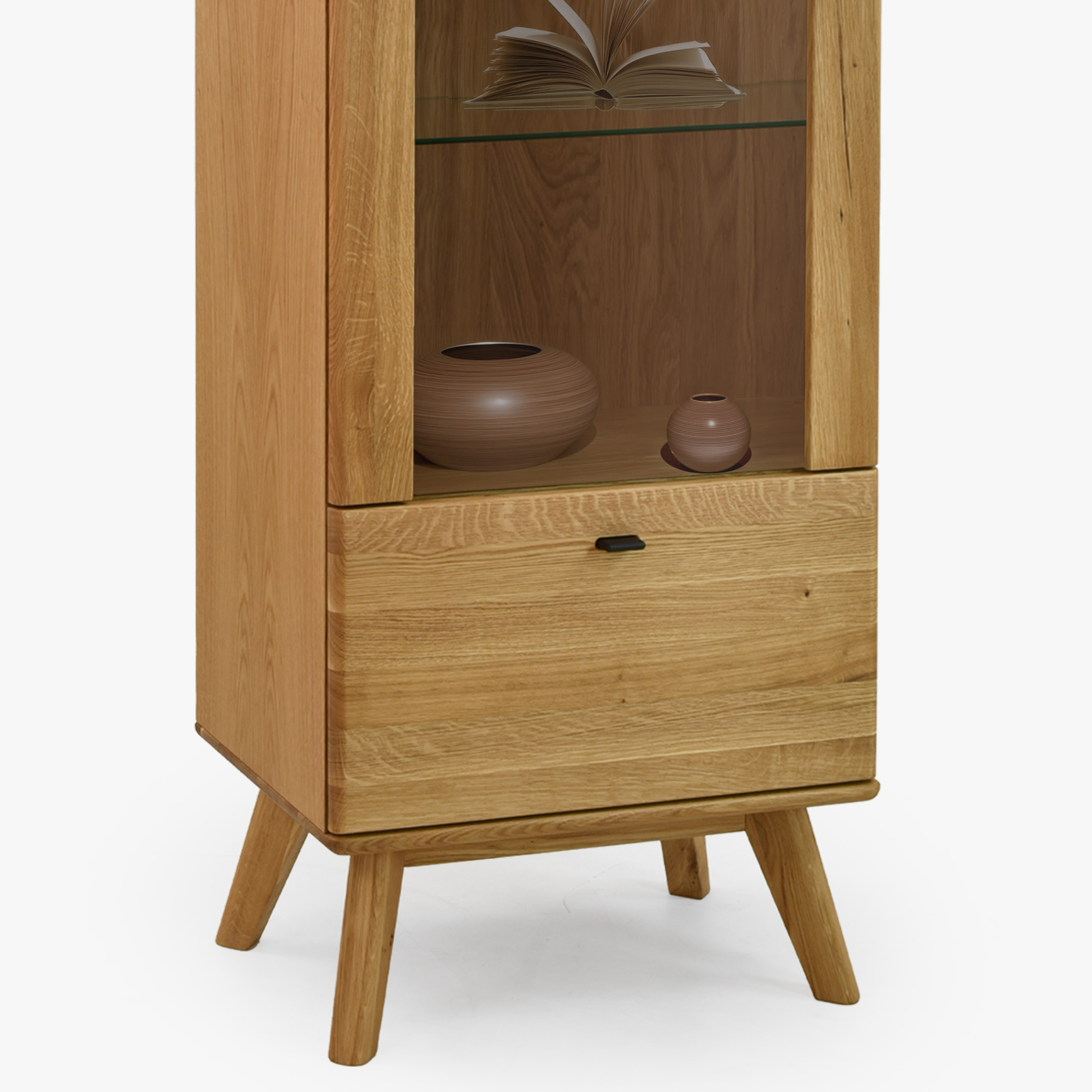 Einflügellige massive Vitrine auf Füßen aus der Kollektion Jánošík stellt eine Verbindung aus natürlichem Eichenholz, modernem Design und präziser handwerklicher Verarbeitung dar. Dieses Modell ist die ideale Wahl für jeden, der Qualität von echtem Massivholz schätzt und ein Stück Natur in sein Zuhause bringen möchte. Die Vitrine ist gefertigt aus einer Kombination von massiver Eiche (obere Platte, Frontteile, Füße und Konstruktionselemente) und Premium-Eichenfurnier (Seiten und Korpus), was ein perfektes Aussehen und eine lange Lebensdauer garantiert. Standardmäßig verfügt sie über Türscharniere auf der linken Seite, kann aber dank Vorbereitung leicht auf die rechte Seite umgestellt werden. Im Inneren befinden sich drei Glasböden zur Präsentation von Dekorationen, Porzellan oder Glas sowie unten eine praktische Schublade für Kleinigkeiten.