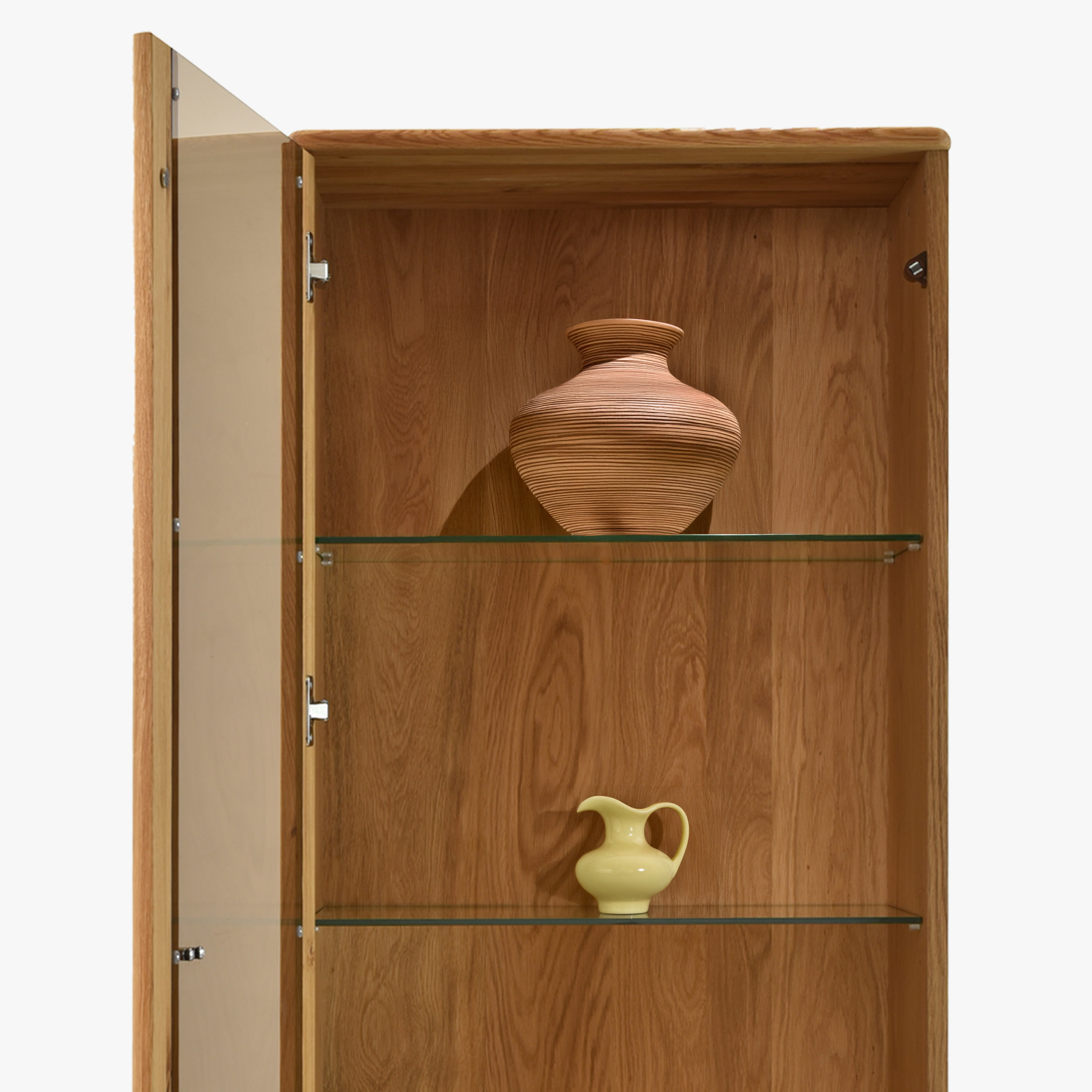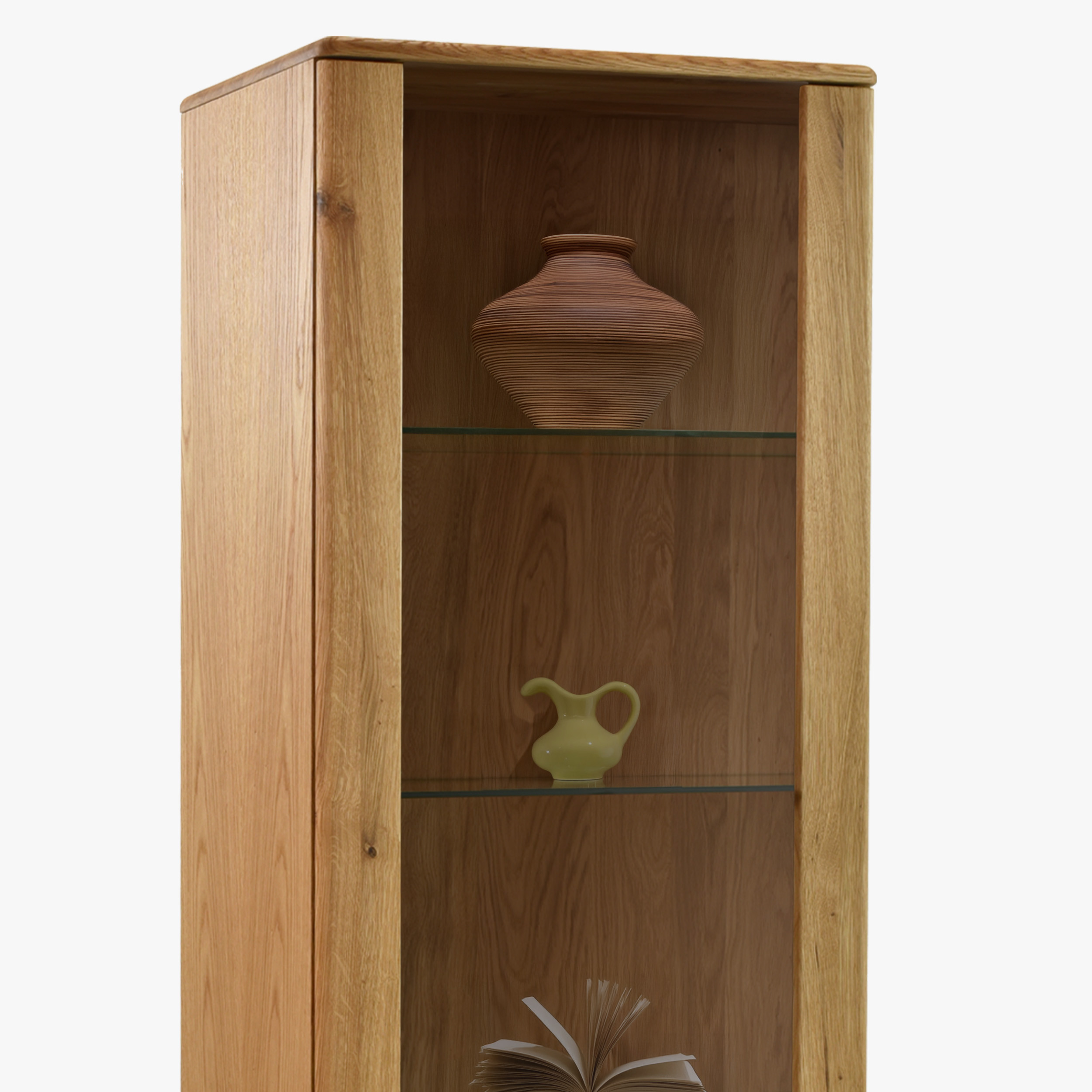 Entdecken Sie die Schönheit und Qualität des natürlichen Materials mit der einflügeligen massiven Vitrine Jánošík, die Ihrem Zuhause Eleganz, Funktionalität und zeitloses Design verleiht. Die Kombination aus massiver Eiche und Eichenfurnier, Glasböden und Soft-Close-System garantiert, dass diese Vitrine nicht nur eine praktische Aufbewahrungslösung, sondern auch eine Zierde für Ihr Interieur ist. Die mit natürlichem Livos-Öl behandelte Oberfläche betont die Holzmaserung und verleiht jedem Stück einen einzigartigen Charakter.